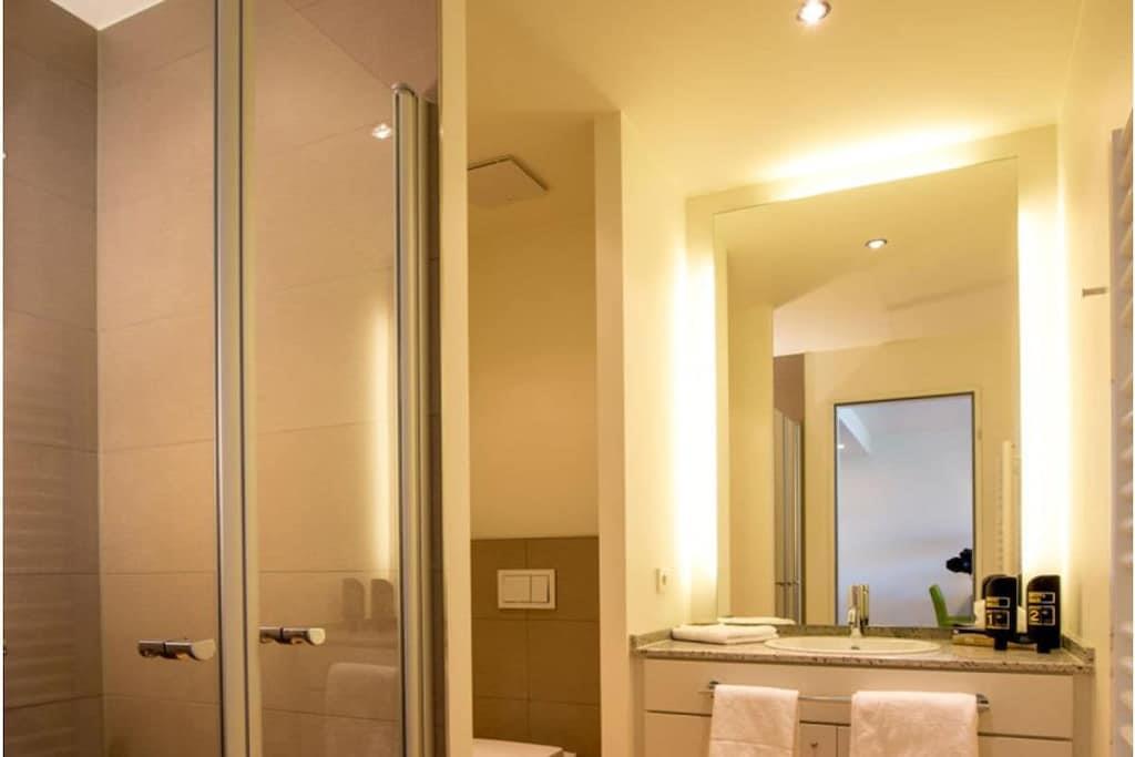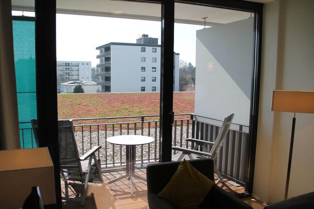 Das lichtdurchflutete Apartment ist ideal für die Belegung mit 2 Erwachsene. Es befindet sich in der 2ten Etage in ruhiger, sonniger Gartenlage. Im Wohnbereich befinden sich eine Couch, Sessel, Couchtisch sowie ein Flatscreen-TV. Die Einbauküche ist mit einem Cerankochfeld, Backofen, Mikrowelle, Geschirrspüler und Kühlschrank mit Gefrierfach sowie Geschirr ausgestattet. Im Schlafbereich finden Sie ein komfortables Doppelbett, einen geräumigen Kleiderschrank und einen Wandsafe. Der Süd-West Balkon ist möbliert und mit einem verschiebbarem farbigen Sonnen-/Windschutz ausgestattet. Die Benutzung der Wellnesslandschaft mit Schwimmbad, Saunalandschaft, Dampfbad, Salz-Tepidarium, Sanarium und Fitness Studio ist inklusive.
