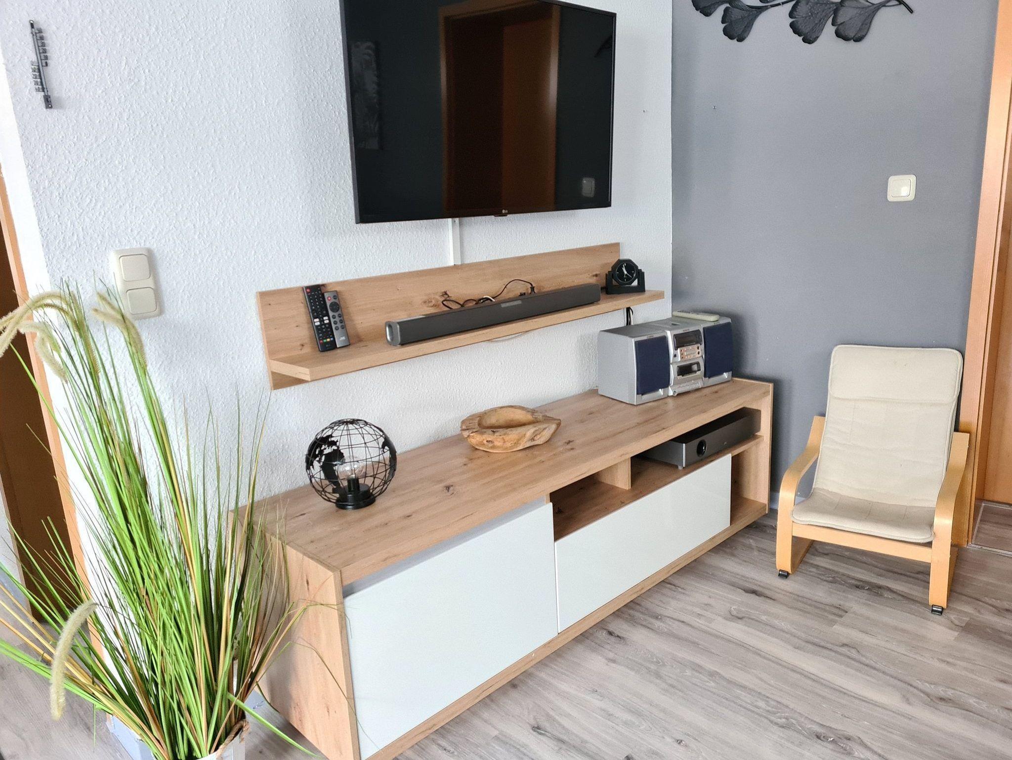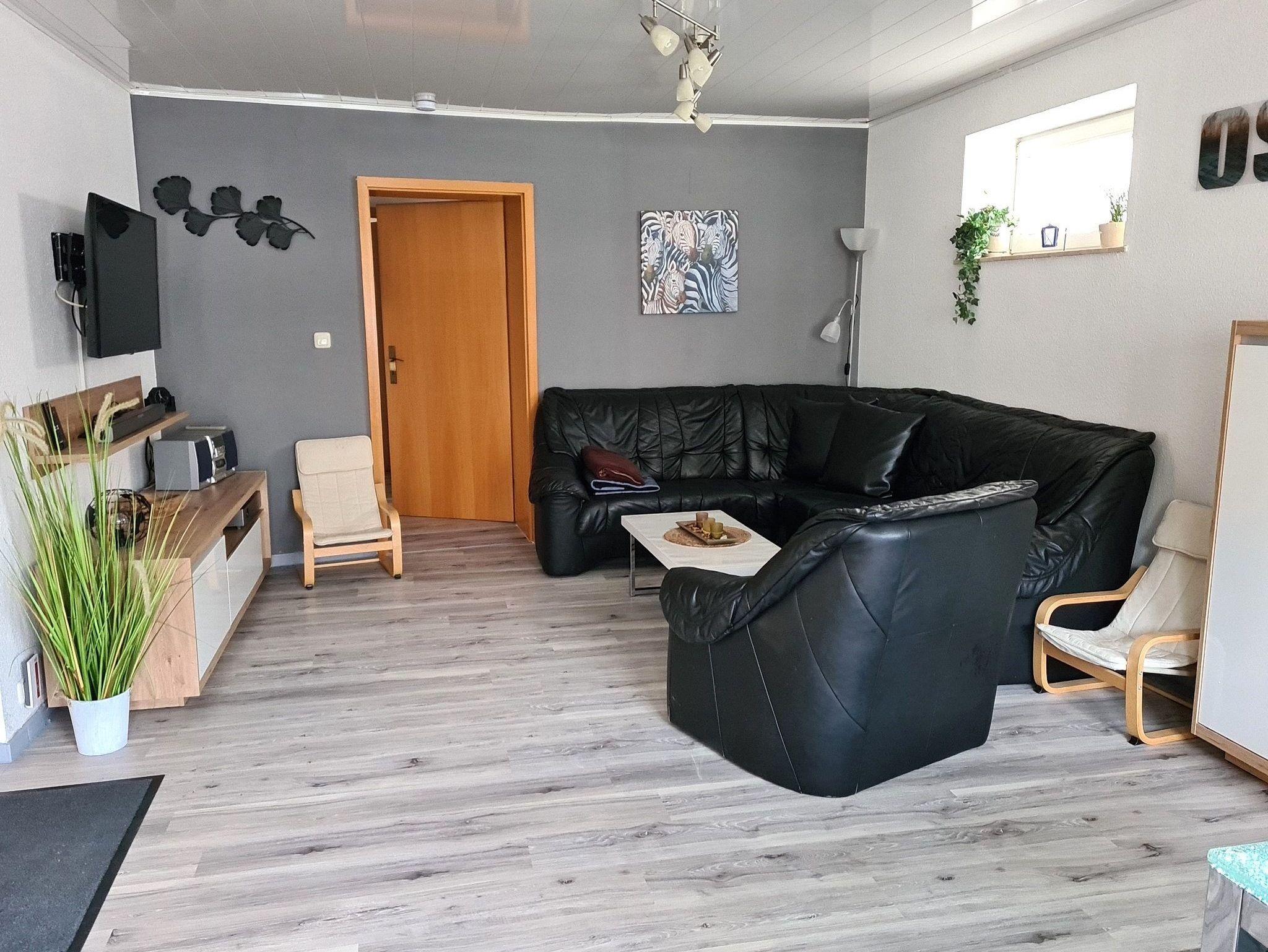 Helles modern eingerichtetes Wohnzimmer mit Vinylboden ausgelegt. Ausgestattet mit einer Schlafcouch, einem Telefon, ein Radio sowie mit Sat-TV.