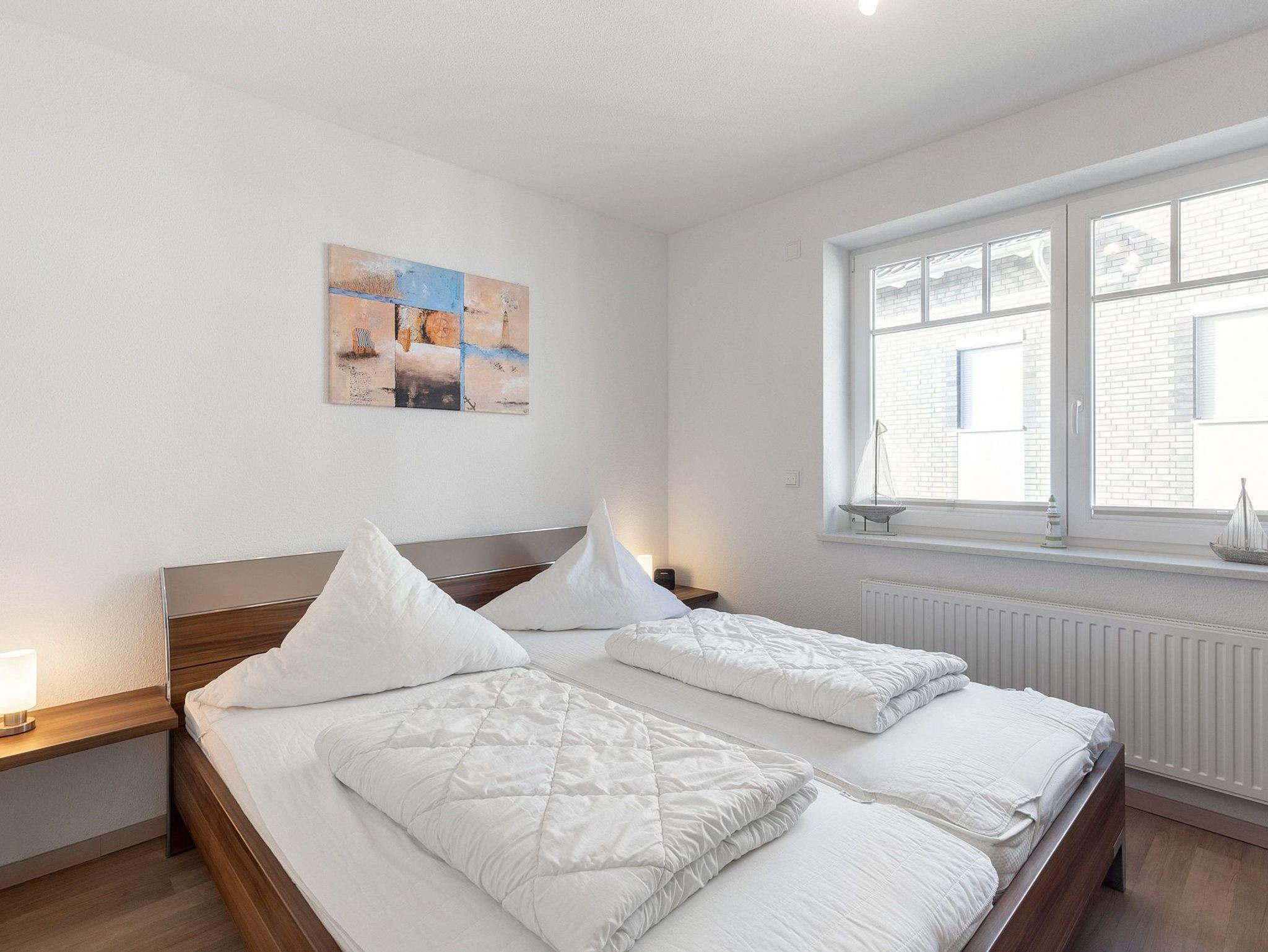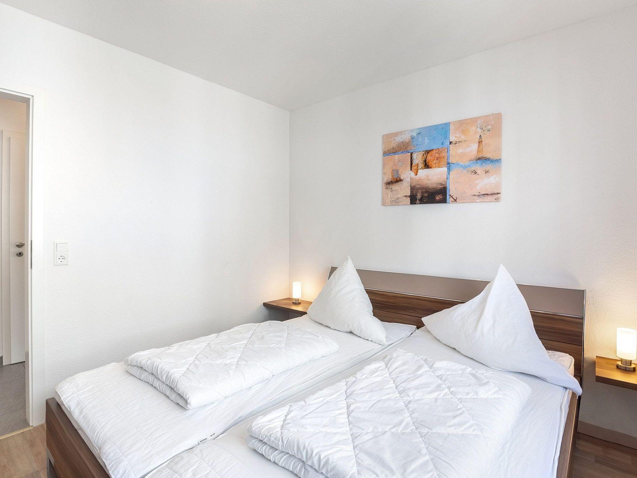 Separates, modern ausgestattetes Schlafzimmer mit einem Doppelbett (2x 90x200cm) und einem Kleiderschrank. Zur Unterhaltung steht ein Flachbildschirm zur Verfügung. Das Fenster lässt sich durch einen Außenrollladen vollständig verdunkeln.