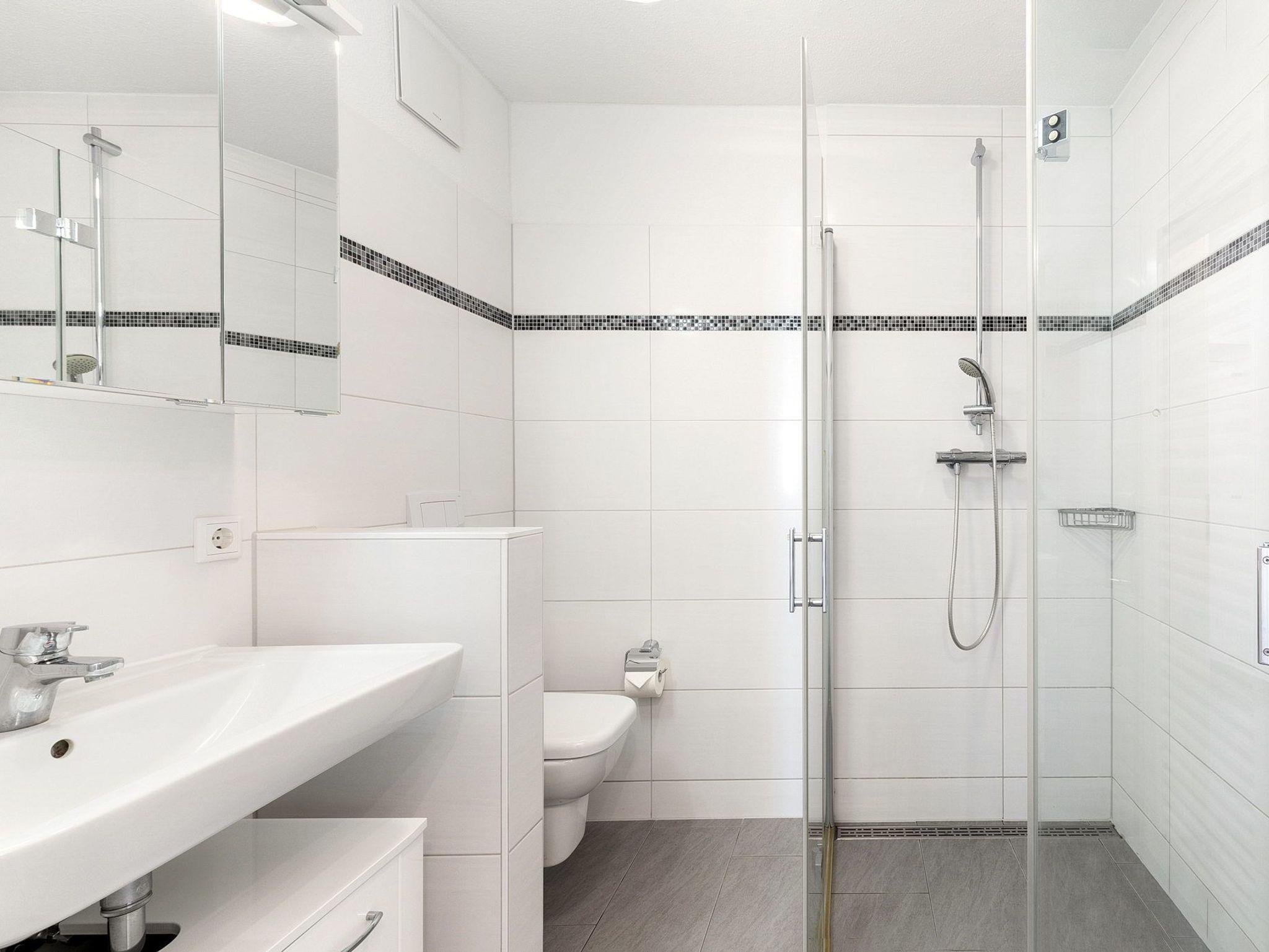 Modernes, gefliestes Bad mit Dusche, WC und Waschbecken. Im Bad und im separaten WC Fußbodenheizung.