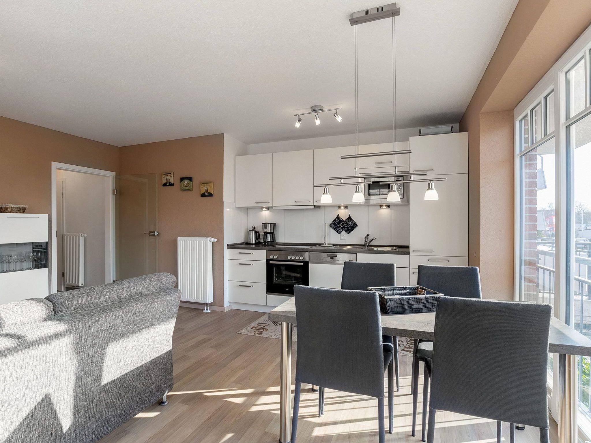 Modernes, helles Wohn- und Esszimmer mit direktem Zugang zum Balkon in westliche Richtung. Das Wohn- und Esszimmer ist mit einem Essplatz für 4 Personen, einer Eckcouch und einem Couchtisch ausgestattet. Zur Unterhaltung stehen ein Flachbildschirm, ein DVD-Player und eine Mini-Stereoanlage zur Verfügung.