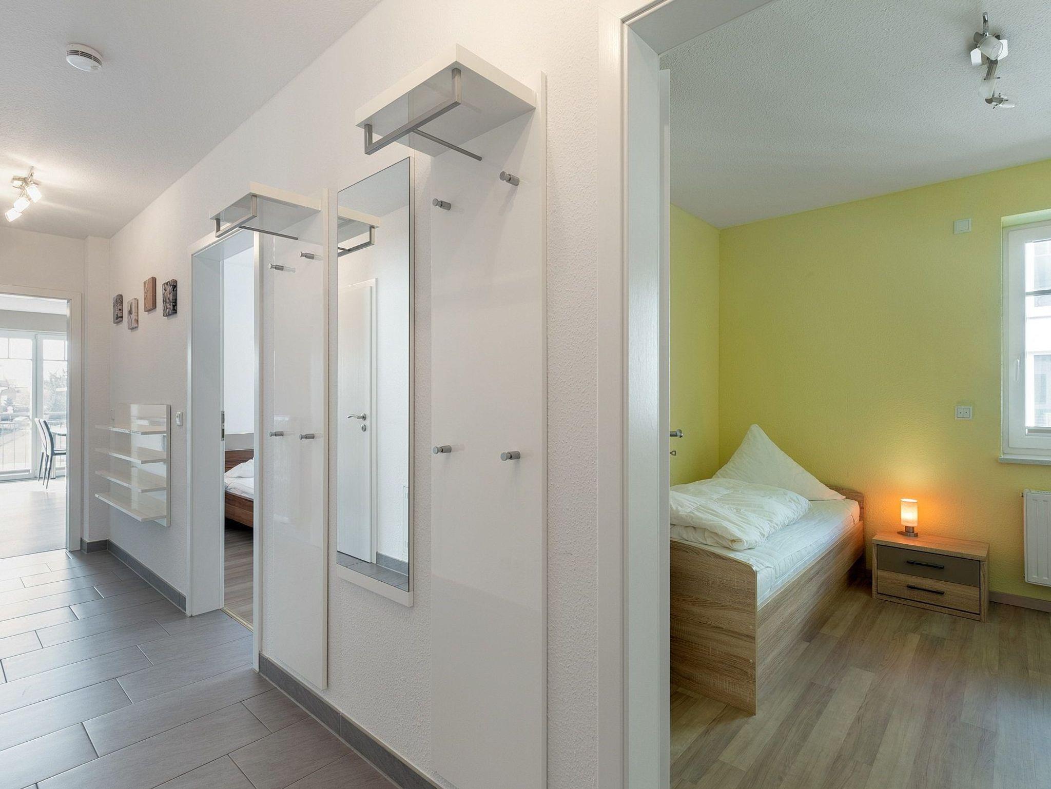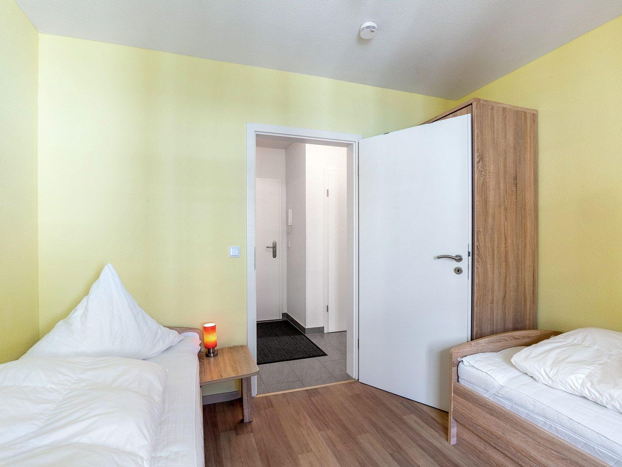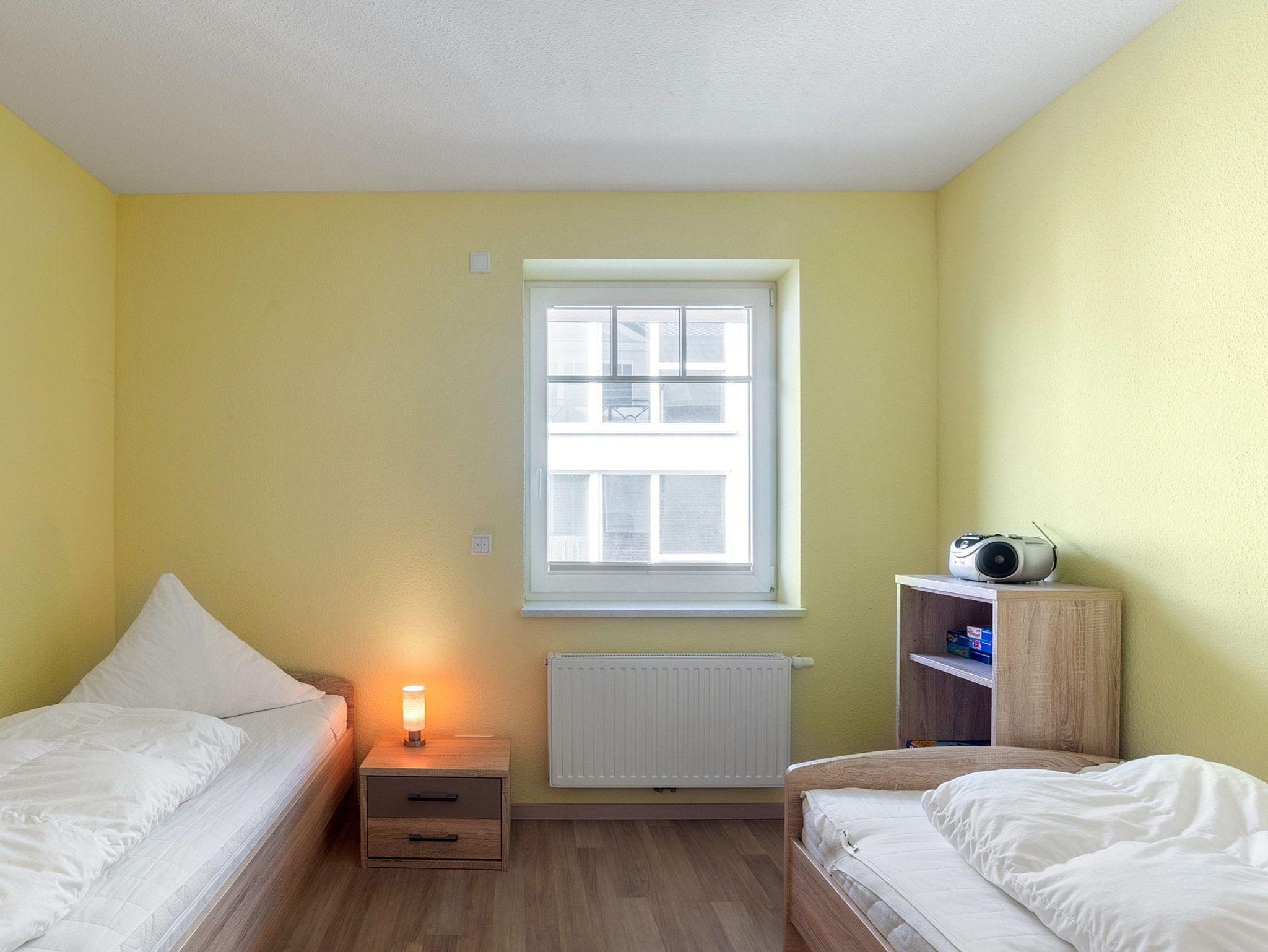Separates, modern ausgestattetes Zimmer mit 2 Einzelbetten (90x200cm) und einem Kleiderschrank. Das Fenster lässt sich durch einen Außenrollladen vollständig verdunkeln.