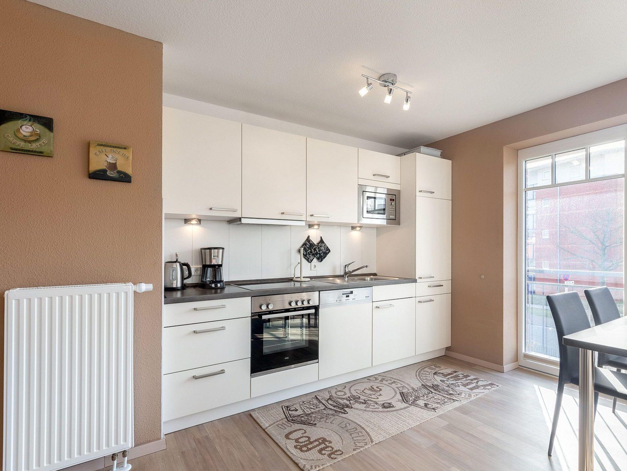 Moderne, zum Wohn- und Esszimmer offene, komplett ausgestattete Küche mit 4-Platten Cerankochfeld, Backofen, Spülmaschine, Kühlschrank mit kleinem 3-Sterne Gefrierfach, Mikrowelle, Kaffeemaschine und Mixer.