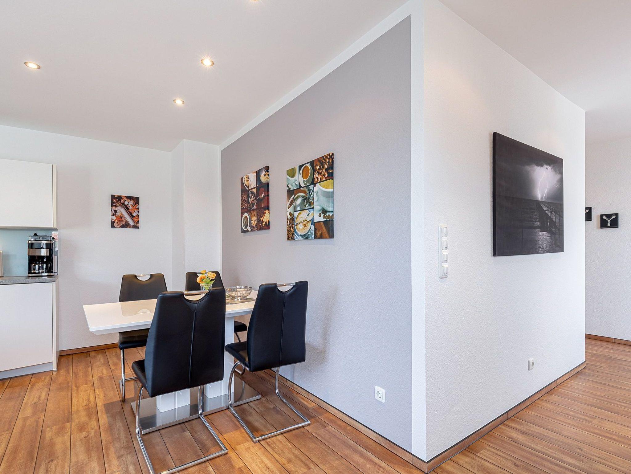 Helles, freundliches, modern und hochwertig ausgestattetes Wohn- und Esszimmer mit direktem Zugang zum Balkon mit schönem Blick auf den Deich bis teilweise zur See. Das Wohn- und Esszimmer ist mit einer Lederschlafcouch (135x195cm), einem Couchtisch, einer Kommode und einem Essplatz für 4 Personen ausgestattet. Das Wohn- und Esszimmer ist mit Designer-Planken ausgelegt. Zur Unterhaltung stehen ein Flachbildschirm und eine Mini-Stereoanlage zur Verfügung. Die Fenster lassen sich durch Außenrollos vollständig verdunkeln.