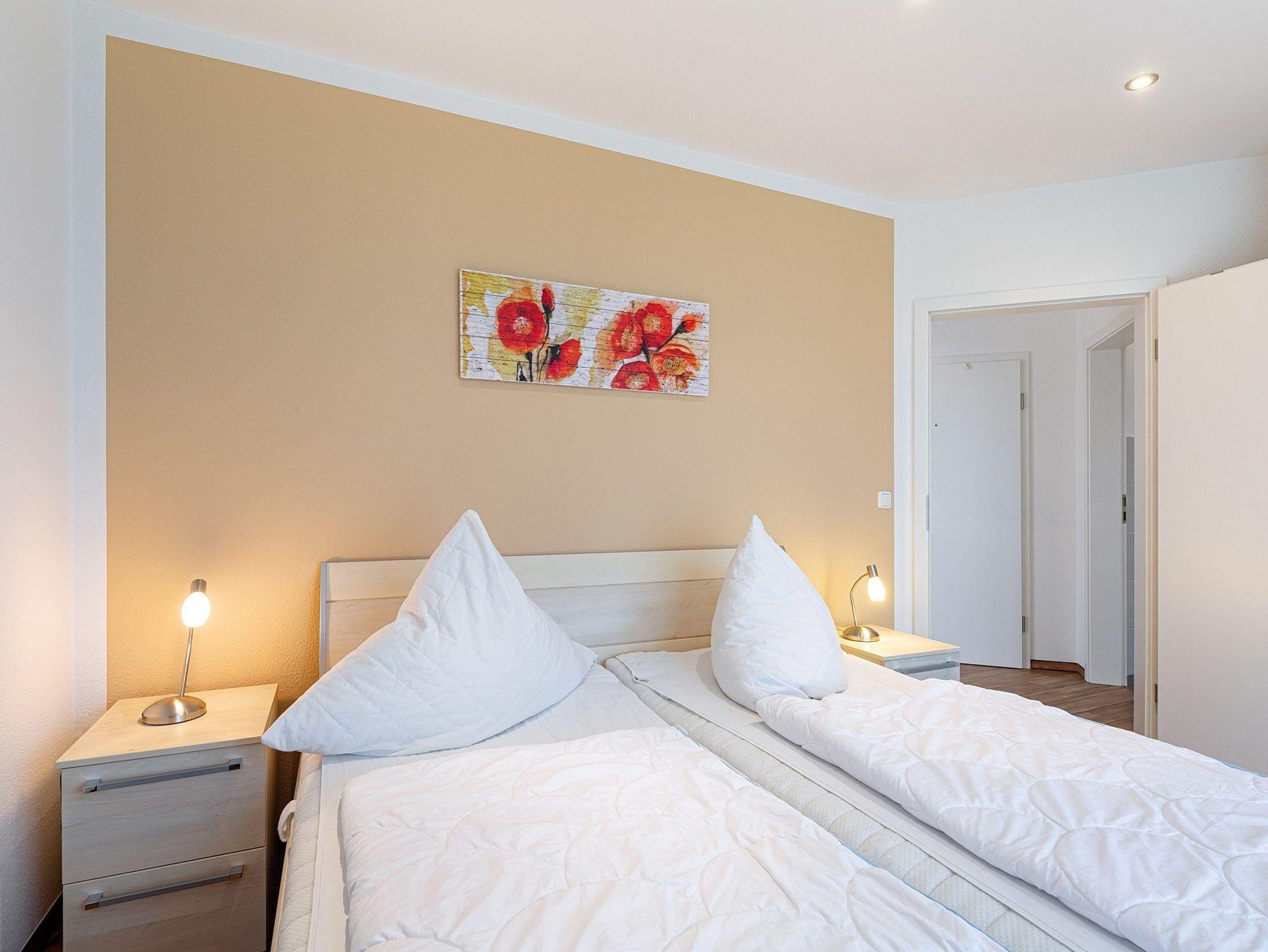 Das modern und hochwertig eingerichtete Schlafzimmer ist mit einem Doppelbett (2x 90x200cm) und einem Einbau-Kleiderschrank ausgestattet. Das Schlafzimmer ist mit Designer-Planken ausgelegt. Das Fenster lässt sich durch ein Außenrollo vollständig verdunkeln.