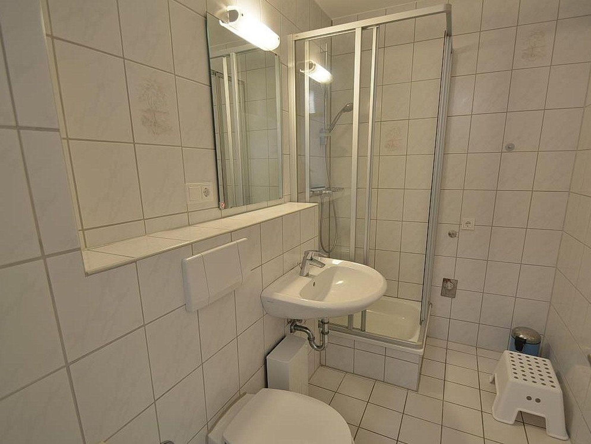Helles, freundliches Bad mit Dusche, Waschbecken und WC.