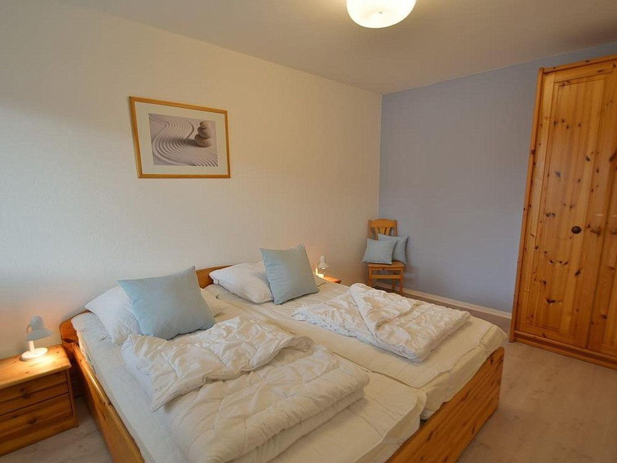 Das Schlafzimmer ist ausgestattet mit einem Doppelbett (2x90x200cm) und einem 2-türigen Kleiderschrank. Der Raum lässt sich durch Außenrollläden vollständig verdunkeln und ist mit Designerplanken ausgelegt.