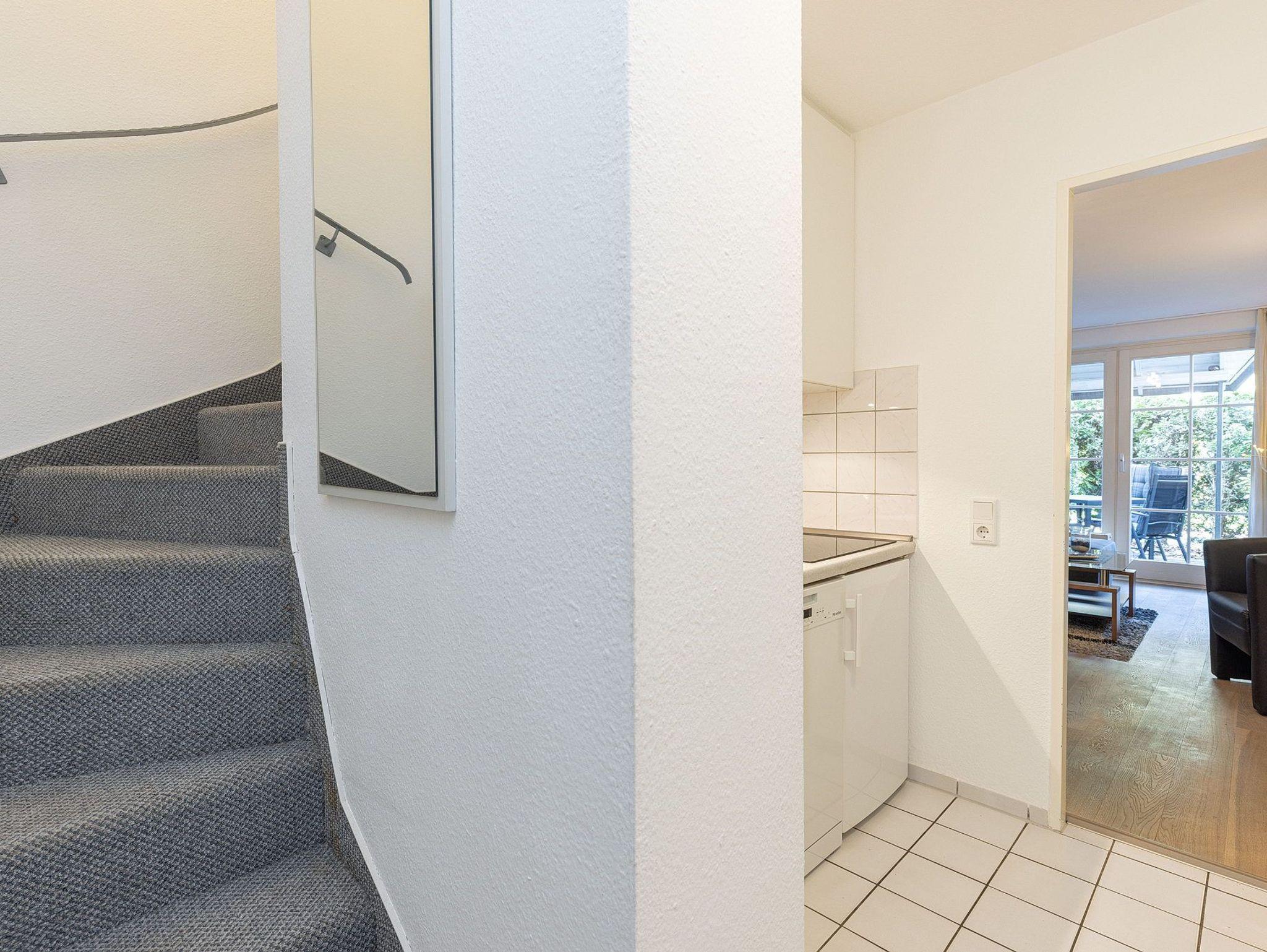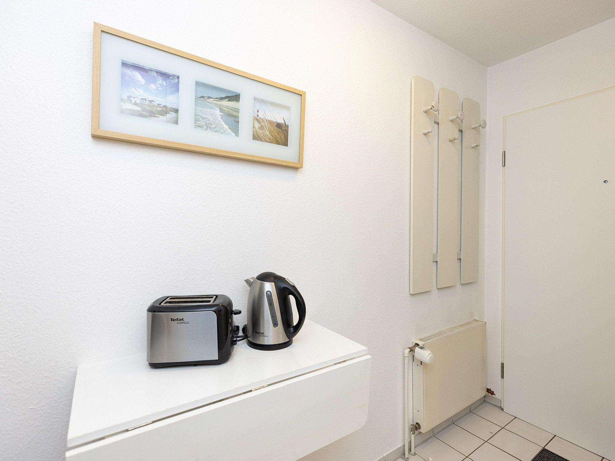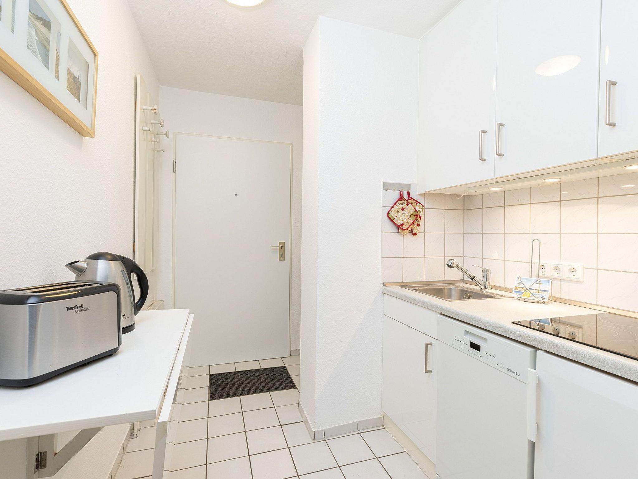 Moderne, komplett ausgestattete Pantry-Küche im EG. Die Pantry-Küche ist mit einem 4-Platten Cerankochfeld, einer Spülmaschine, einem Kühlschrank mit kleinem 3-Sterne Gefrierfach, einer Mikrowelle, einem Wasserkocher, einem Toaster und einer Kaffeemaschine ausgestattet.