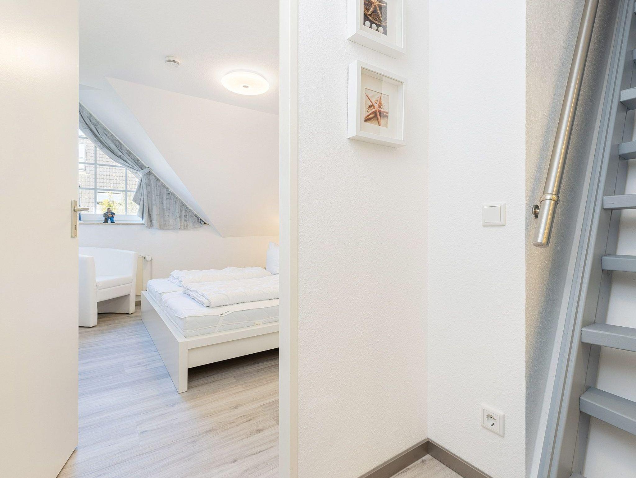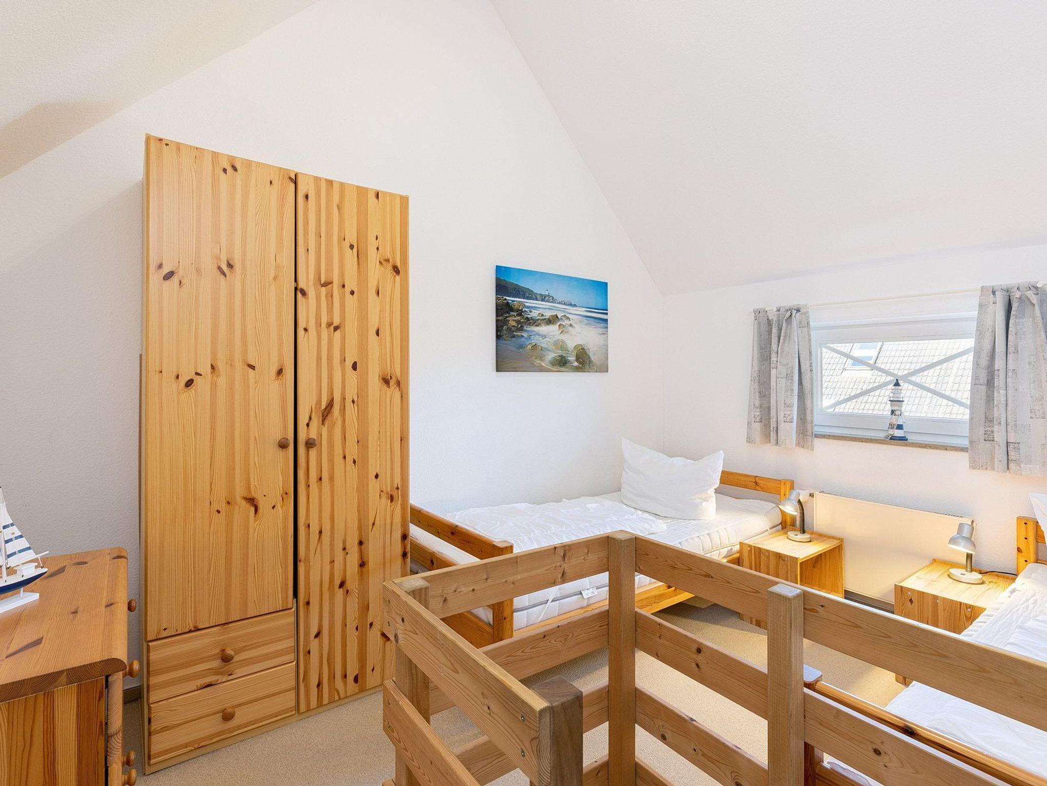 Das Schlafzimmer im 2. OG ist über eine steile und sehr geräuscharme Raumspartreppe erreichbar. Das Schlafzimmer ist mit 2 getrennten Betten (90x200cm), zwei Nachttischen, einem Kleiderschrank und einer Kommode ausgestattet. Das Zimmer ist mit Teppichboden ausgelegt. Das Fenster lässt sich durch einen blickdichten Vorhang verdunkeln.