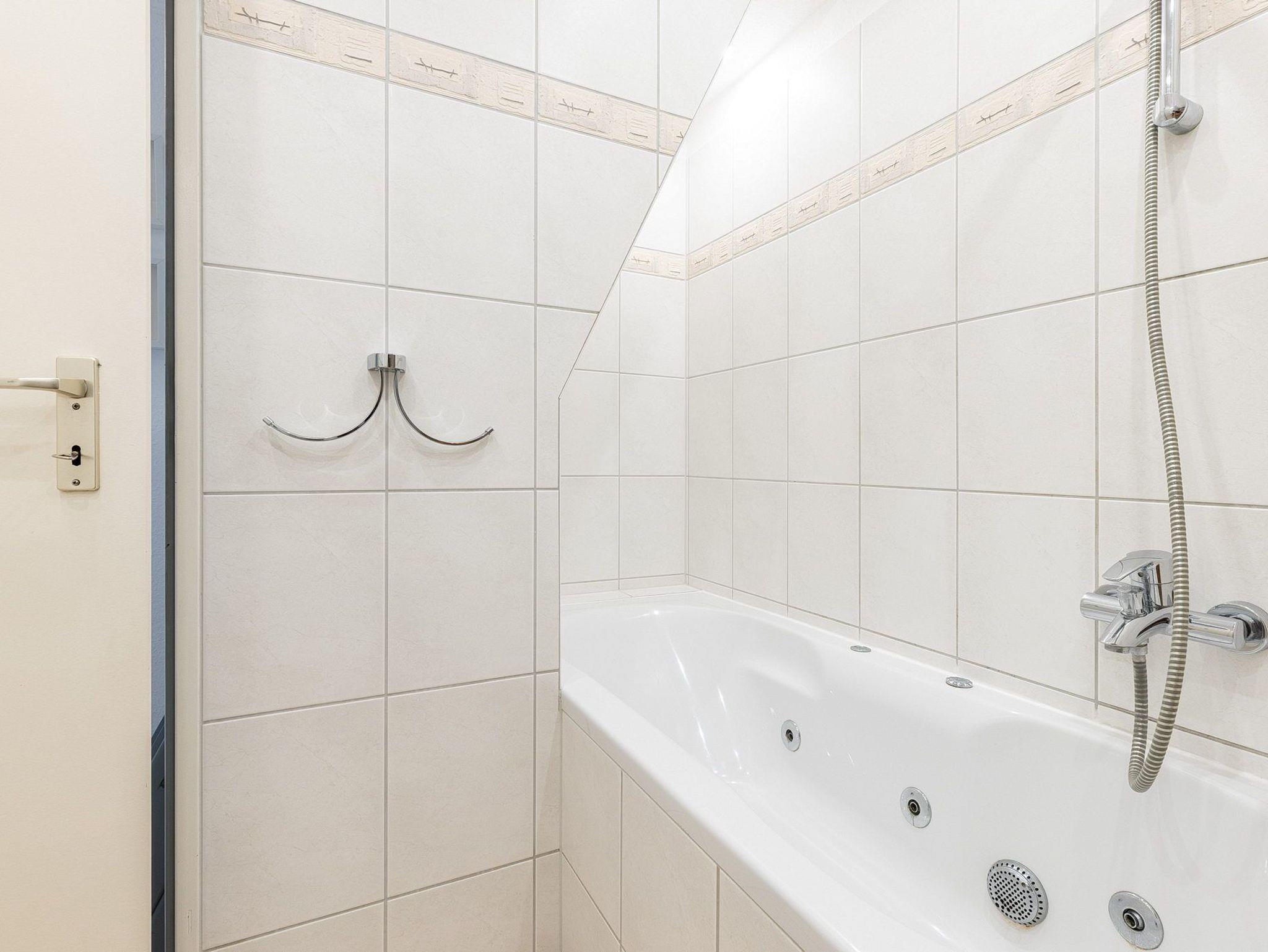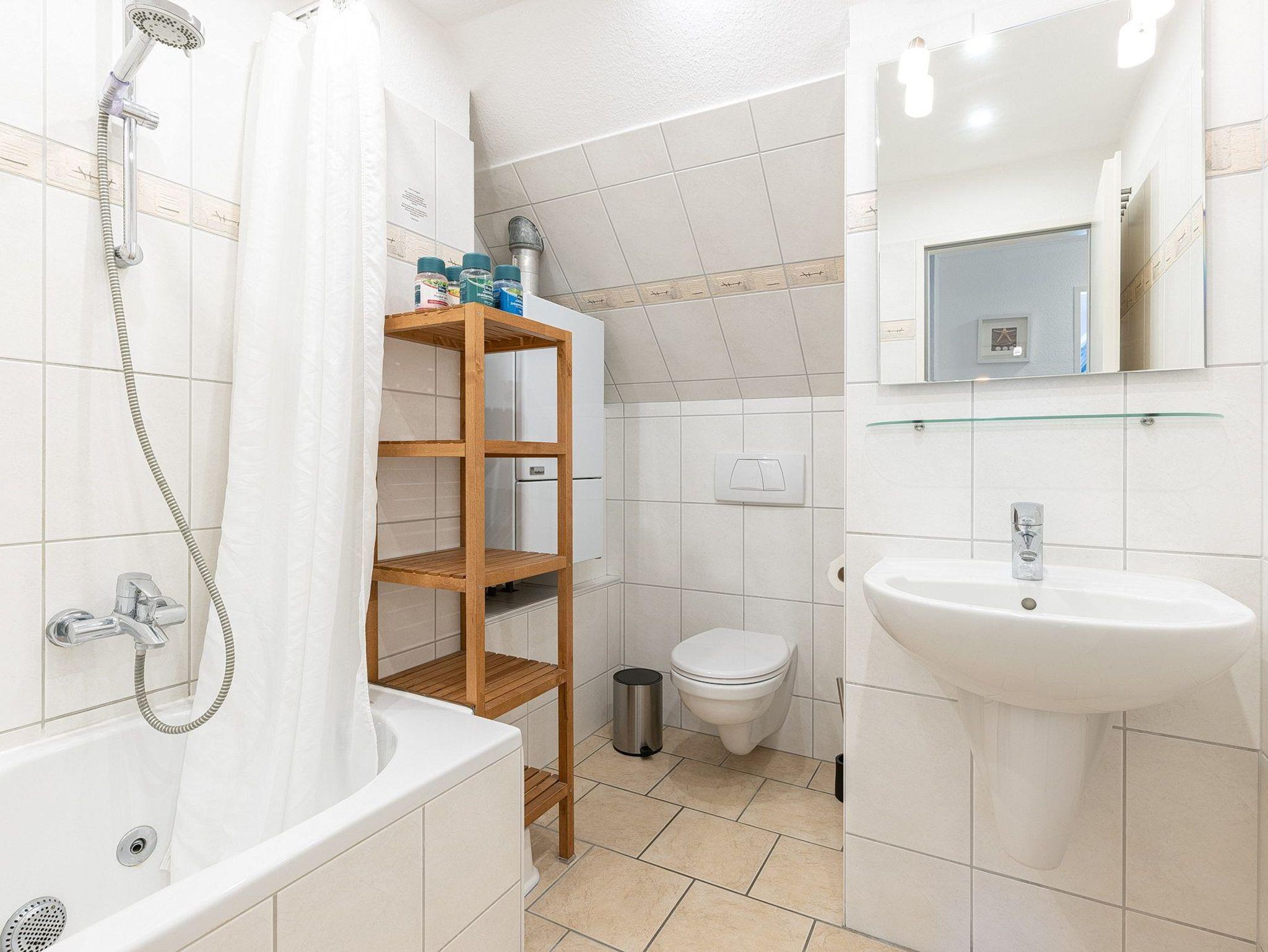 Modernes, hell gefliestes Bad im 1.OG. Das Bad ist mit einer Whirlpool-Badewanne, einem Waschbecken und einem WC ausgestattet. Die Fußbodenheizung sorgt für angenehm warme Füße.