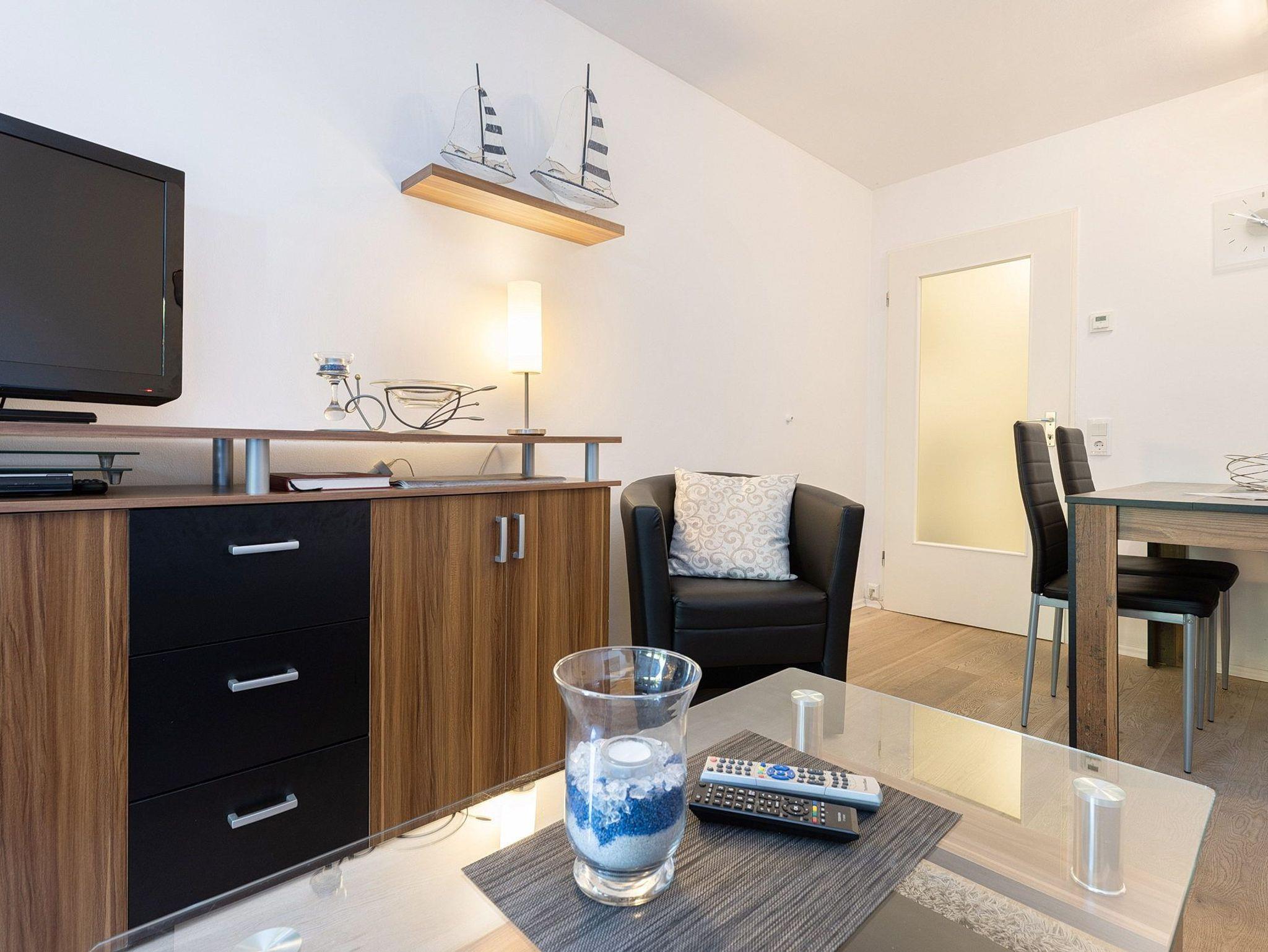 Modernes und Ende 2021 renoviertes Wohn- und Esszimmer im EG mit direktem Zugang zur Terrasse. Das Wohn- und Esszimmer ist mit einem Essplatz für 4 Personen, einer Eck-Couch, 1 Sessel, einem Couchtisch und einer Kommode ausgestattet. Zur Unterhaltung steht ein Flachbildschirm (digitaler SAT-TV und Radioempfang) sowie ein DVD-Player zur Verfügung. Das Zimmer ist mit Laminatboden ausgelegt.