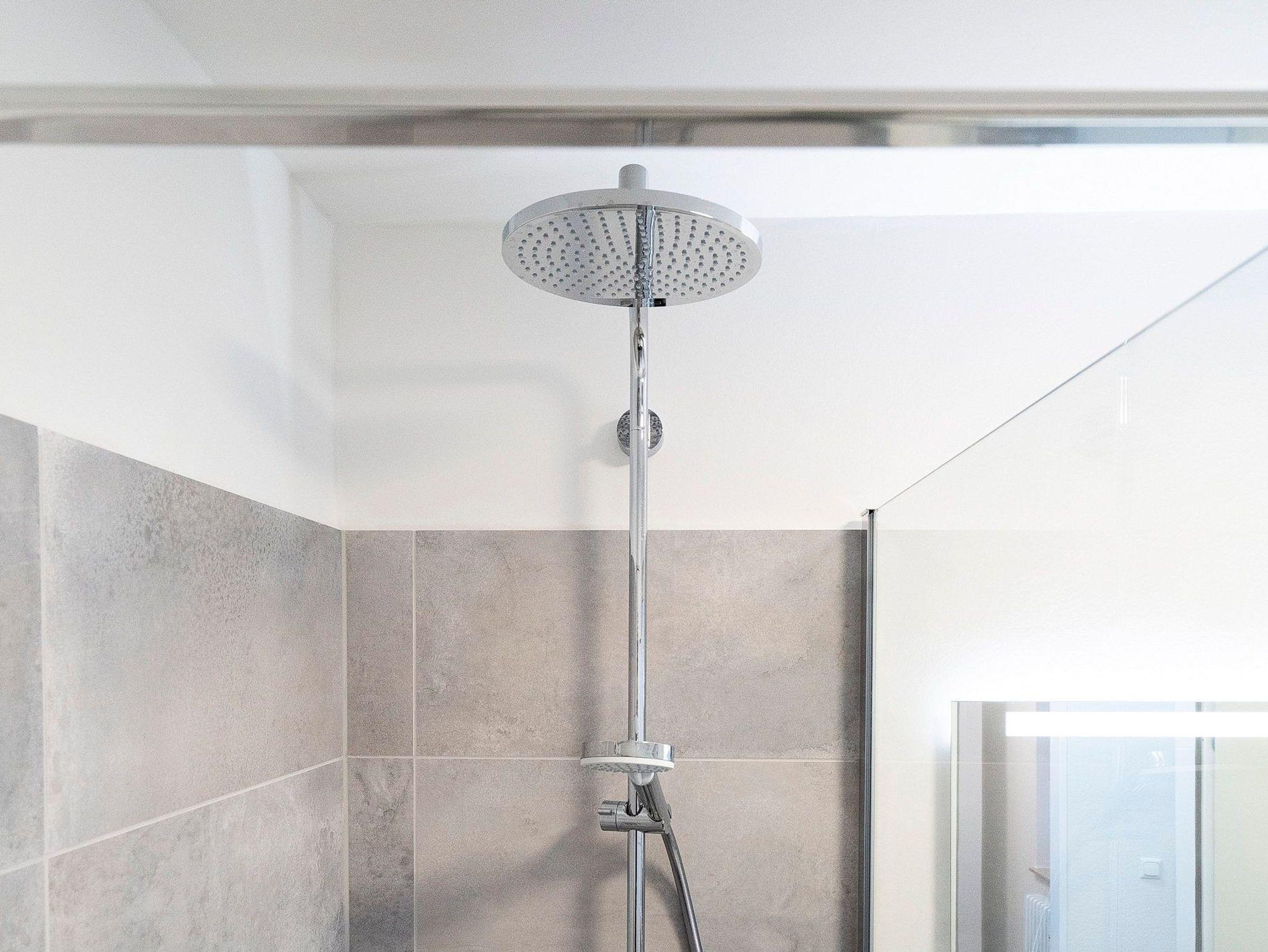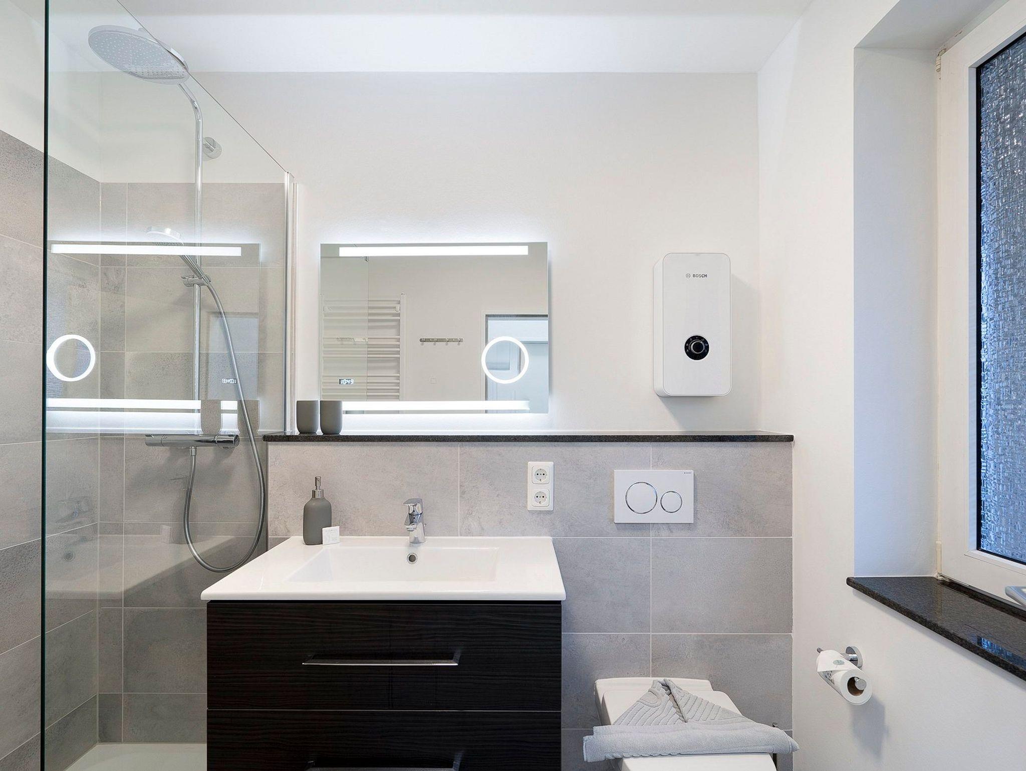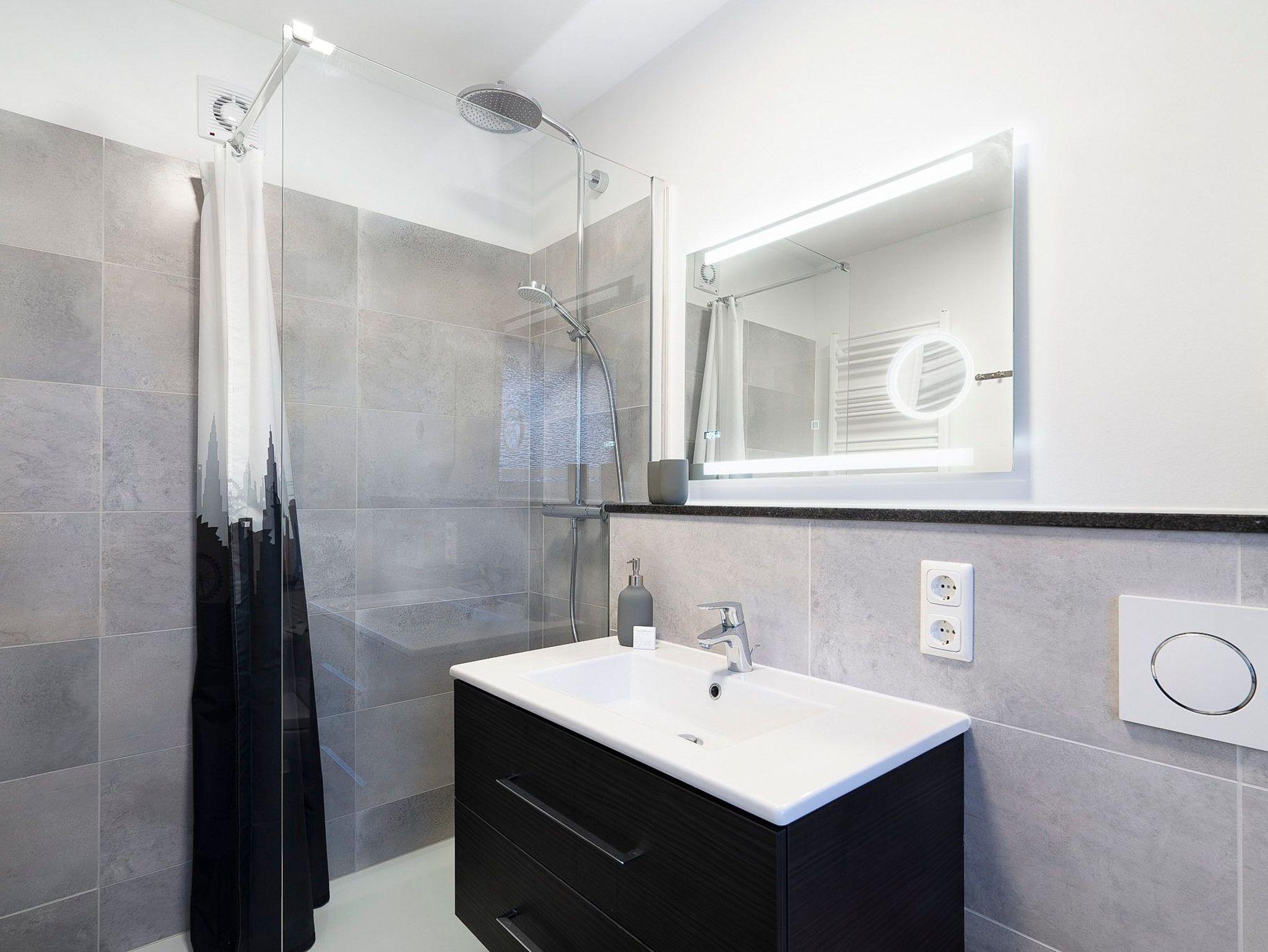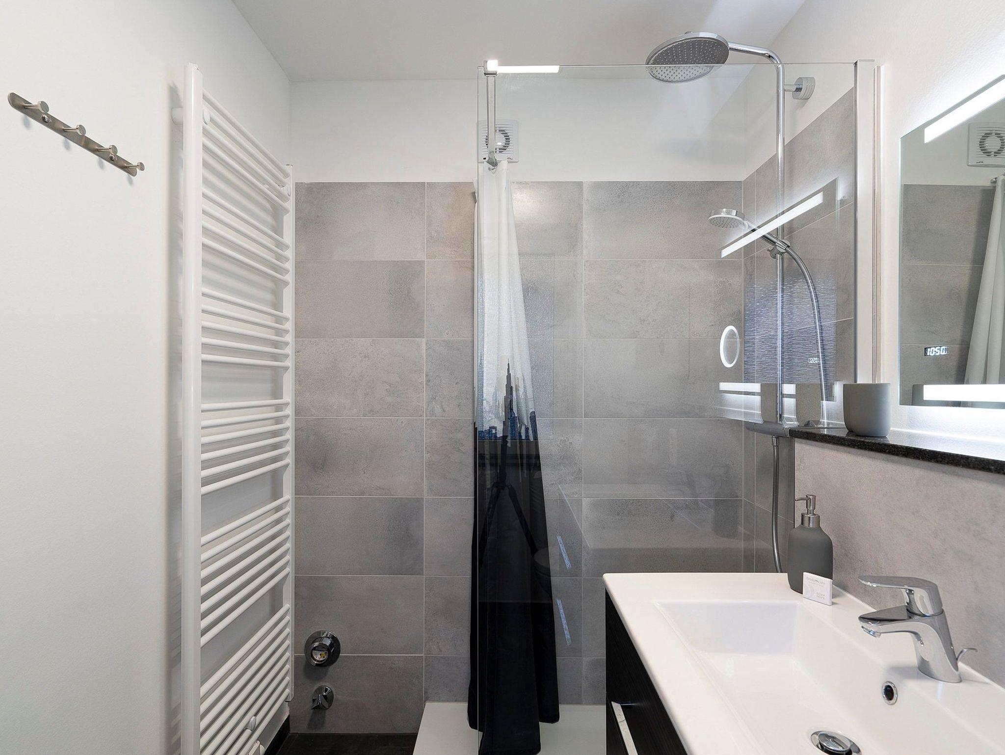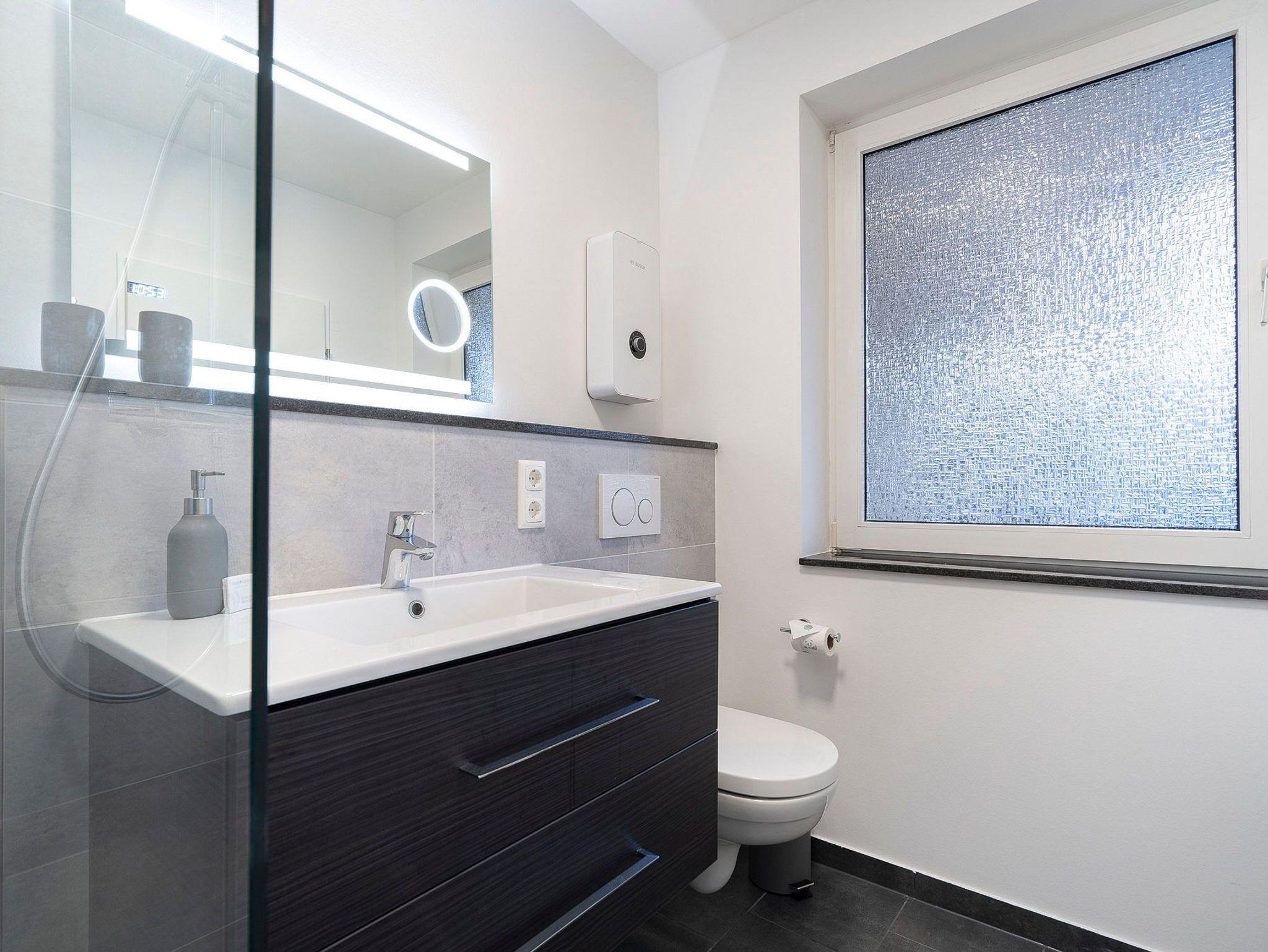 Freundlich helles Badezimmer mit Dusche, WC und Waschbecken.