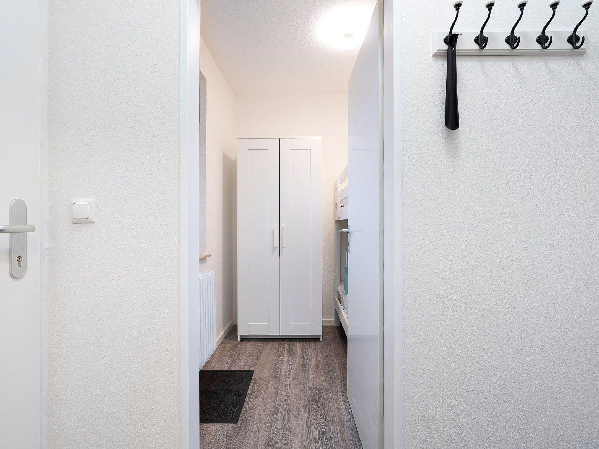 Das Kinderzimmer verfügt über ein Etagenbett (2x90x200 cm), sowie einen kleinen zweitürigen Kleiderschrank. Der Raum ist mit Vinylboden verlegt und das Fenster ist mit einem blickdichten Plissee versehen.