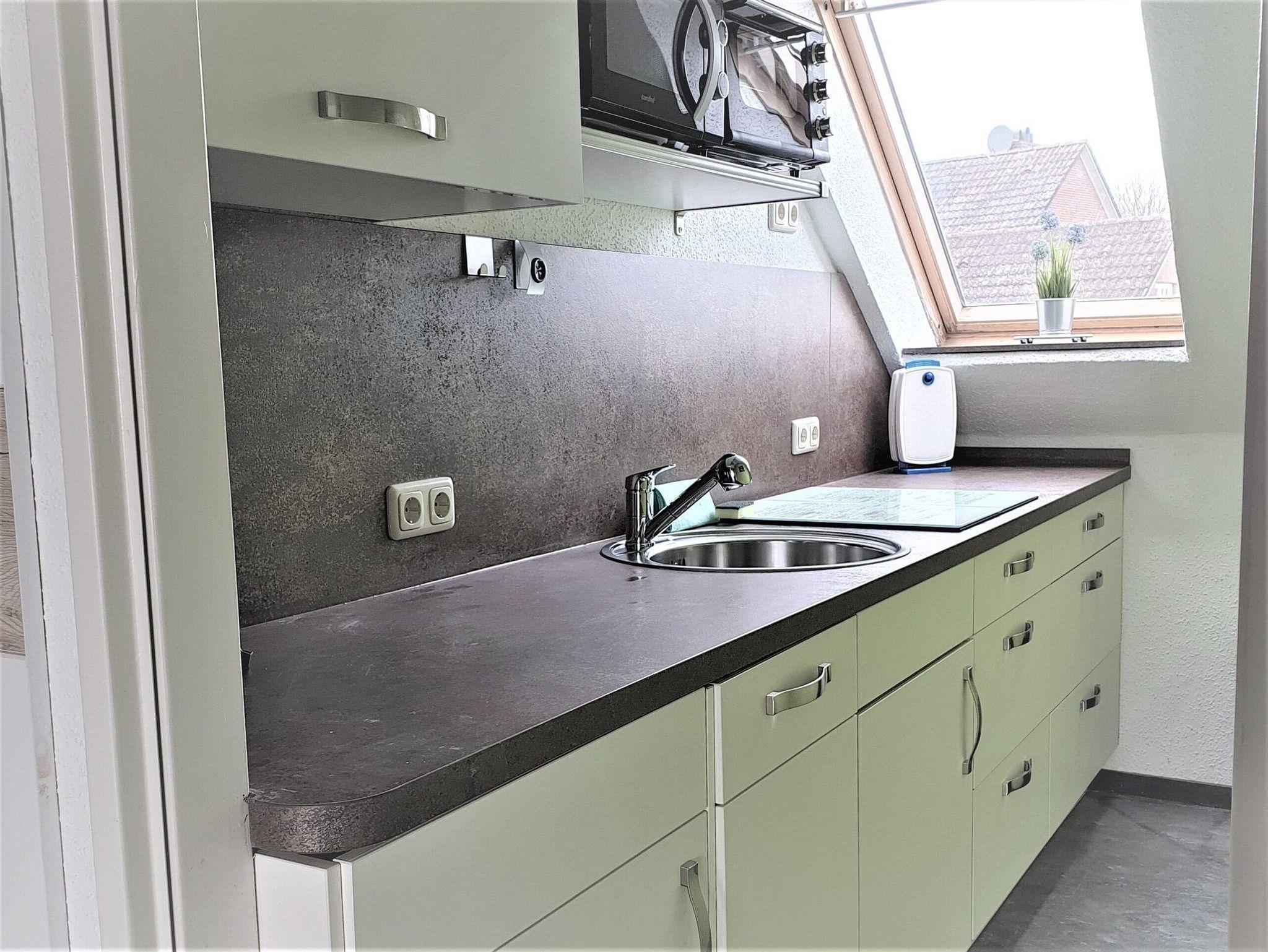 Komplett eingerichtete Küche mit Spülmaschine, 4-Platten-Cerankochfeld, Kühlschrank mit kleinem Gefrierfach. Des Weiteren stehen eine Kaffeemaschine, ein Toaster, ein Wasserkocher, eine Mikrowelle und ein kleiner Backofen zur Verfügung