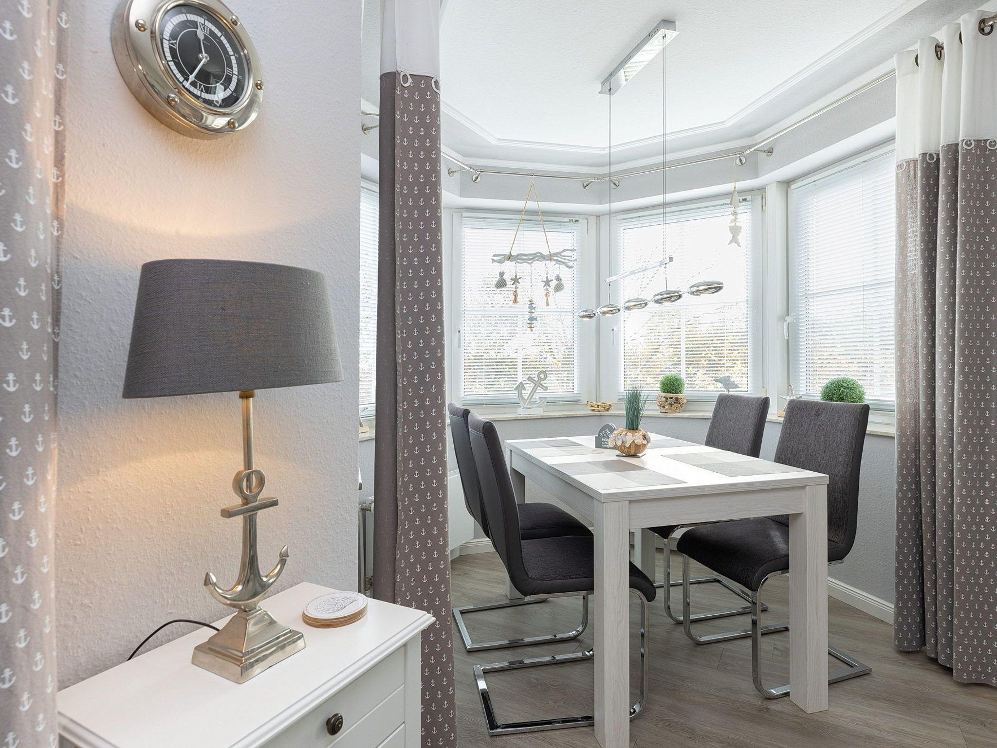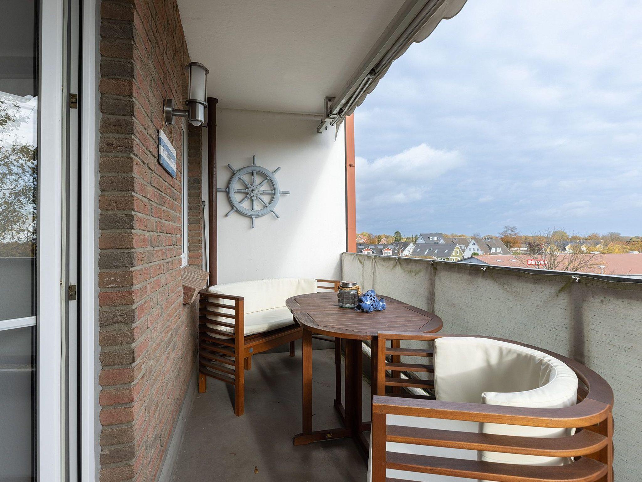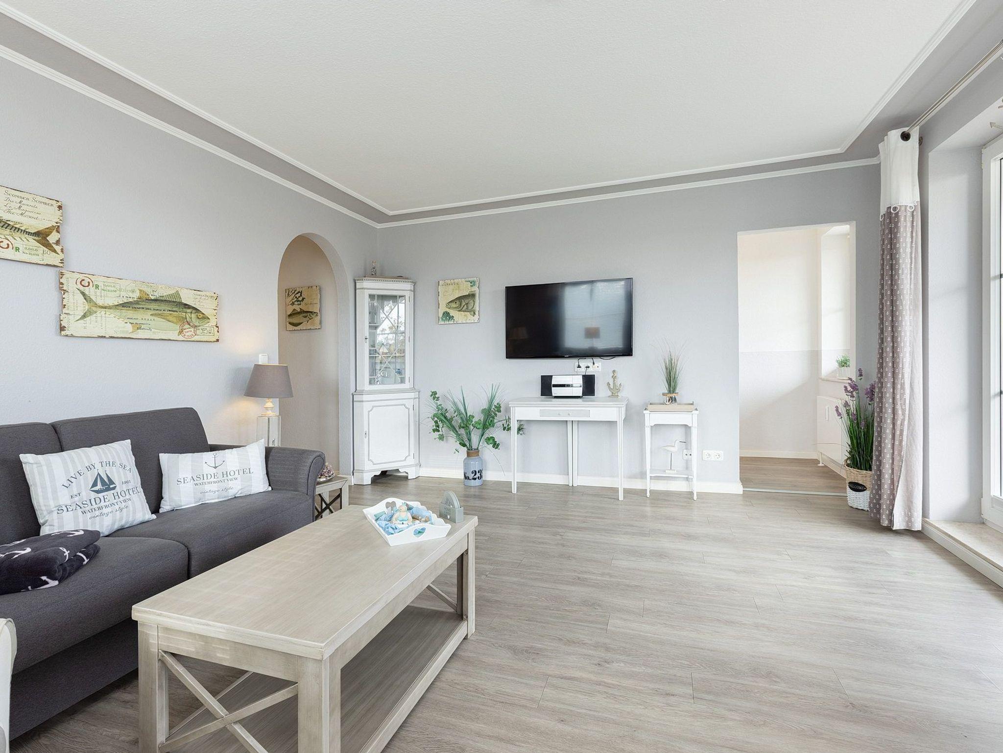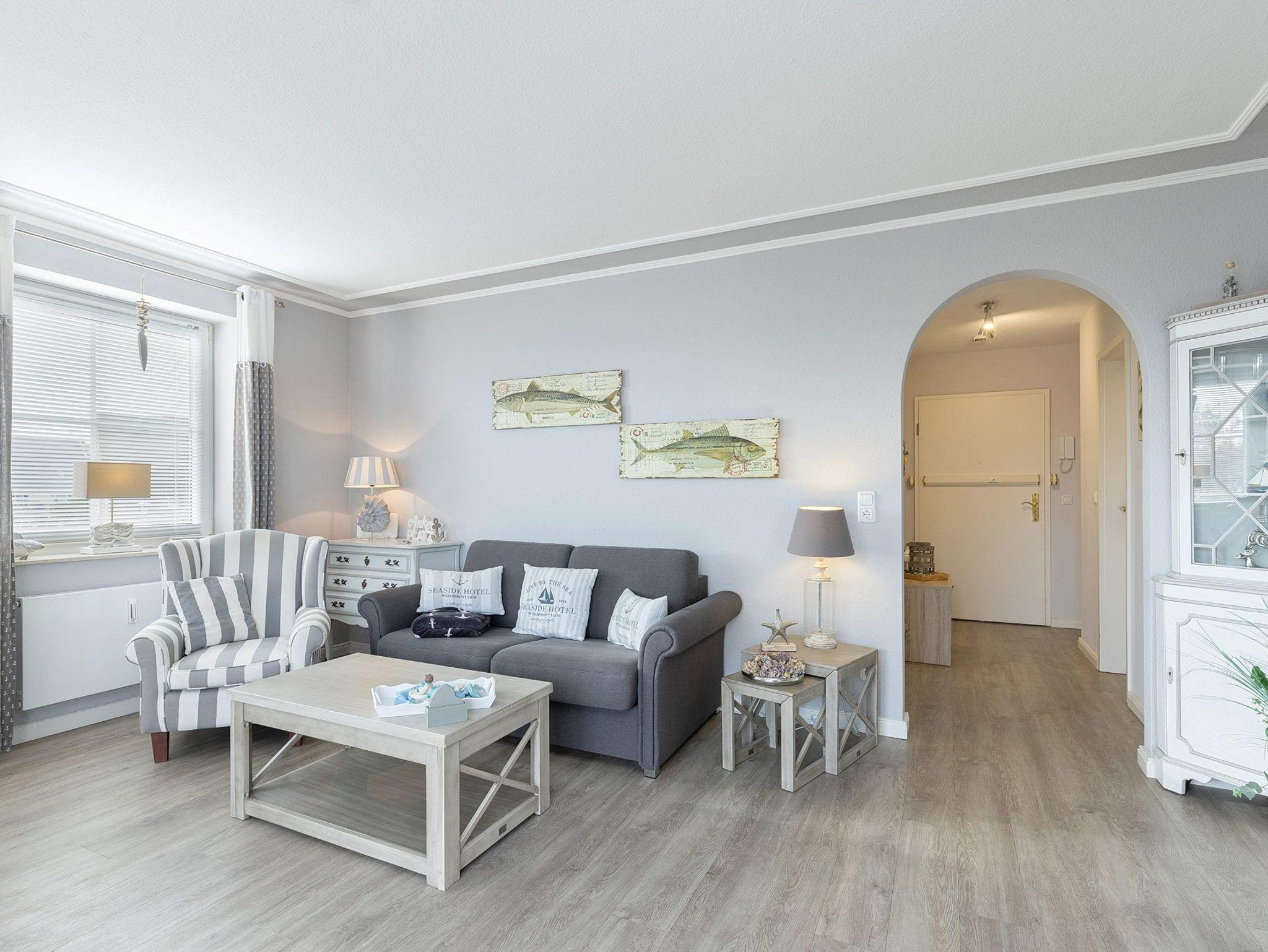 Gemütlicher maritimer Wohn-Essbereich mit direktem Zugang zum Balkon. Das Zimmer ist ausgestattet mit einem Zwei-Sitzer Schlafsofa, einem Sessel und einem Essplatz für 4 Personen. Zur Unterhaltung steht ein Flachbild-TV sowie eine Stereo-Anlage zur Verfügung. Der Boden ist mit Designerplatten ausgelegt. Die Fenster lassen sich mit Vorhängen und Plissees etwas verdunkeln.