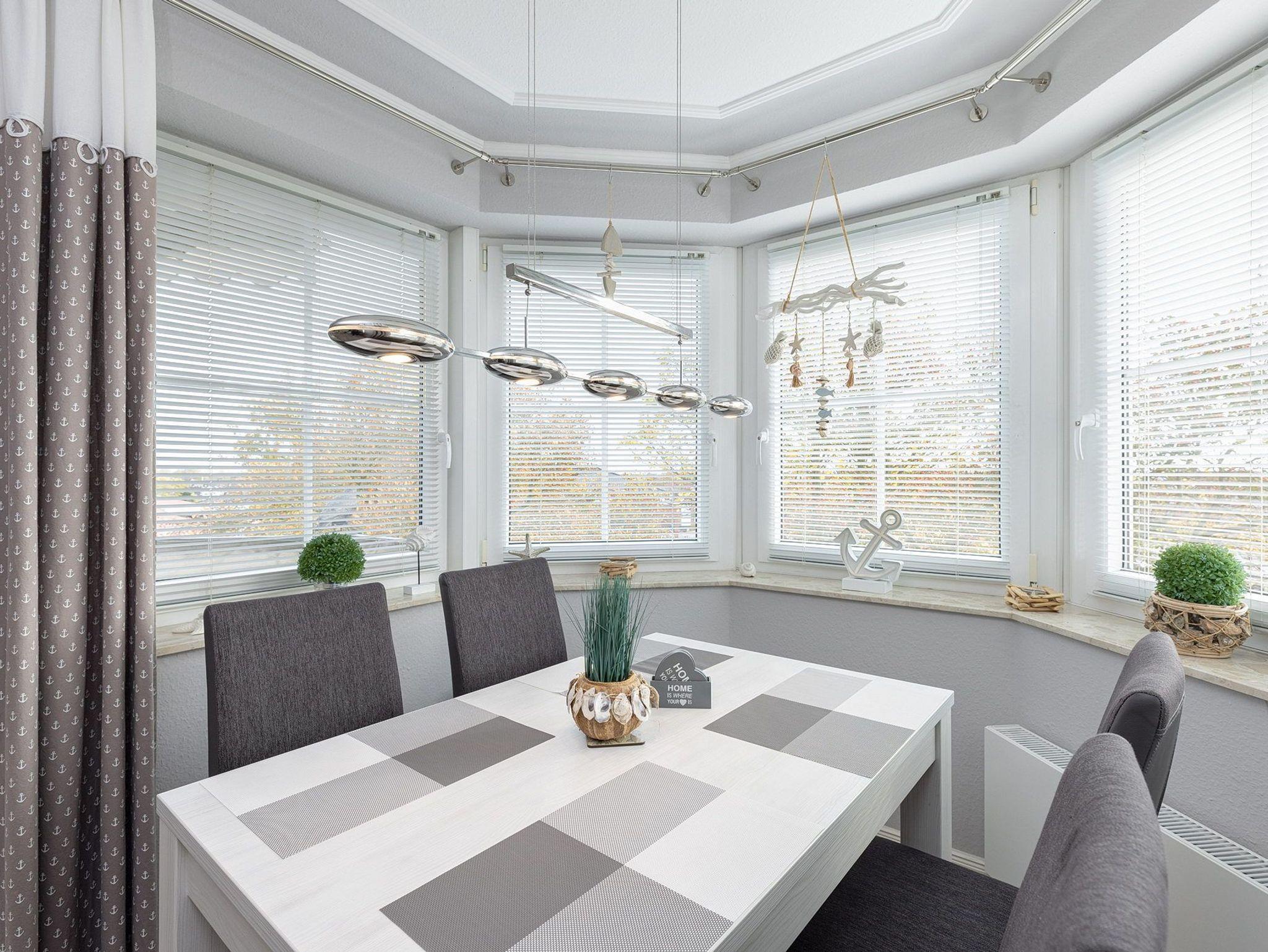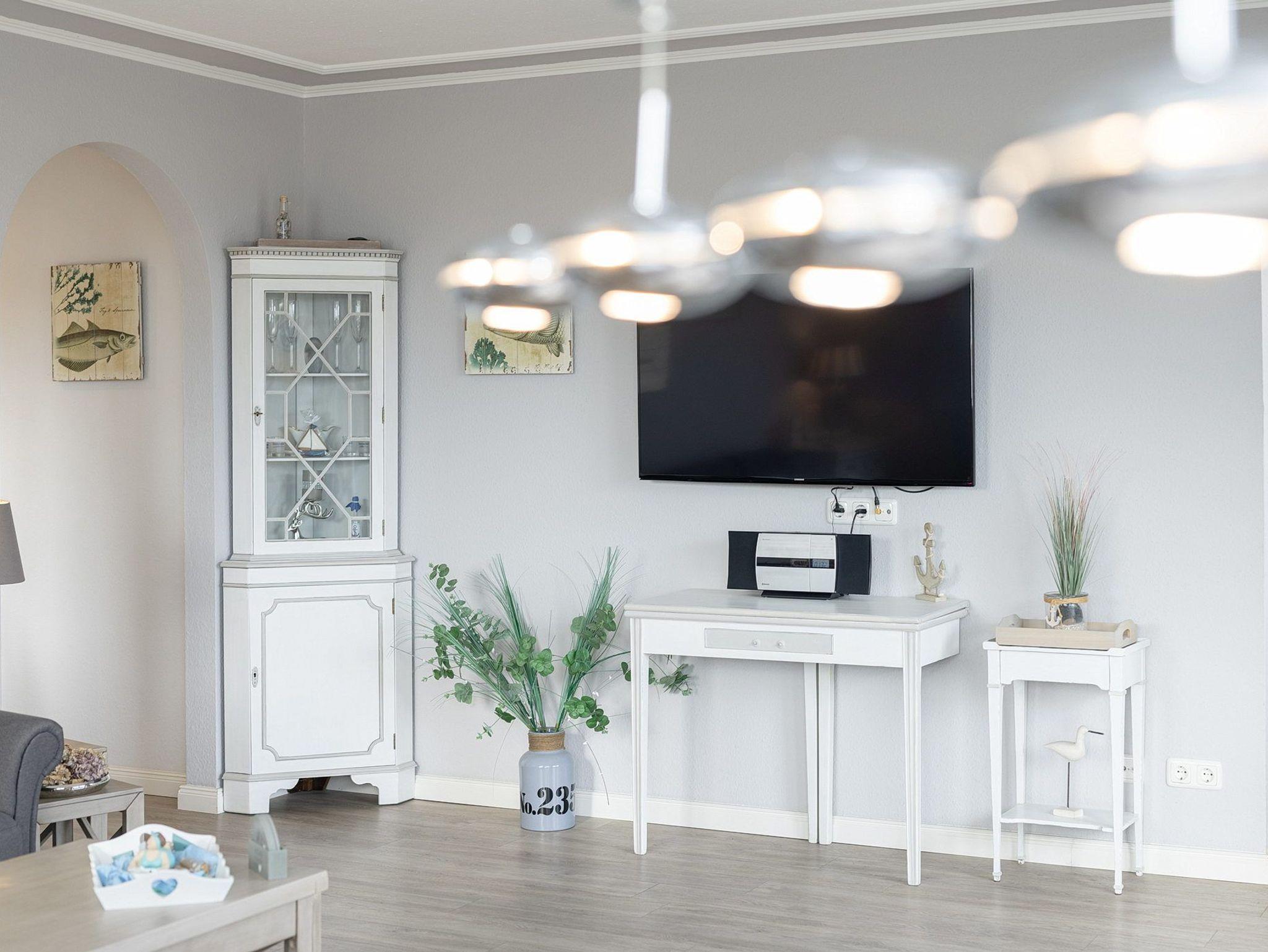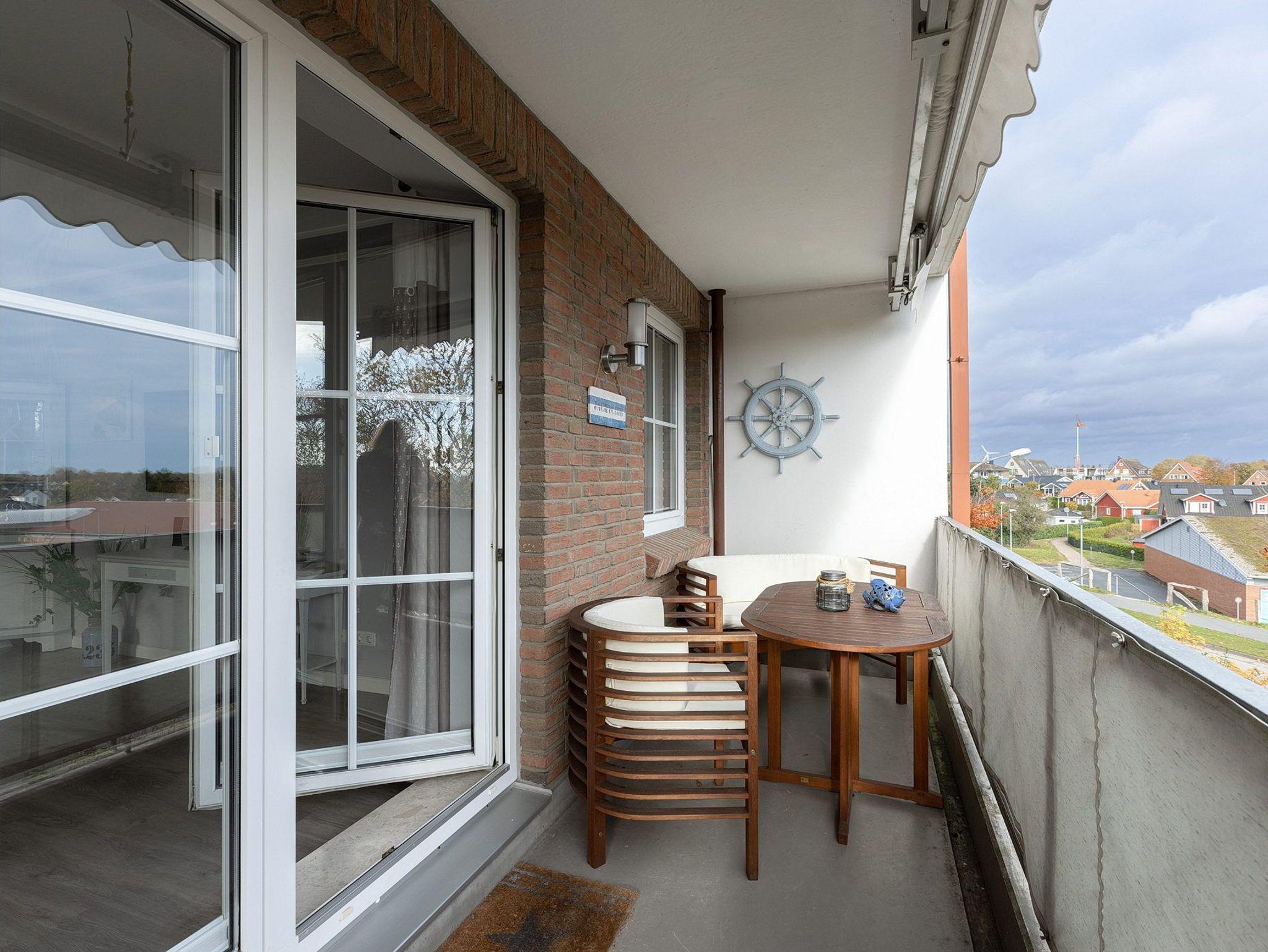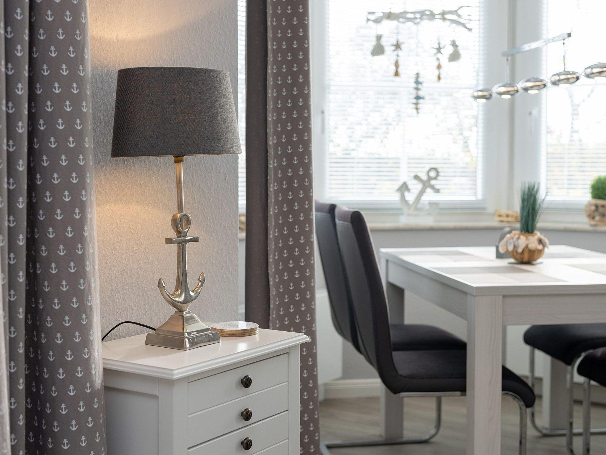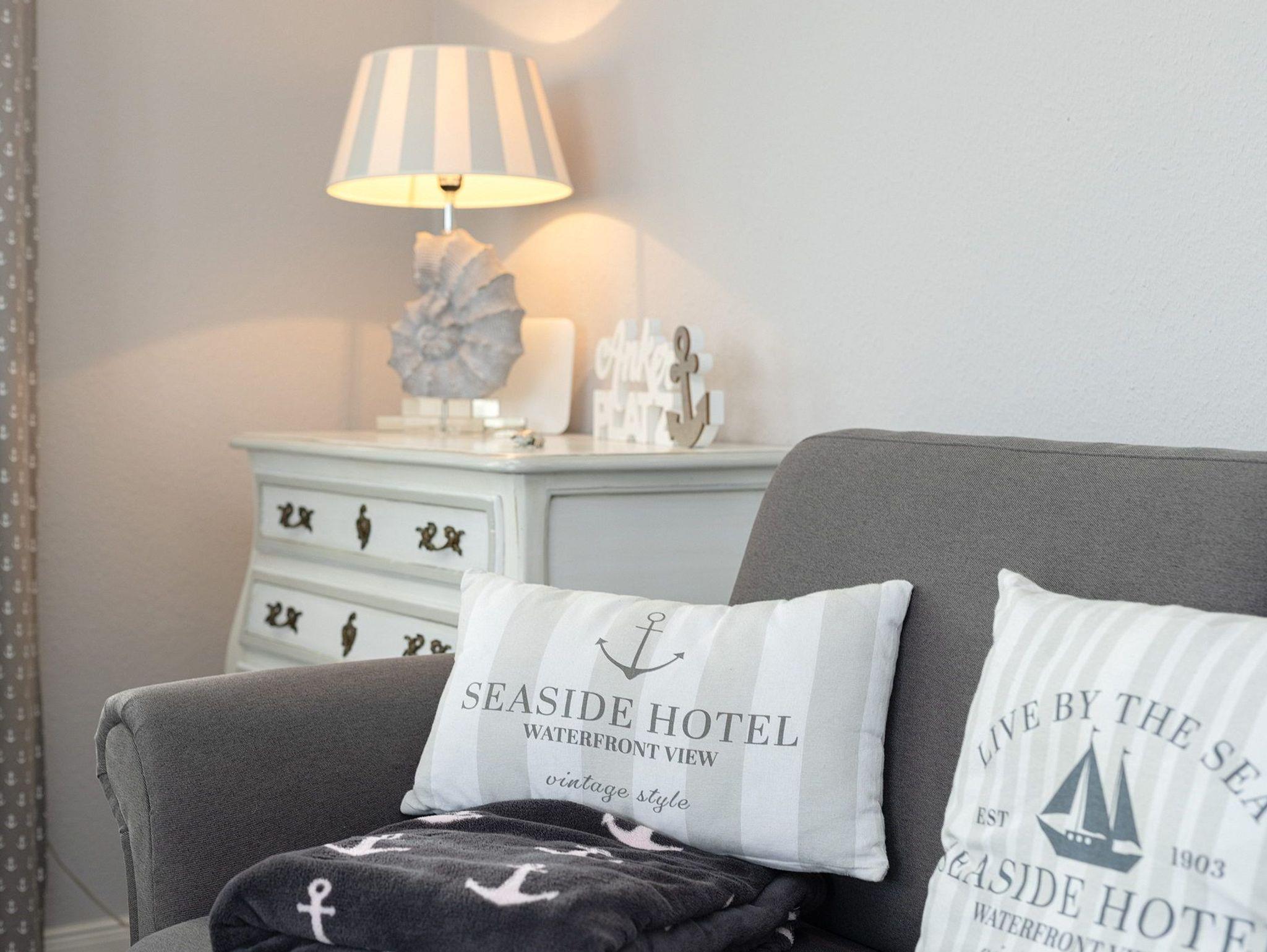 Gemütlicher maritimer Wohn-Essbereich mit direktem Zugang zum Balkon. Das Zimmer ist ausgestattet mit einem Zwei-Sitzer Schlafsofa, einem Sessel und einem Essplatz für 4 Personen. Zur Unterhaltung steht ein Flachbild-TV sowie eine Stereo-Anlage zur Verfügung. Der Boden ist mit Designerplatten ausgelegt. Die Fenster lassen sich mit Vorhängen und Plissees etwas verdunkeln.