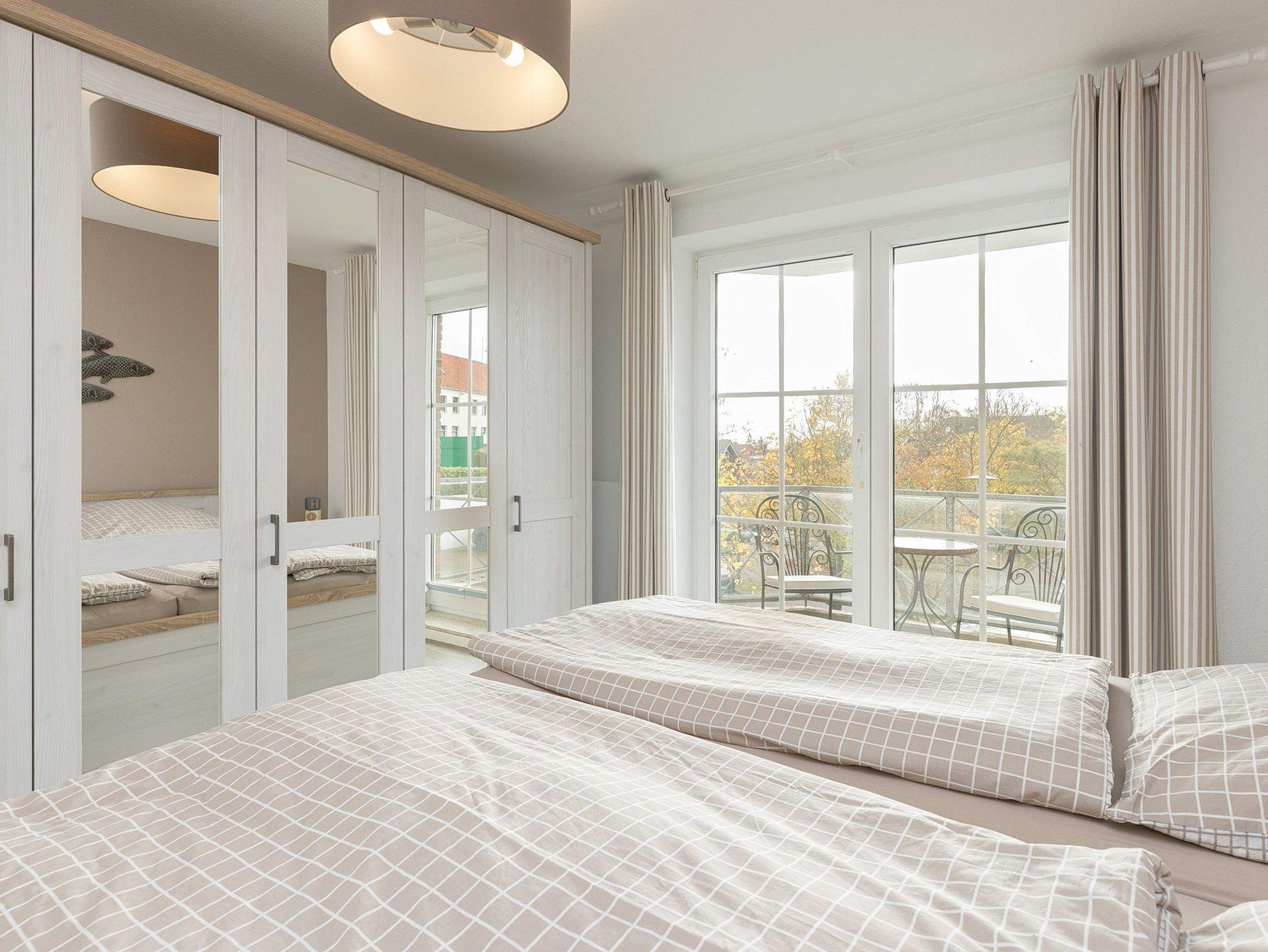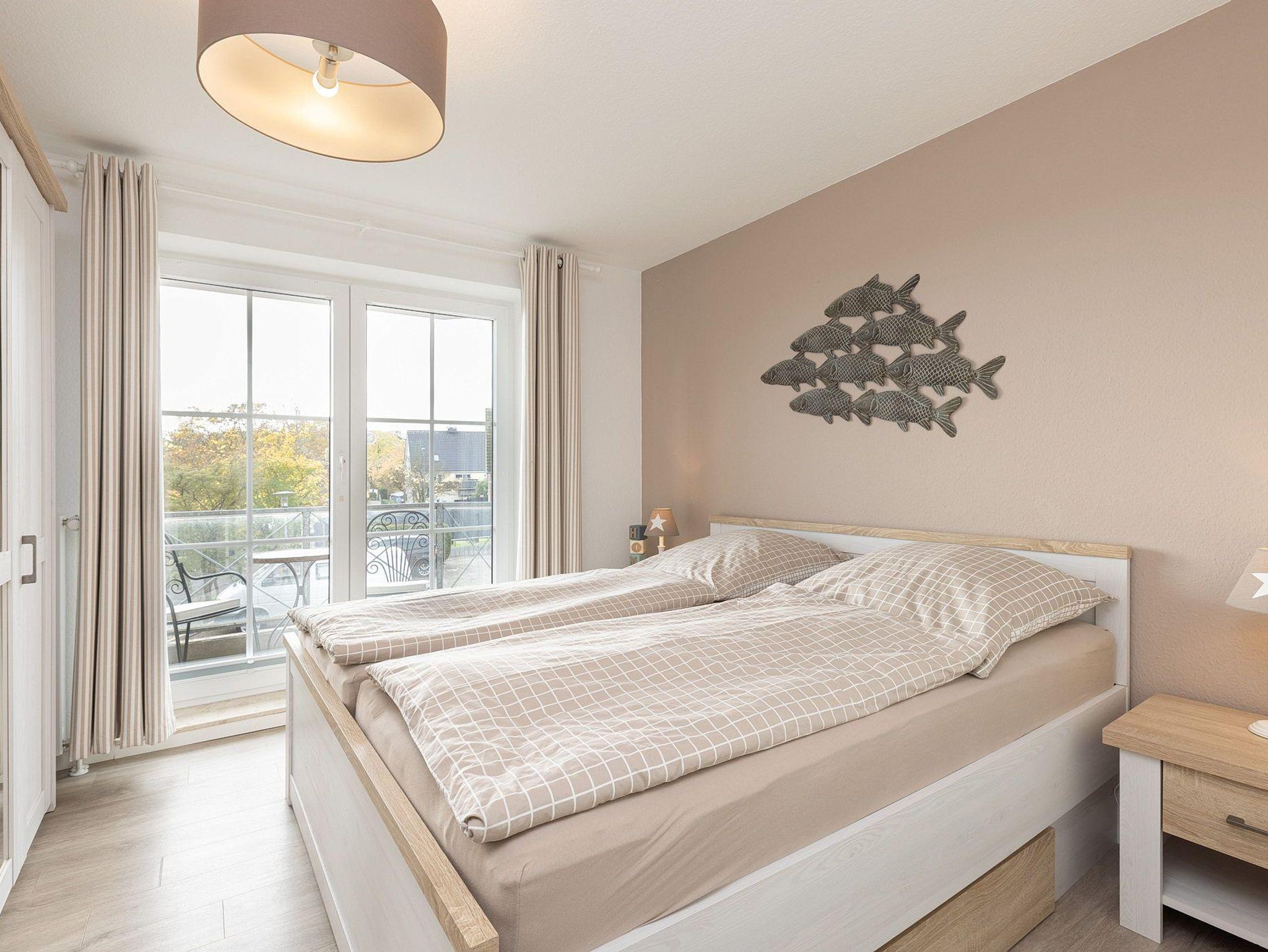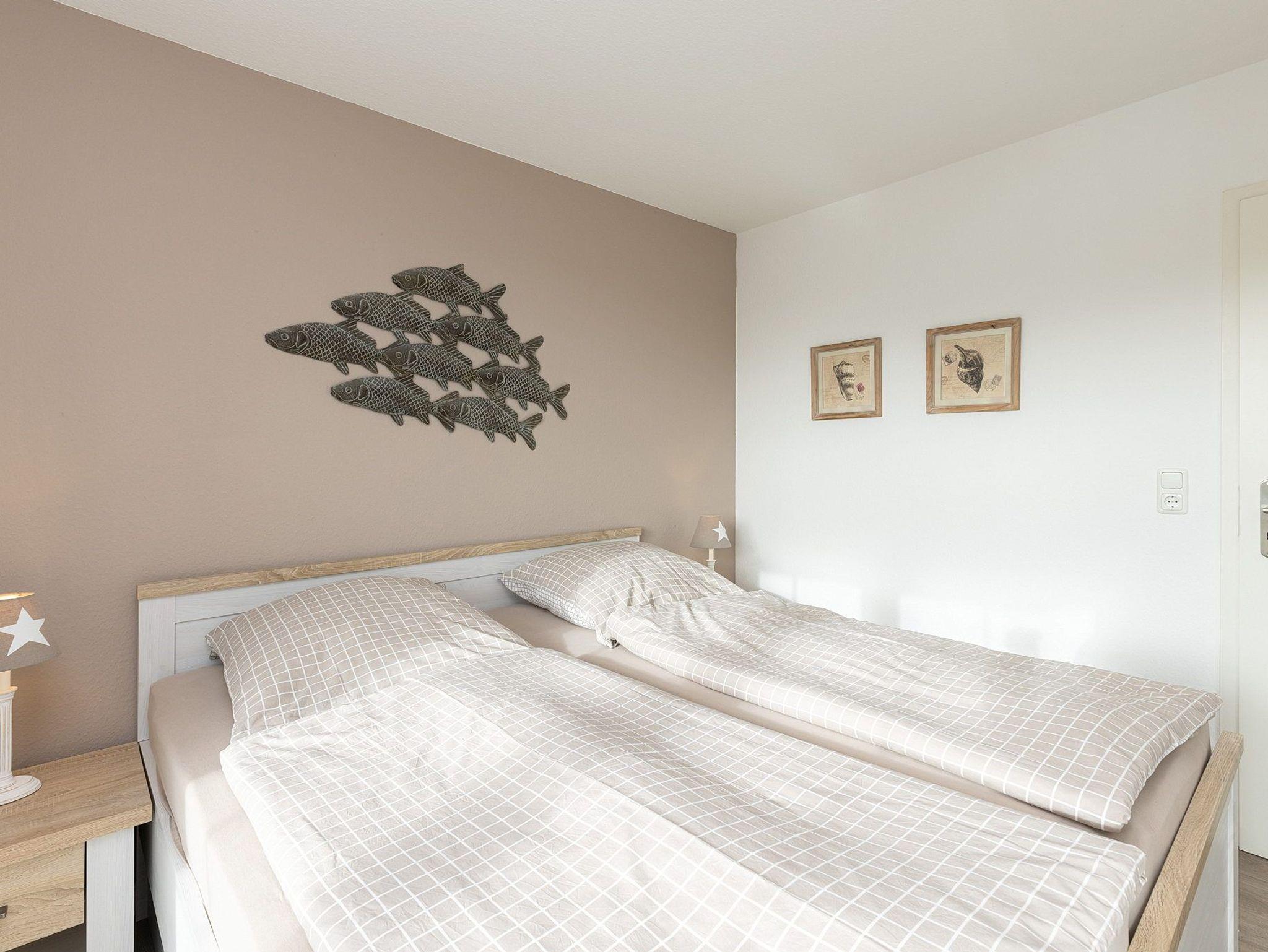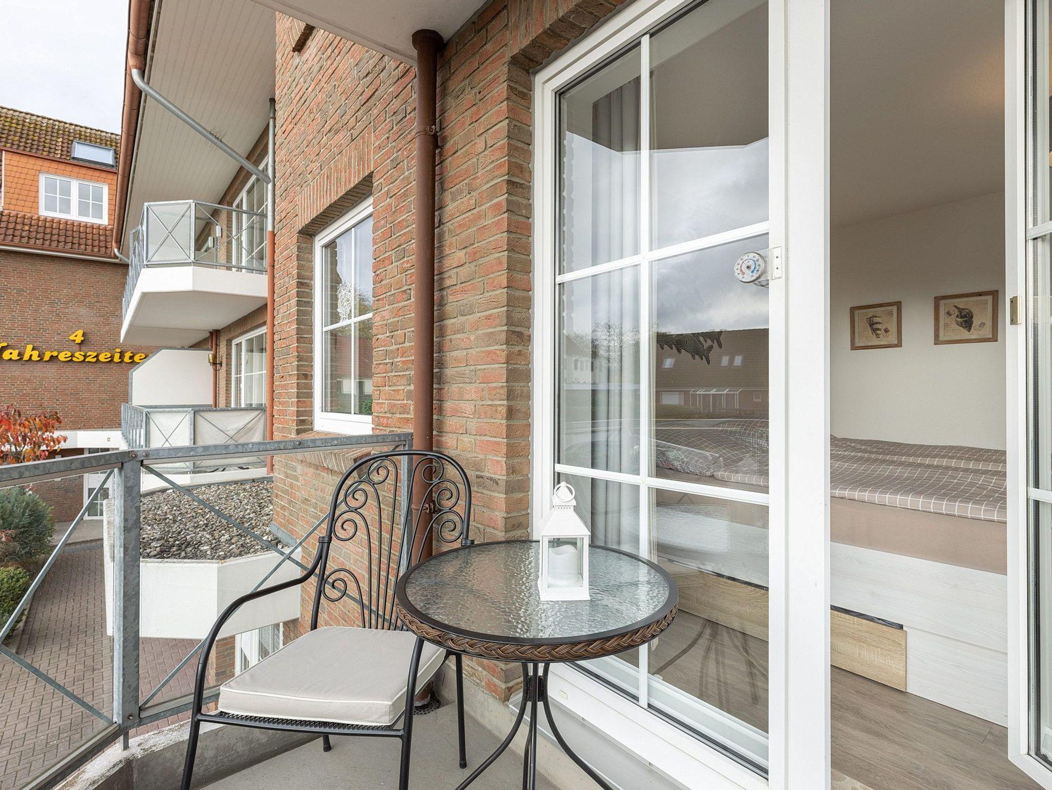 Gemütlicher maritimer Wohn-Essbereich mit direktem Zugang zum Balkon. Das Zimmer ist ausgestattet mit einem Zwei-Sitzer Schlafsofa, einem Sessel und einem Essplatz für 4 Personen. Zur Unterhaltung steht ein Flachbild-TV sowie eine Stereo-Anlage zur Verfügung. Der Boden ist mit Designerplatten ausgelegt. Die Fenster lassen sich mit Vorhängen und Plissees etwas verdunkeln.