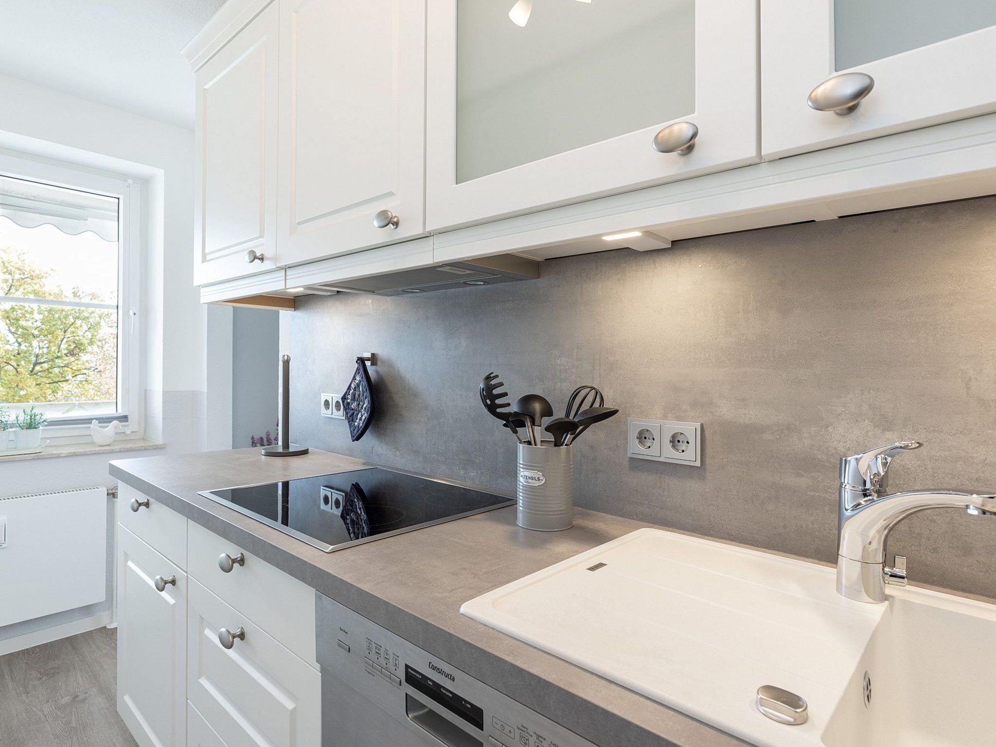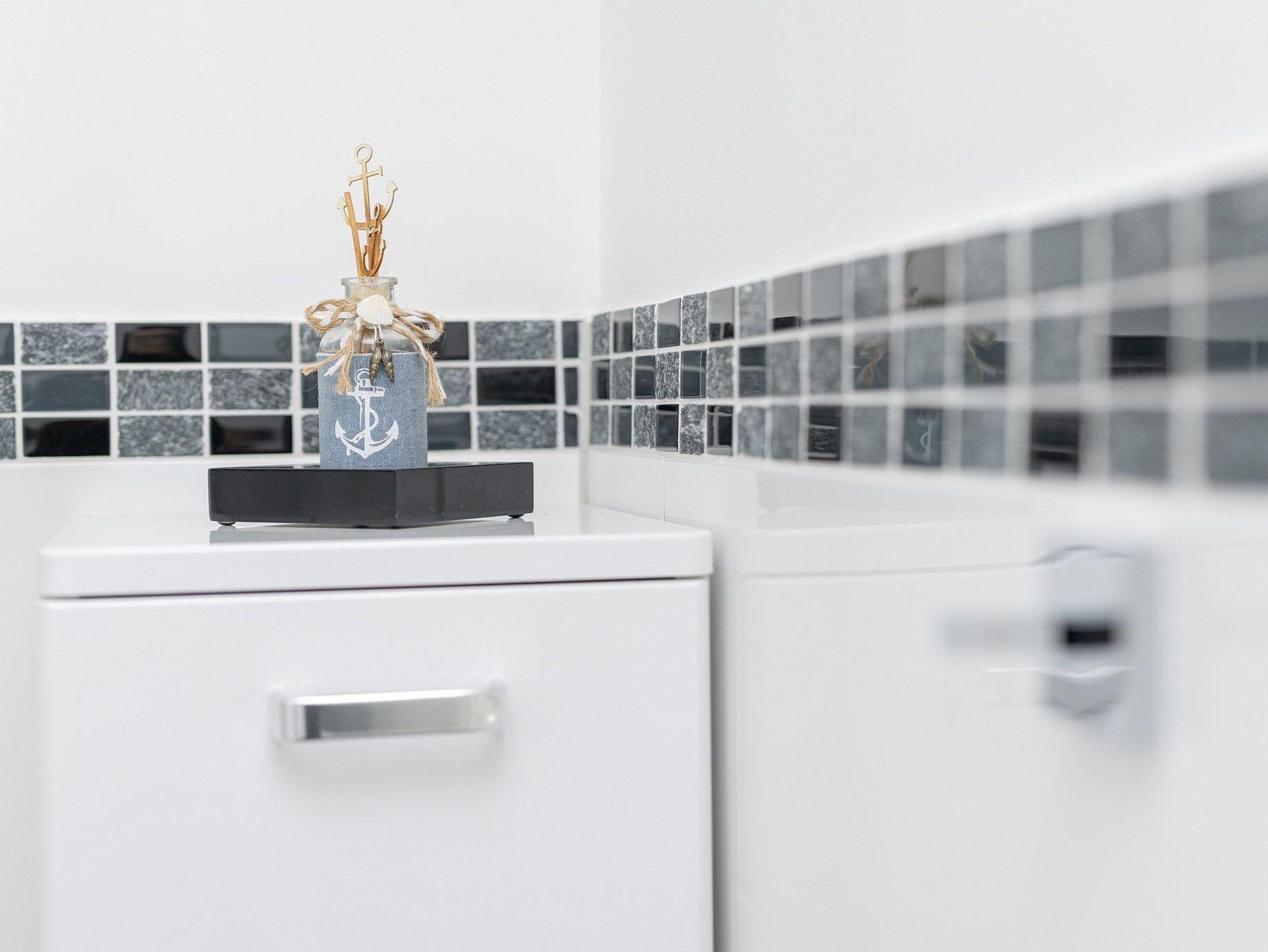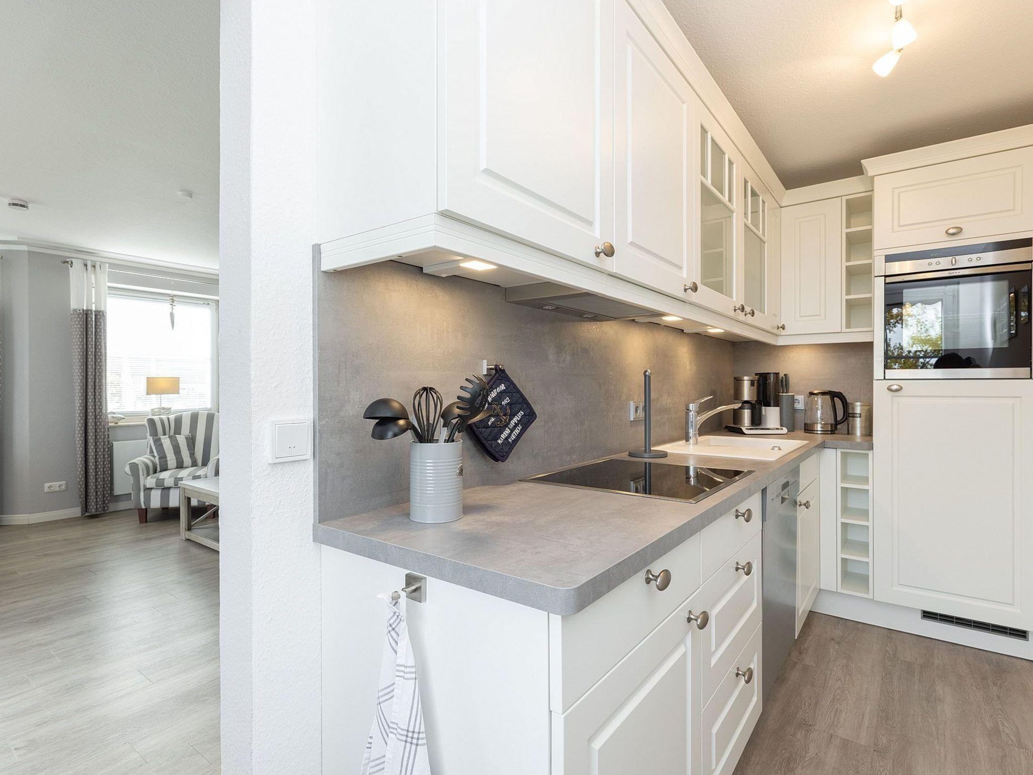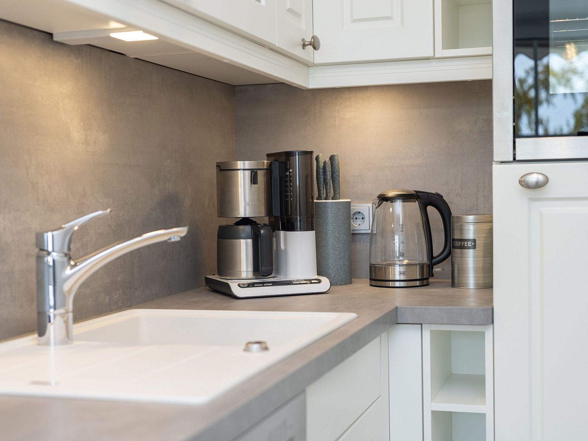 Die Küche ist komplett ausgestattet mit einem 4-Platten Cerankochfeld, einem Backofen, einer Spülmaschine und einem Kühlschrank. Ebenso stehen eine Kaffeemaschine, ein Toaster und ein Wasserkocher zur Verfügung.