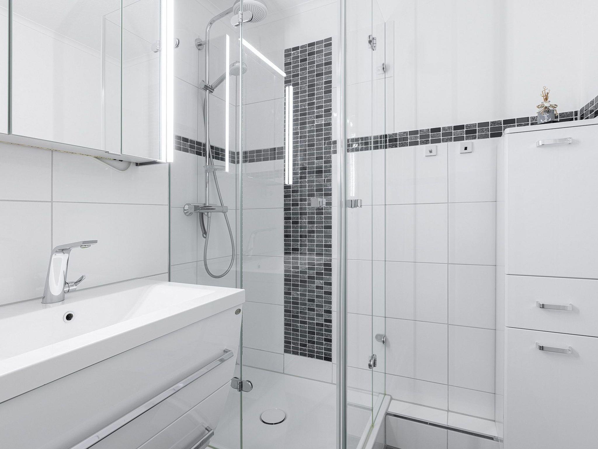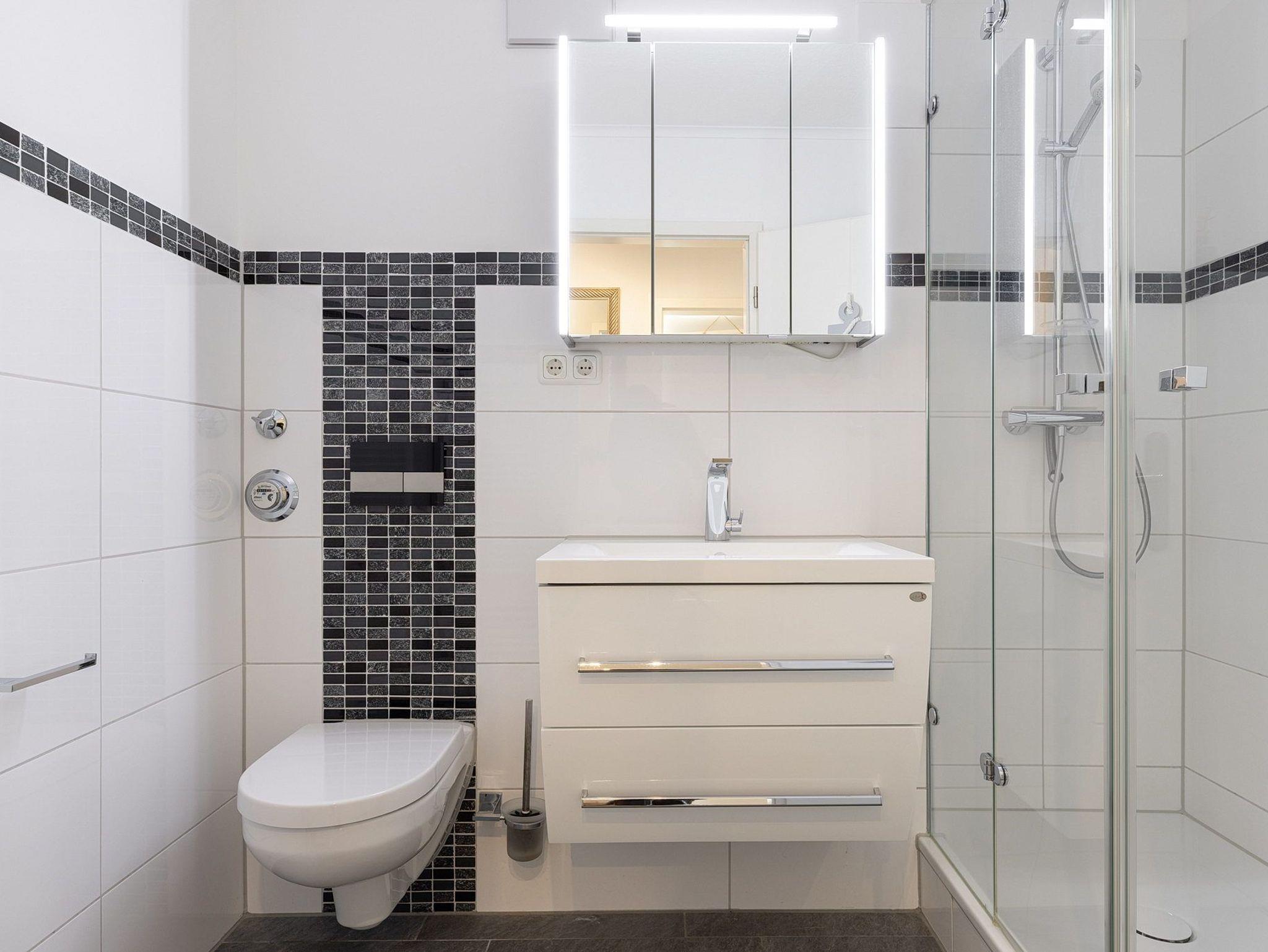 Helles modernes Bad mit Dusche, WC und Waschbecken.