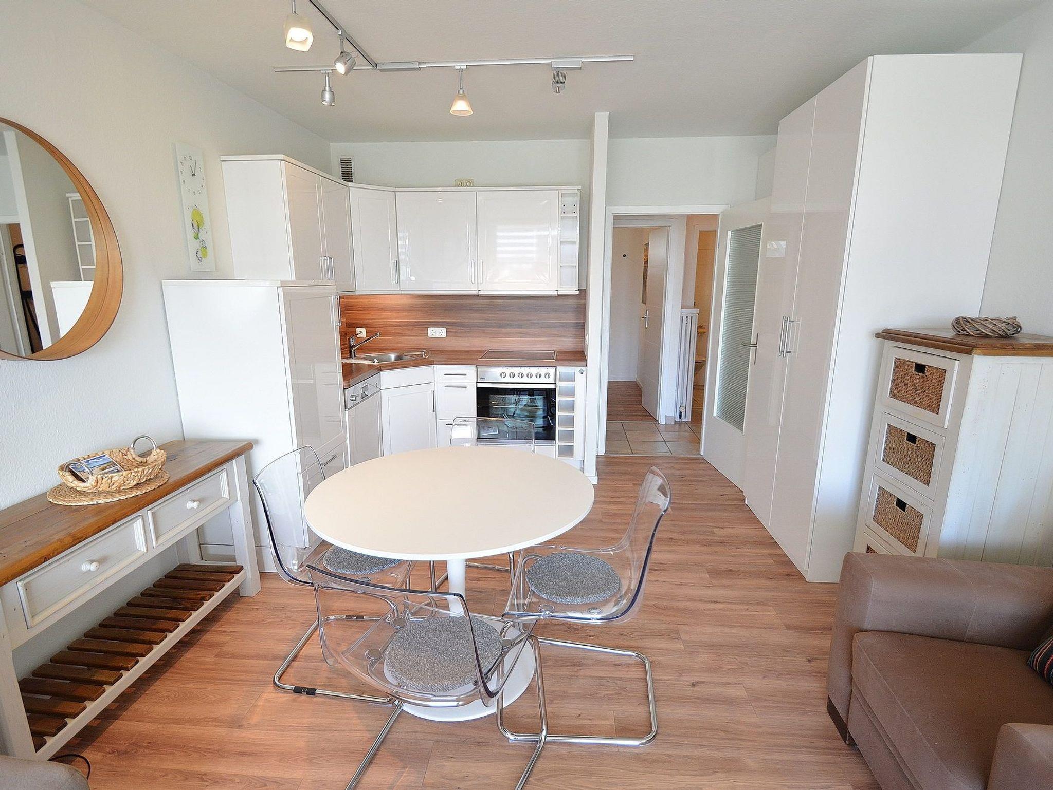 Kleine im Wohnbereich integrierte Küchenzeile mit 4-Platten-Cerankochfeld, Backofen Spülmaschine und Kühlschrank mit kleinem 3-Sterne Gefrierfach. Außerdem stehen ein Toaster, eine Kaffeemaschine und ein Wasserkocher zur Verfügung.