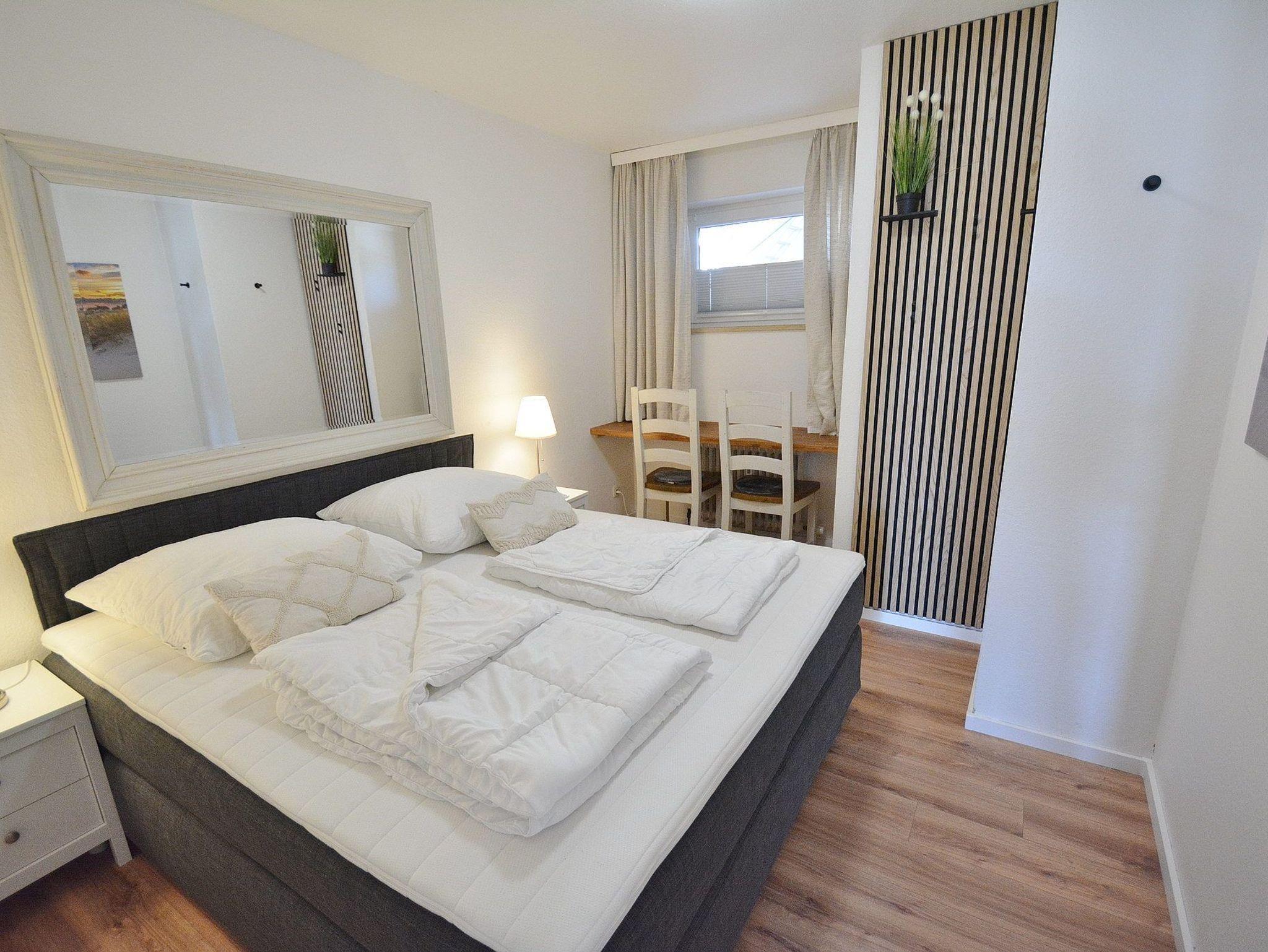 Das Schlafzimmer verfügt über ein Doppelbett (180x200cm). Ein 4-türiger Kleiderschrank befindet sich im Flurbereich.[nbsp][nbsp]Der Raum ist mit Linoleumboden ausgelegt, das Fenster lässt sich durch ein Plissee verdunkeln.