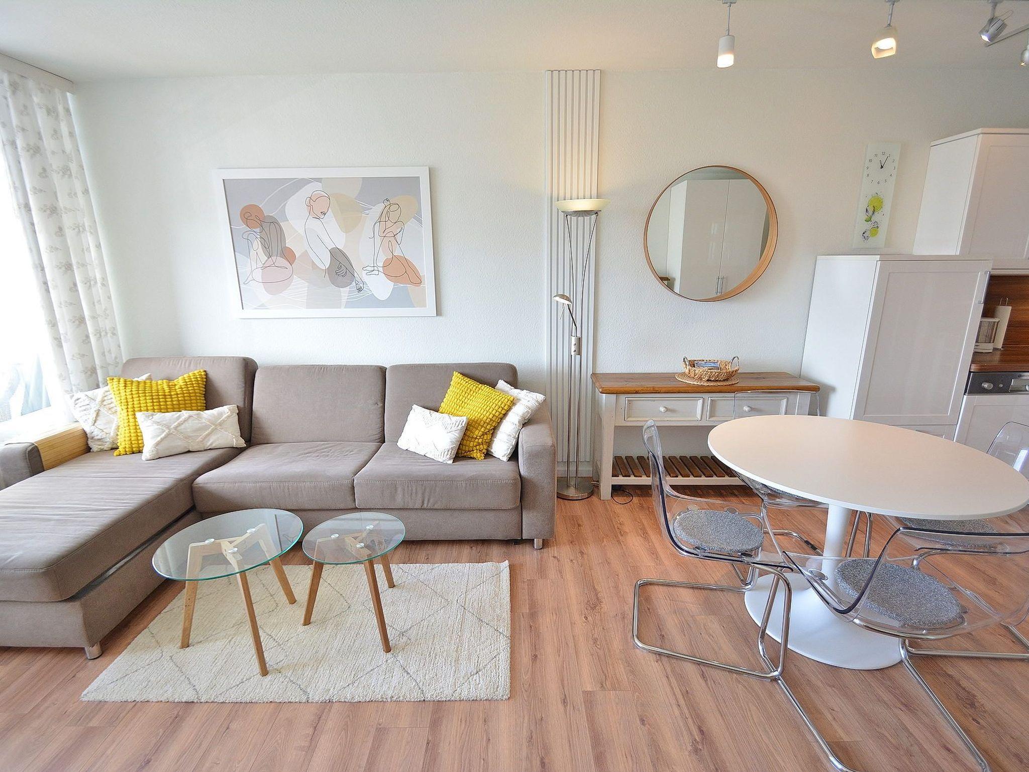 Der helle Wohnbereich mit direktem Zugang zum schönen Balkon mit Seeblick ist ausgestattet mit einer Eckcouch mit Schlaffunktion (140x200cm) und einem Esstisch. Zur Unterhaltung steht ein Flachbildfernseher zur Verfügung. Der Raum ist mit Linoleumboden ausgelegt, die Fenster lassen sich durch Vorhänge etwas verdunkeln.