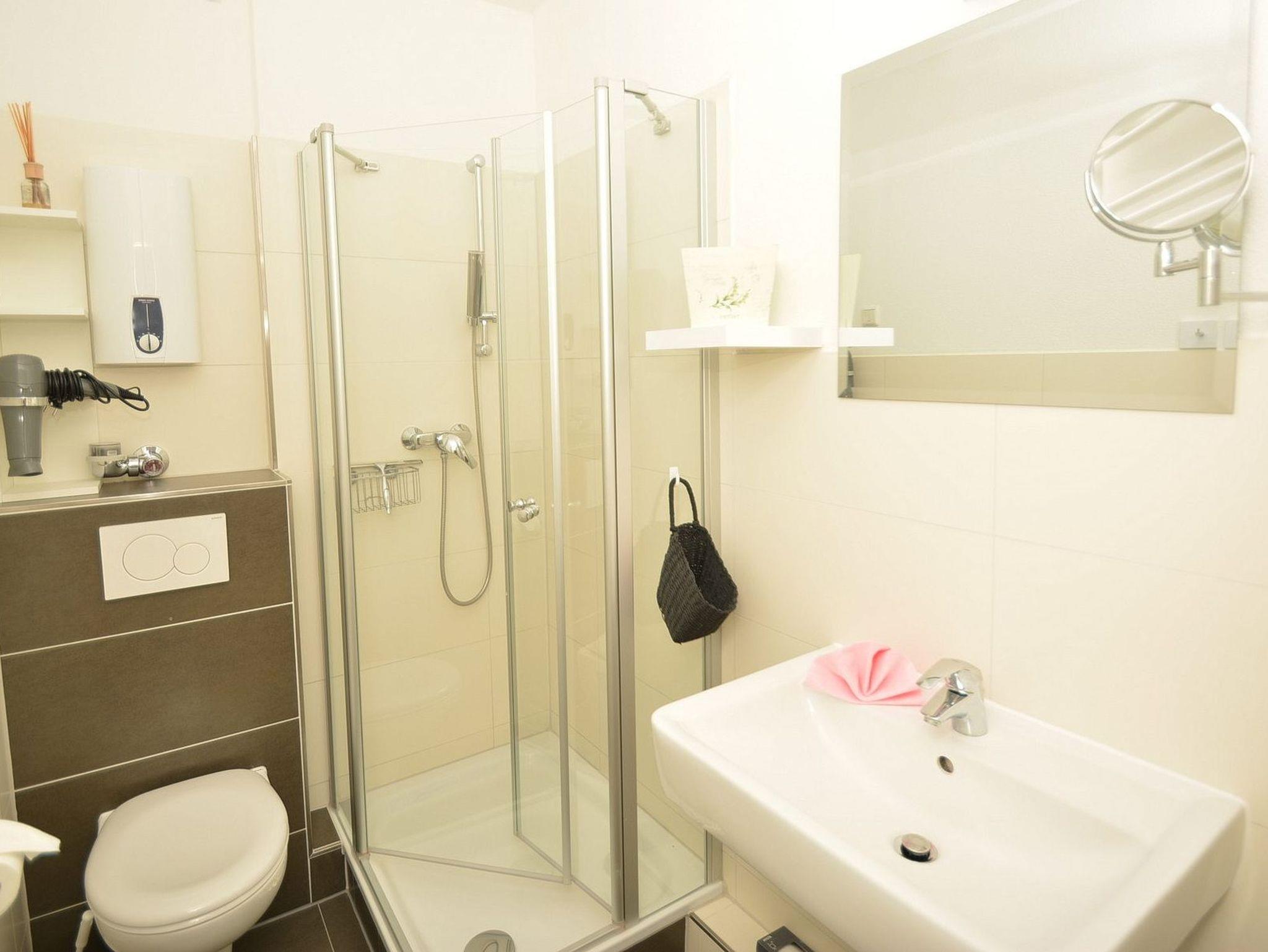 Modernes, hell gefliestes Bad mit Dusche, WC und Waschbecken.