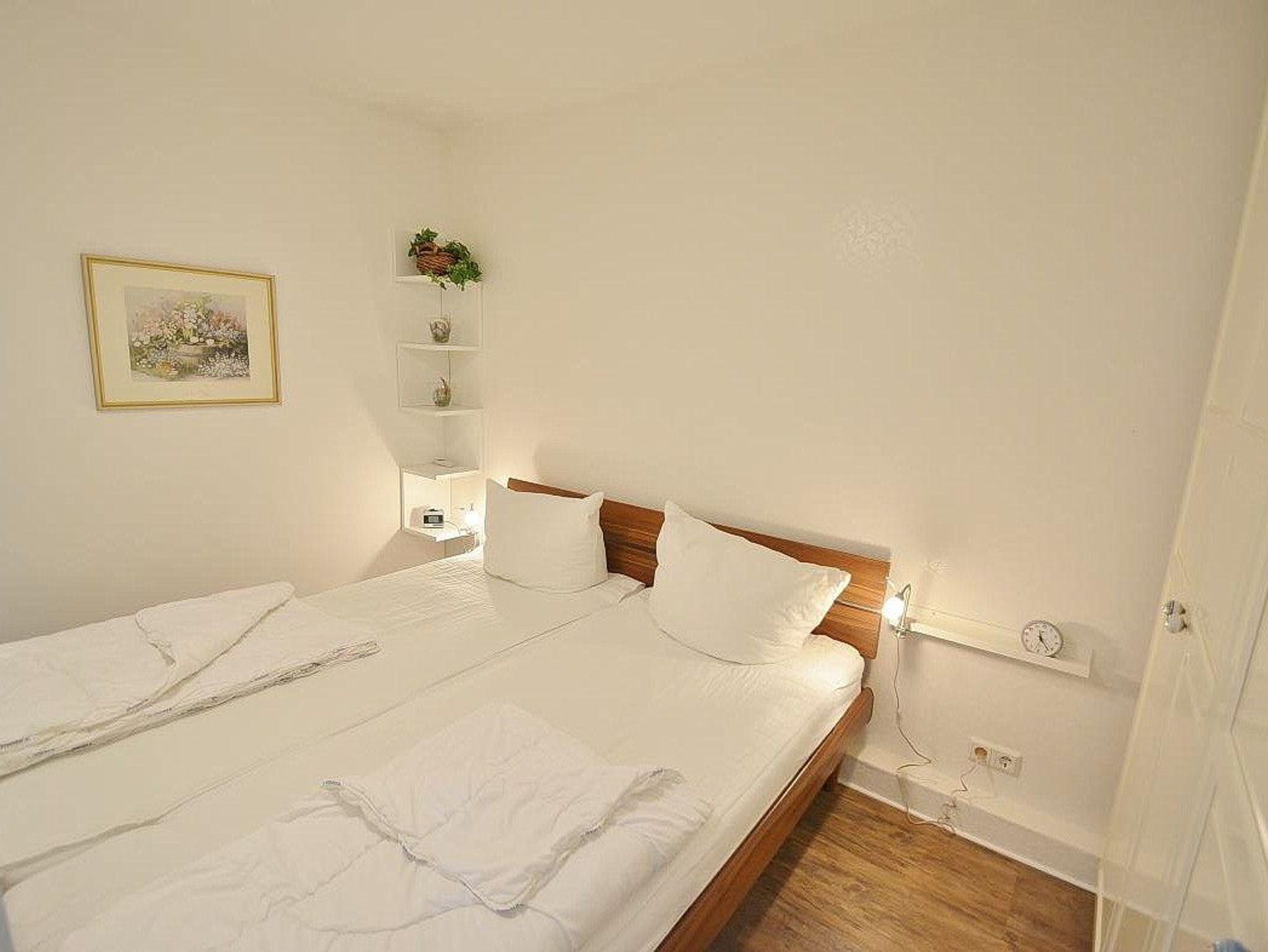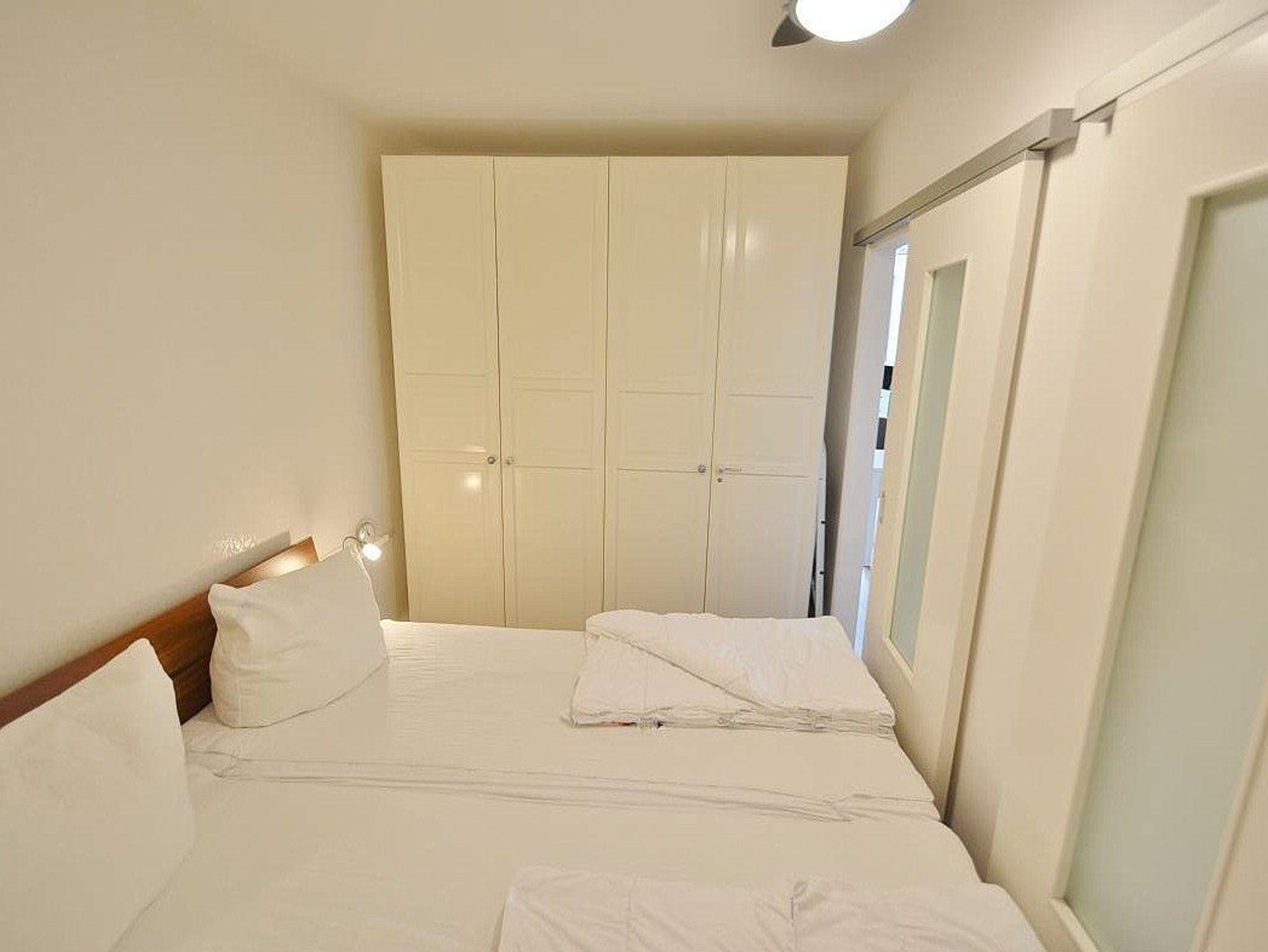 Modern eingerichtetes, kleines, innenliegendes Schlafzimmer mit einem Doppelbett (2x 90x200cm), einem Kleiderschrank sowie einem Deckenventilator. Das Schlafzimmer ist mit Designer-Vinylboden ausgelegt.
