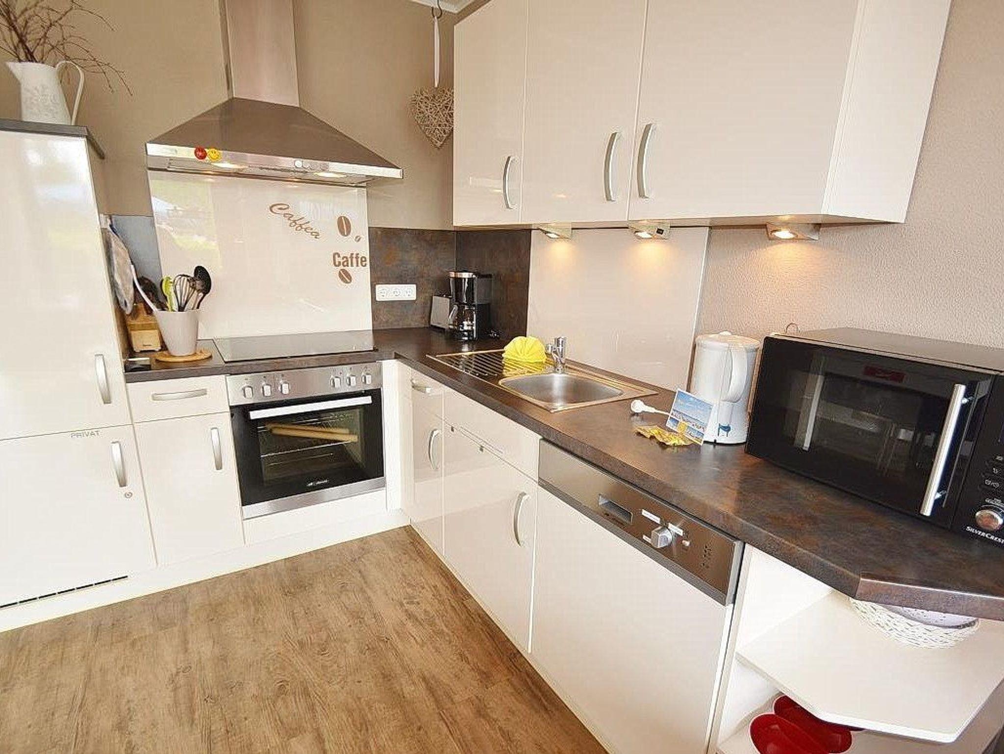 Moderne, komplett eingerichtete, zum Wohn- und Esszimmer offene Küche. Die Küche ist mit einem 4-Platten Cerankochfeld, einem Kühlschrank mit kleinem 3-Sterne Gefrierfach, einem Backofen sowie einer Spülmaschine ausgestattet. Des Weiteren stehen eine Mikrowelle, eine Kaffeemaschine, ein Toaster, ein Wasserkocher und ein Eierkocher zur Verfügung.