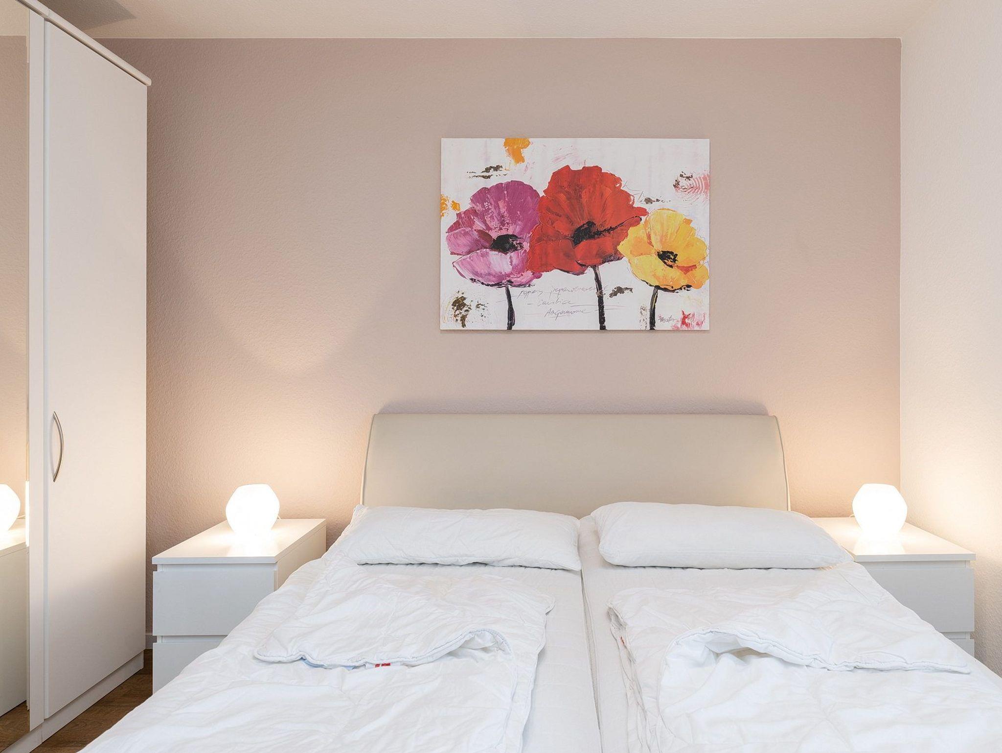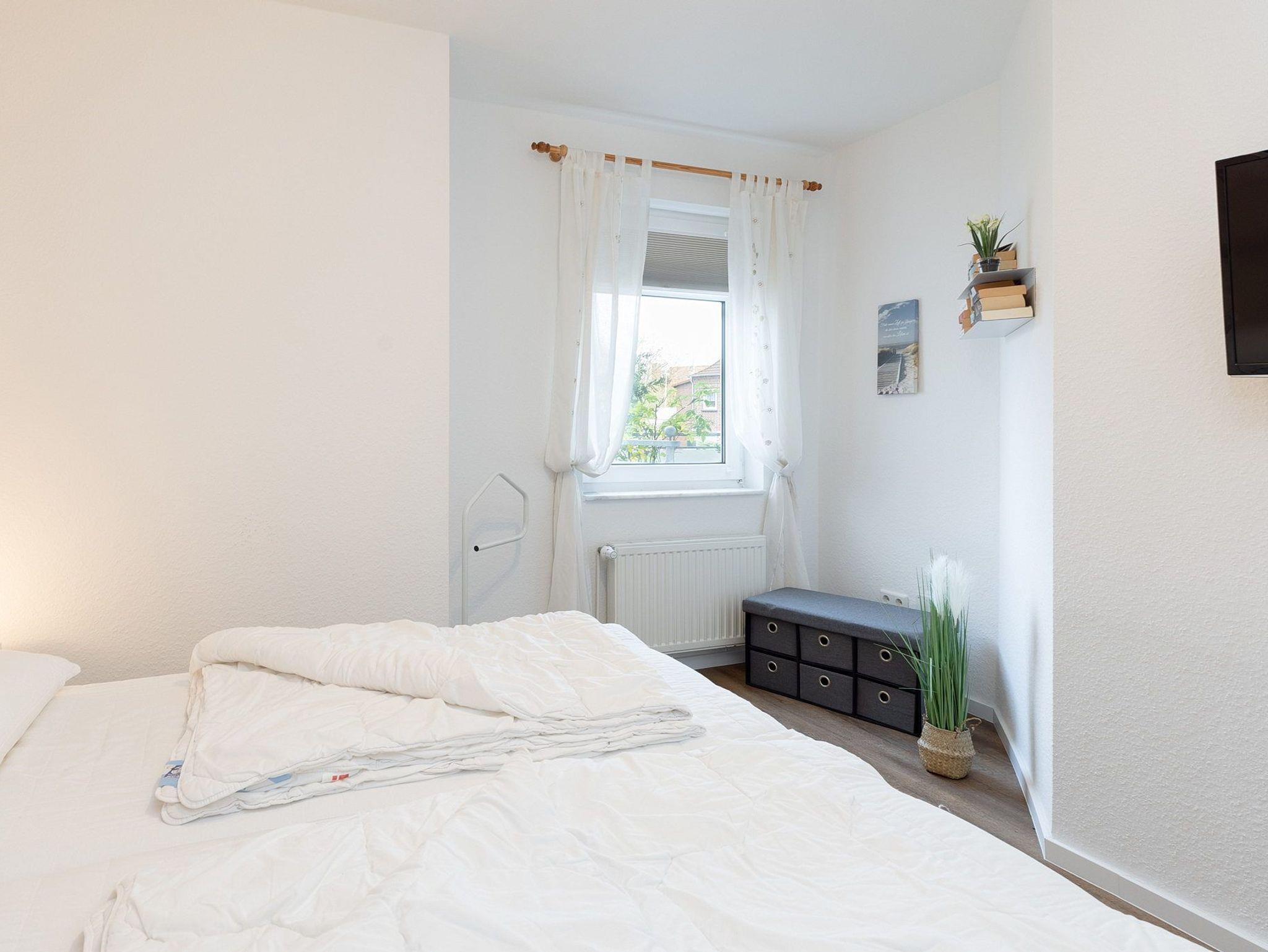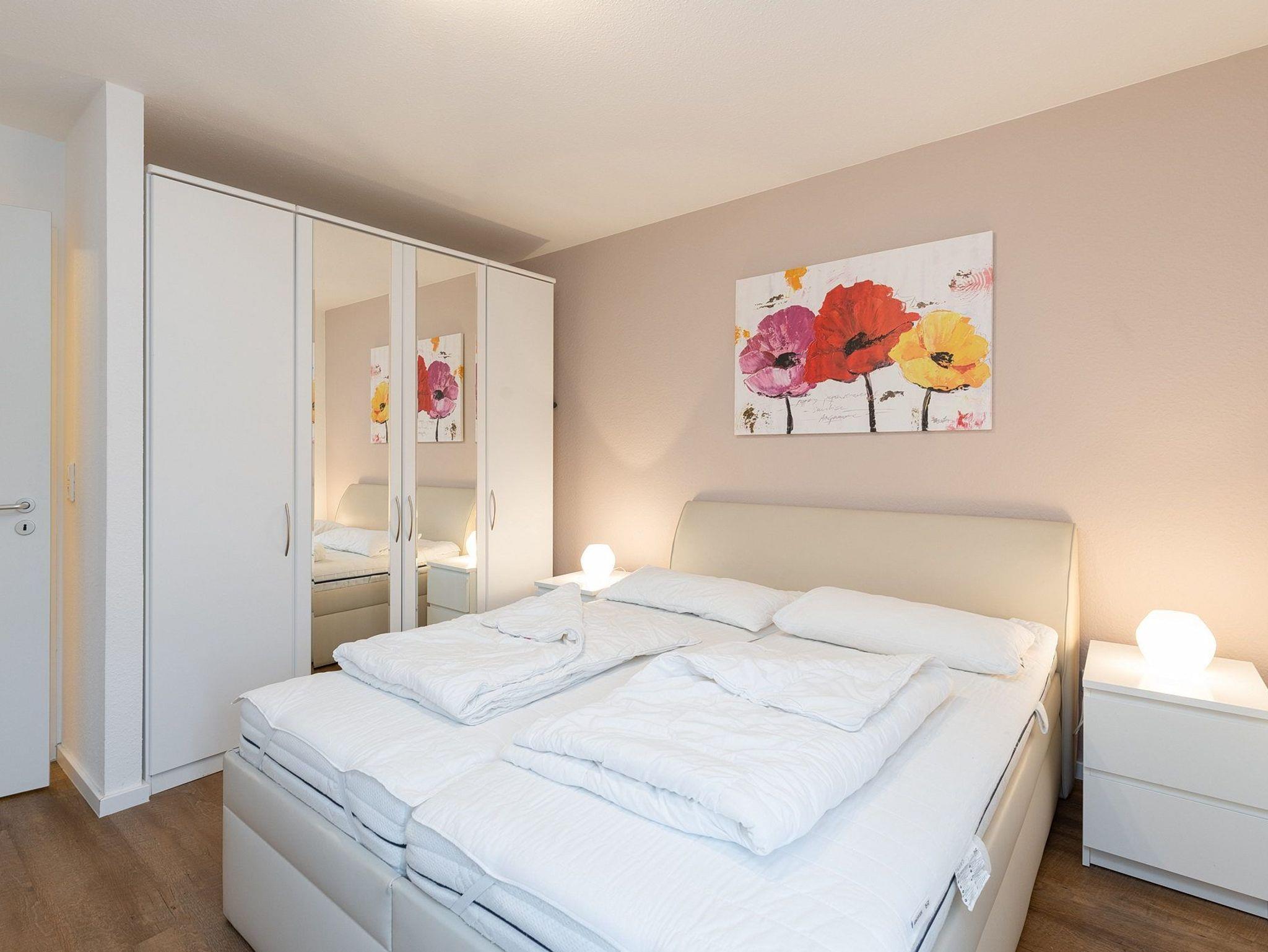 Das Schlafzimmer ist mit einem Doppelbett (2x80x200cm) und einem großen 4-türigen Kleiderschrank ausgestattet. Auch hier steht ein wandmontierter verstellbarer TV zur Unterhaltung bereit. Der Schlafbereich ist mit Vinyl Planken ausgelegt und lässt sich durch ein Plissee verdunkeln.