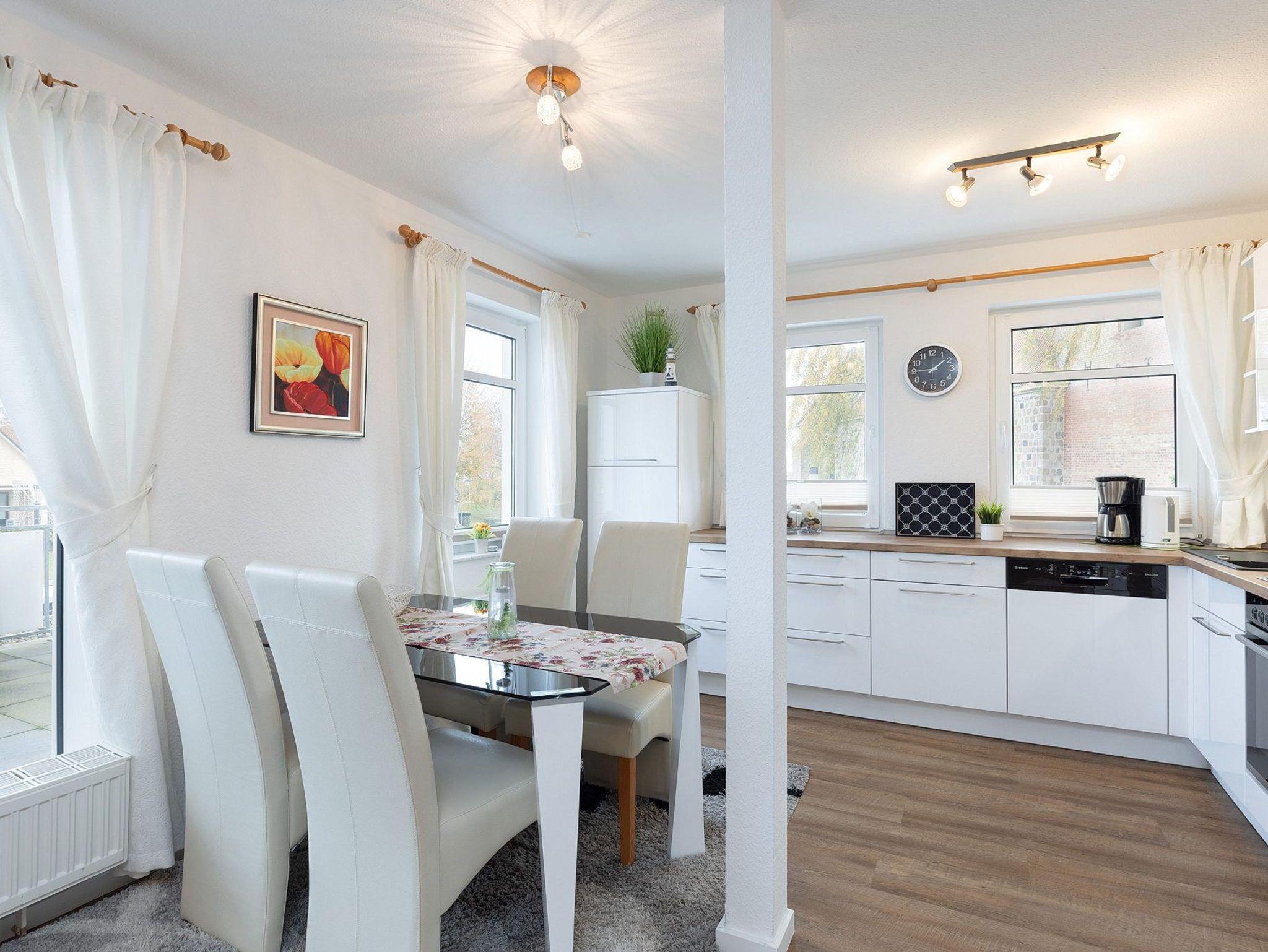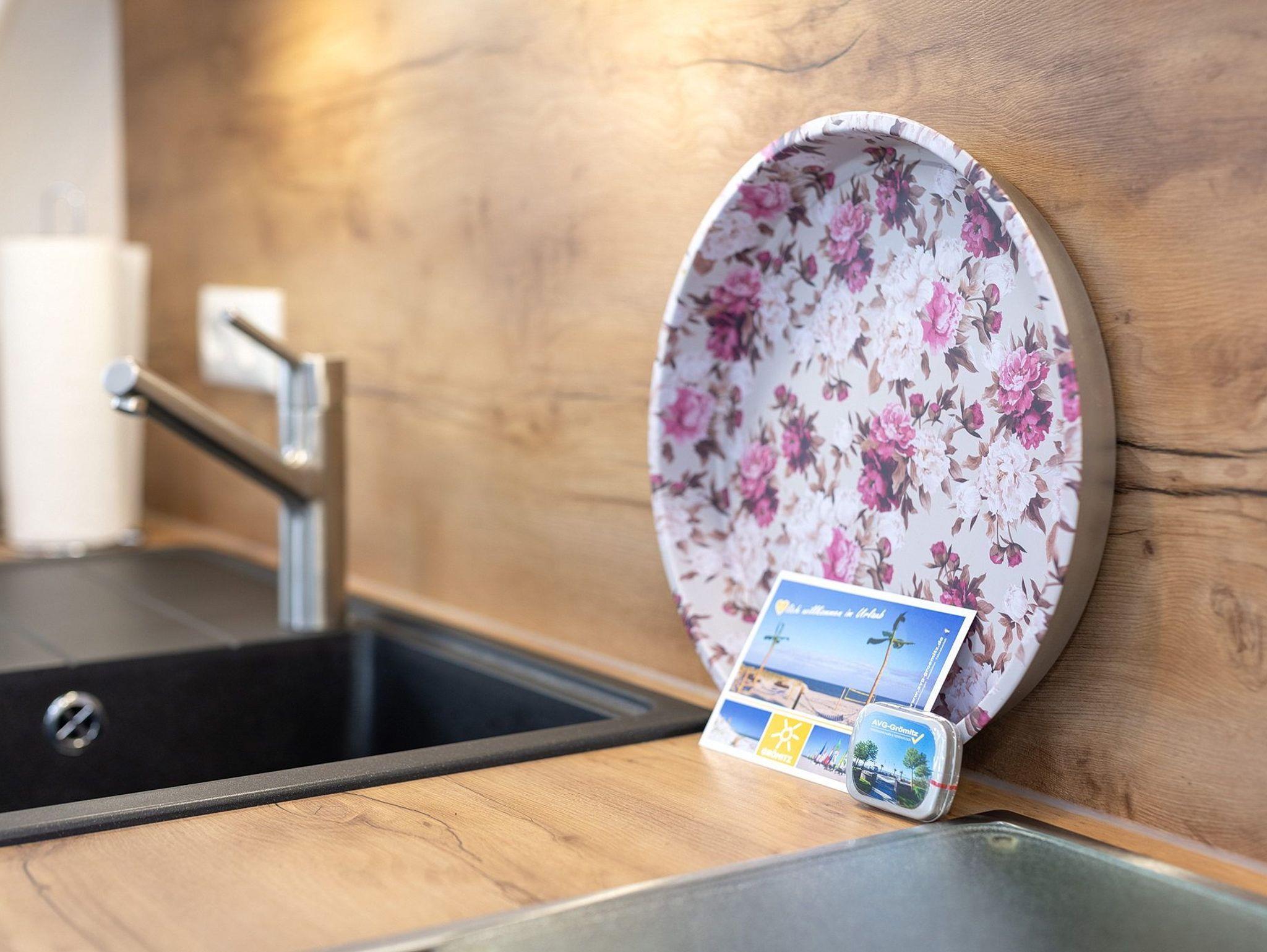 Komplett ausgestattete offene Küche mit 4-Platten-Cerankochfeld, Backofen, Spülmaschine, Kühlschrank und einem großen Gefrierfach. Eine Kaffeemaschine, ein Wasserkocher, eine Mikrowelle und ein Toaster stehen ebenfalls zur Verfügung.