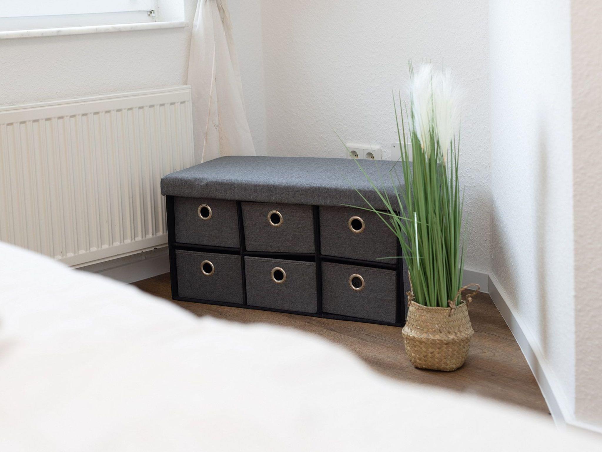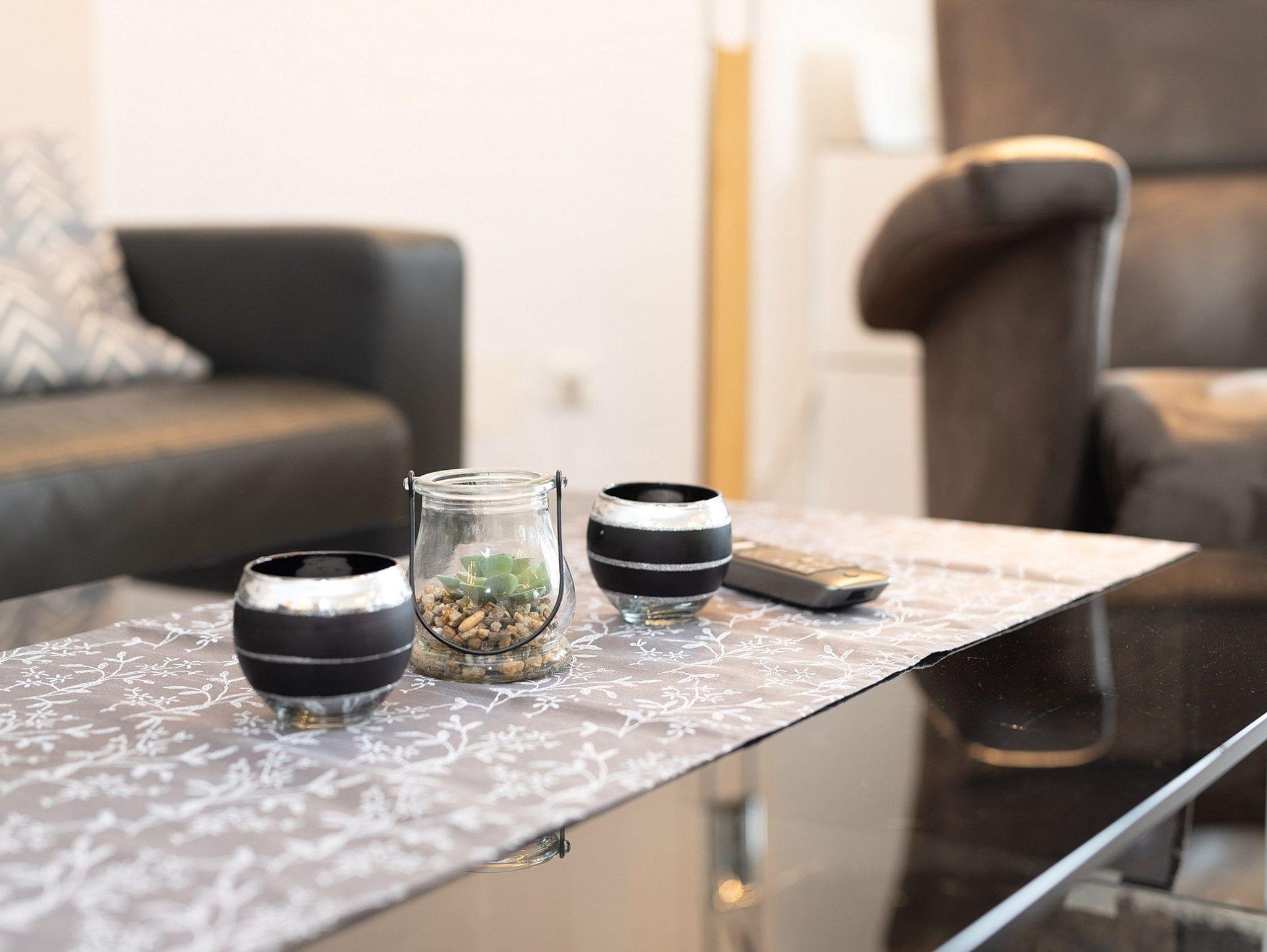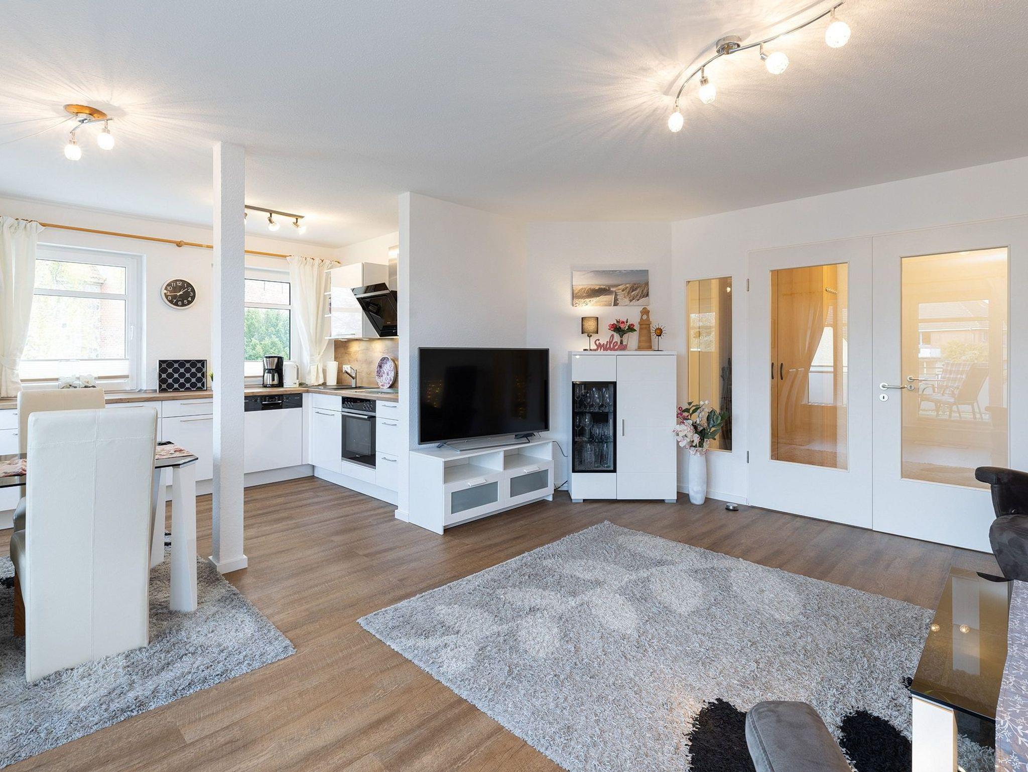 Heller, freundlicher, großzügiger Wohn- und Essbereich mit direktem Zugang zum Balkon. Der Raum verfügt über ein hochwertiges Lederschlafsofa (140x200cm), 2 Relax-Sessel sowie einen Essplatz für 4 Personen. Zur Unterhaltung stehen ein 55-Zoll Smart-TV und ein Internet-Radio zur Verfügung. Der Wohnbereich ist mit Vinyl Planken ausgelegt und lässt sich durch Plissees blickdicht verdunkeln.