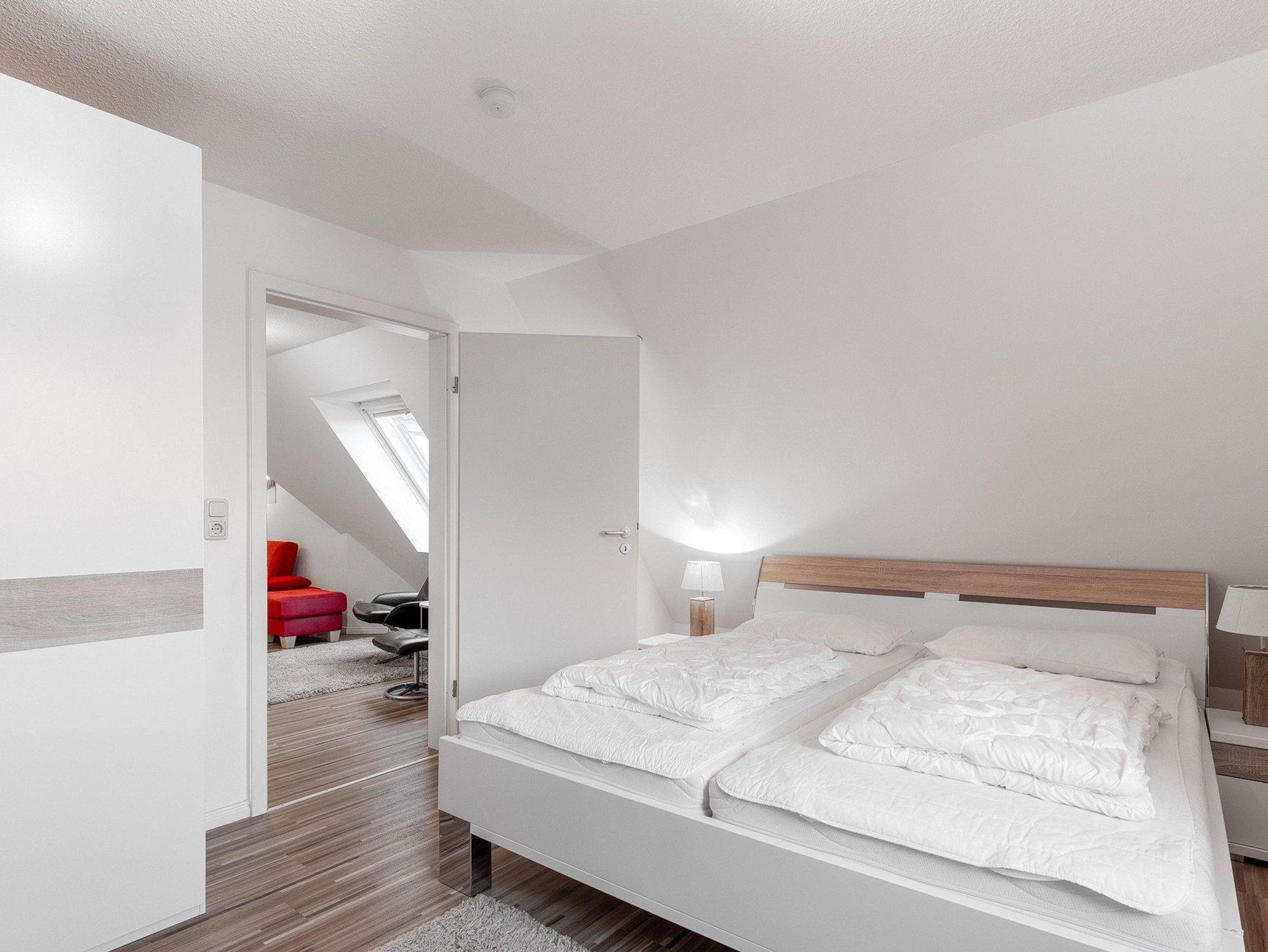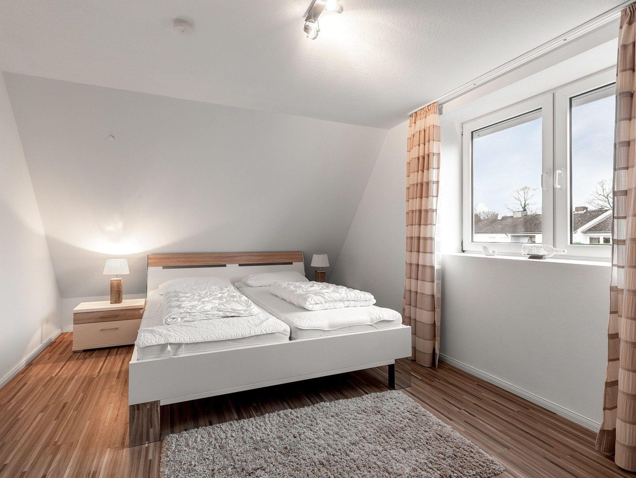 Separates, modern ausgestattetes 2. Schlafzimmer mit einem Doppelbett (2x 80x200cm), einem Nachttisch und einem 2-türigem Kleiderschrank ausgestattet. Die Fenster lassen sich durch Innenrollos blickdicht verdunkeln. Das Zimmer ist mit Designer-Planken ausgelegt.