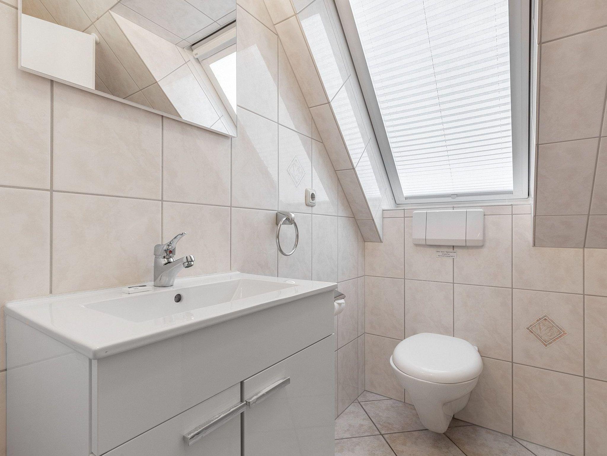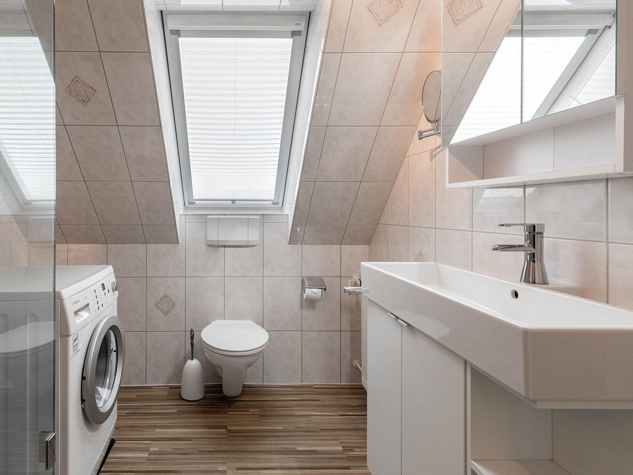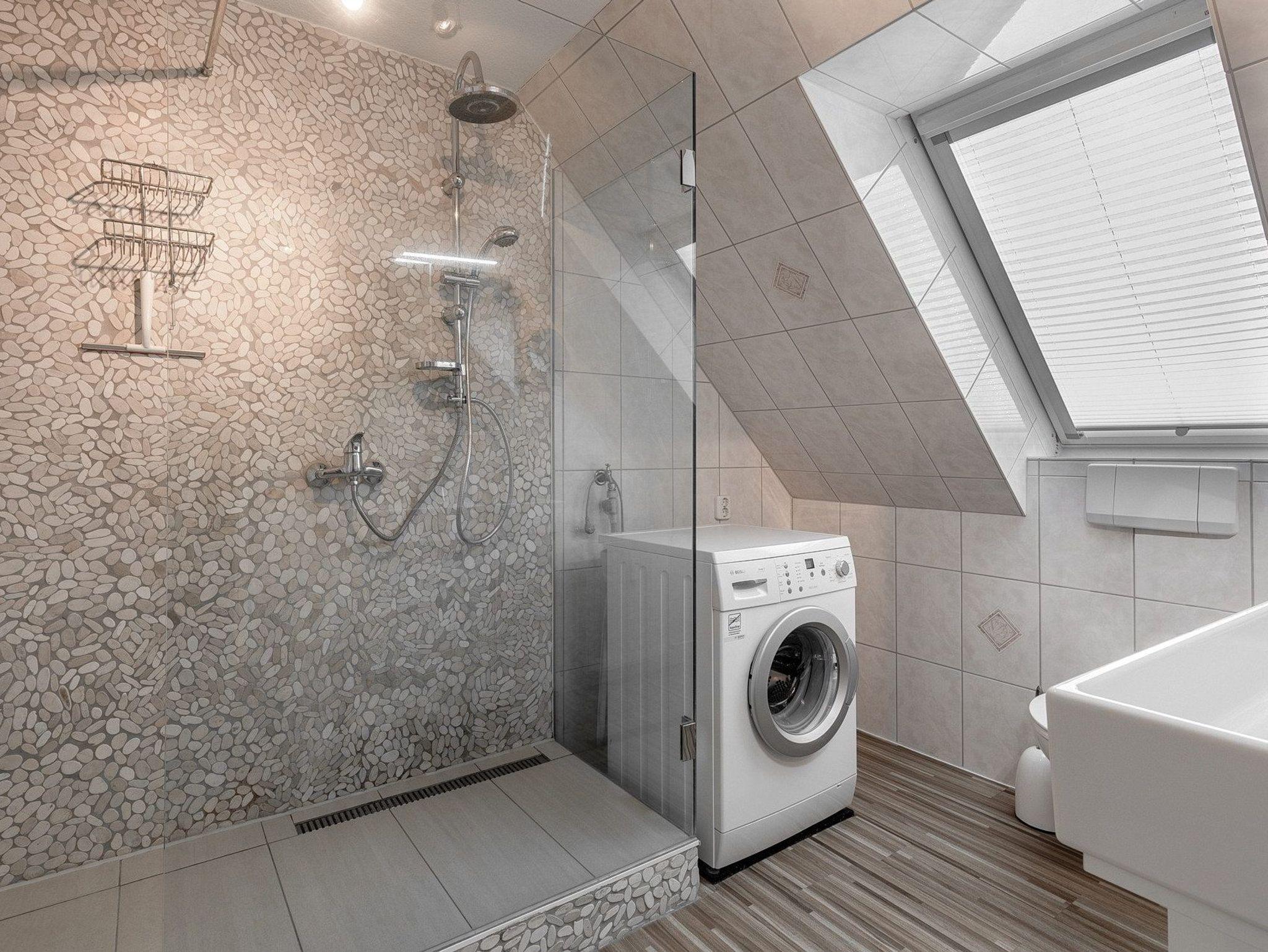 Modernes, hell gefliestes Tageslichtbad mit Dusche, WC und Waschbecken. Eine Waschmaschine steht zur kostenlosen Nutzung bereit. Separate, zusätzliche Toilette mit Fenster.
