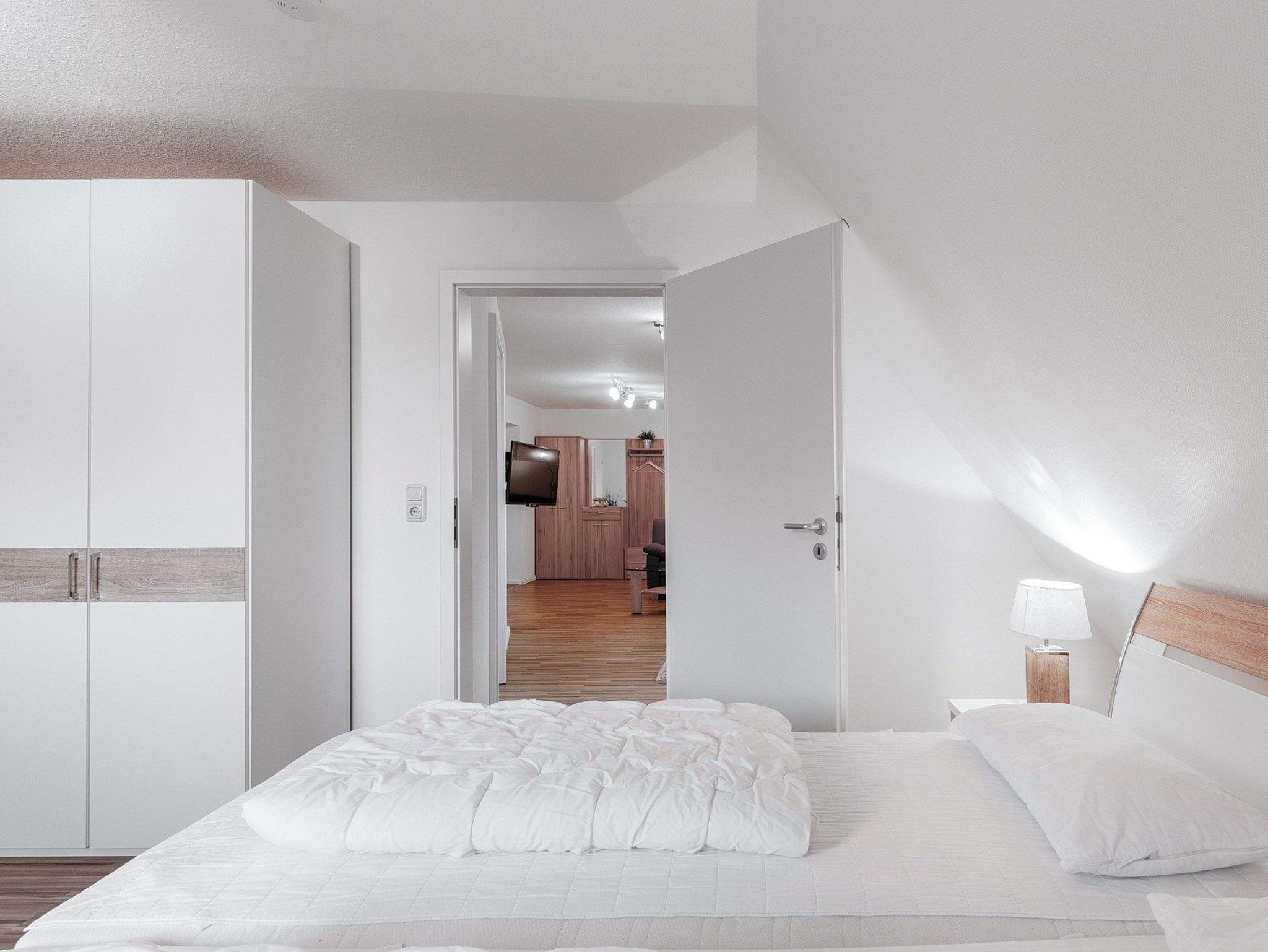 Separates, modern ausgestattetes Schlafzimmer in nördliche Richtung. Das Schlafzimmer ist mit einem Doppelbett (2x 90x200cm mit verstellbaren Lattenrosten), 2 Nachttischen, einem Smart-TV Fernseher (Empfang über Internet) und einem 3-türigen Kleiderschrank ausgestattet. Das Schlafzimmer ist mit Designerplanken ausgelegt. Das Fenster lässt sich durch einen Vorhang und einen elektrischen Außenrolladen blickdicht verdunkeln.