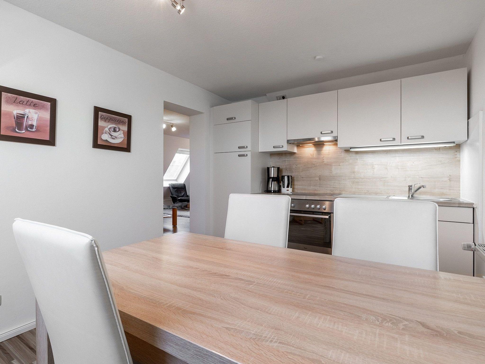 Moderne, komplett ausgestattete Wohnküche mit einem Essplatz für 4 Personen. Die Küche ist mit einem 4-Platten Cerankochfeld, einem Backofen, einer Spülmaschine, einem Kühlschrank mit kleinem 3-Sterne Gefrierfach, einem Toaster, einem Wasserkocher und einer Kaffeemaschine ausgestattet.