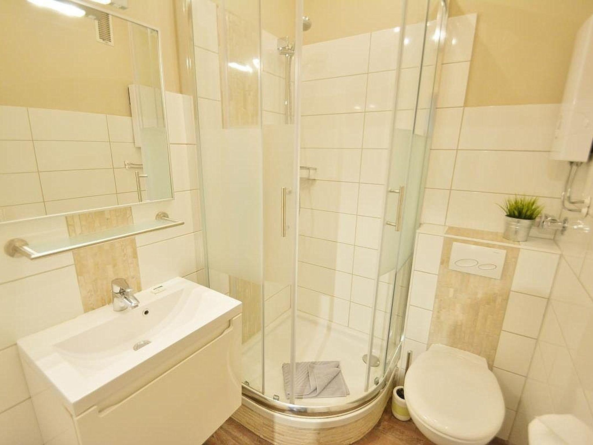 Modernes, freundliches, hell gefliestes Bad mit Dusche, Toilette und Waschbecken.