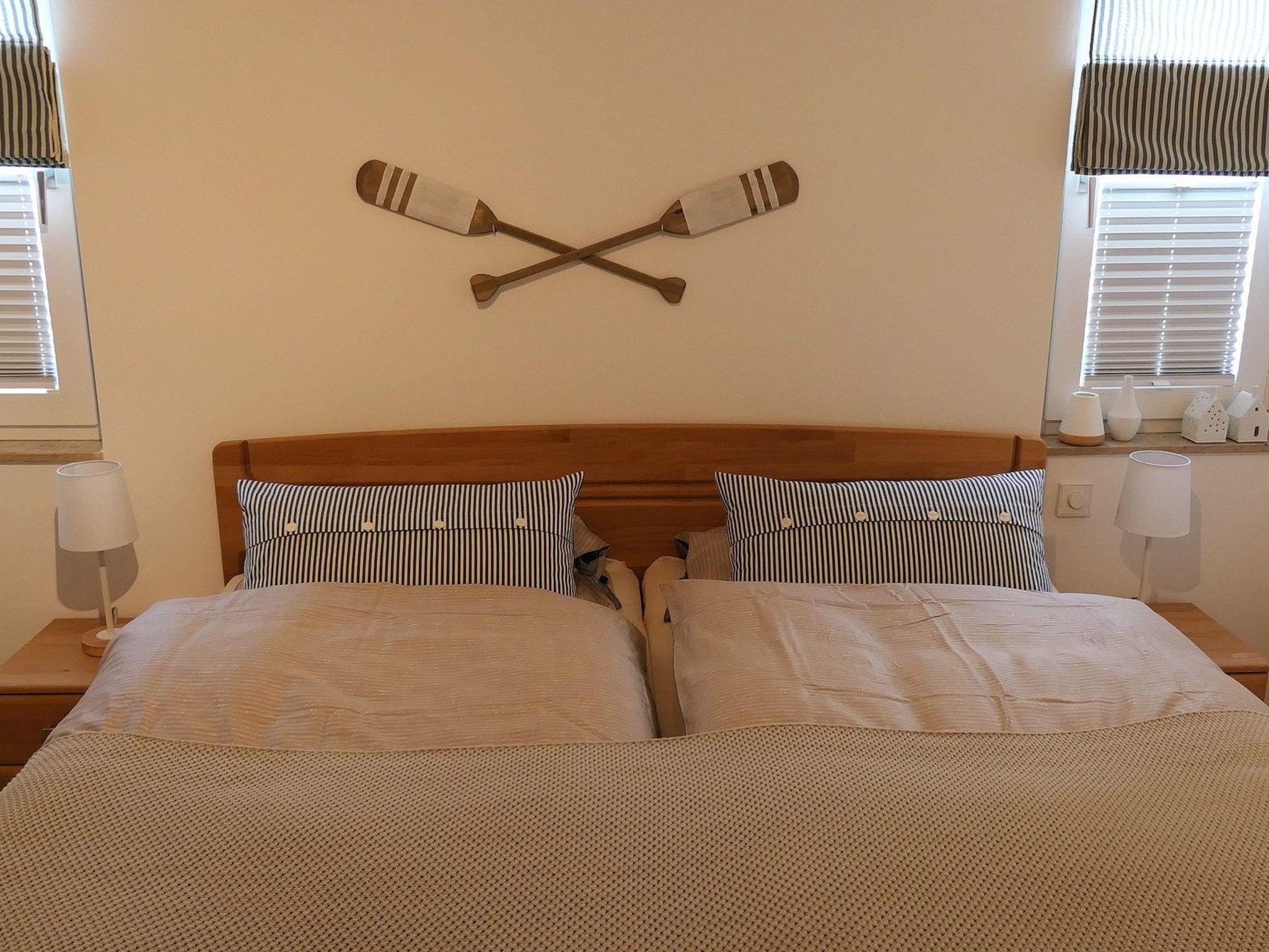Das freundliche Schlafzimmer ist mit einem Doppelbett (2x90x200cm) und einem Kleiderschrank ausgestattet. Das Schlafzimmer ist mit einem hochwertigen Vinylboden ausgelegt. Das Schlafzimmer lässt sich etwas verdunkeln.