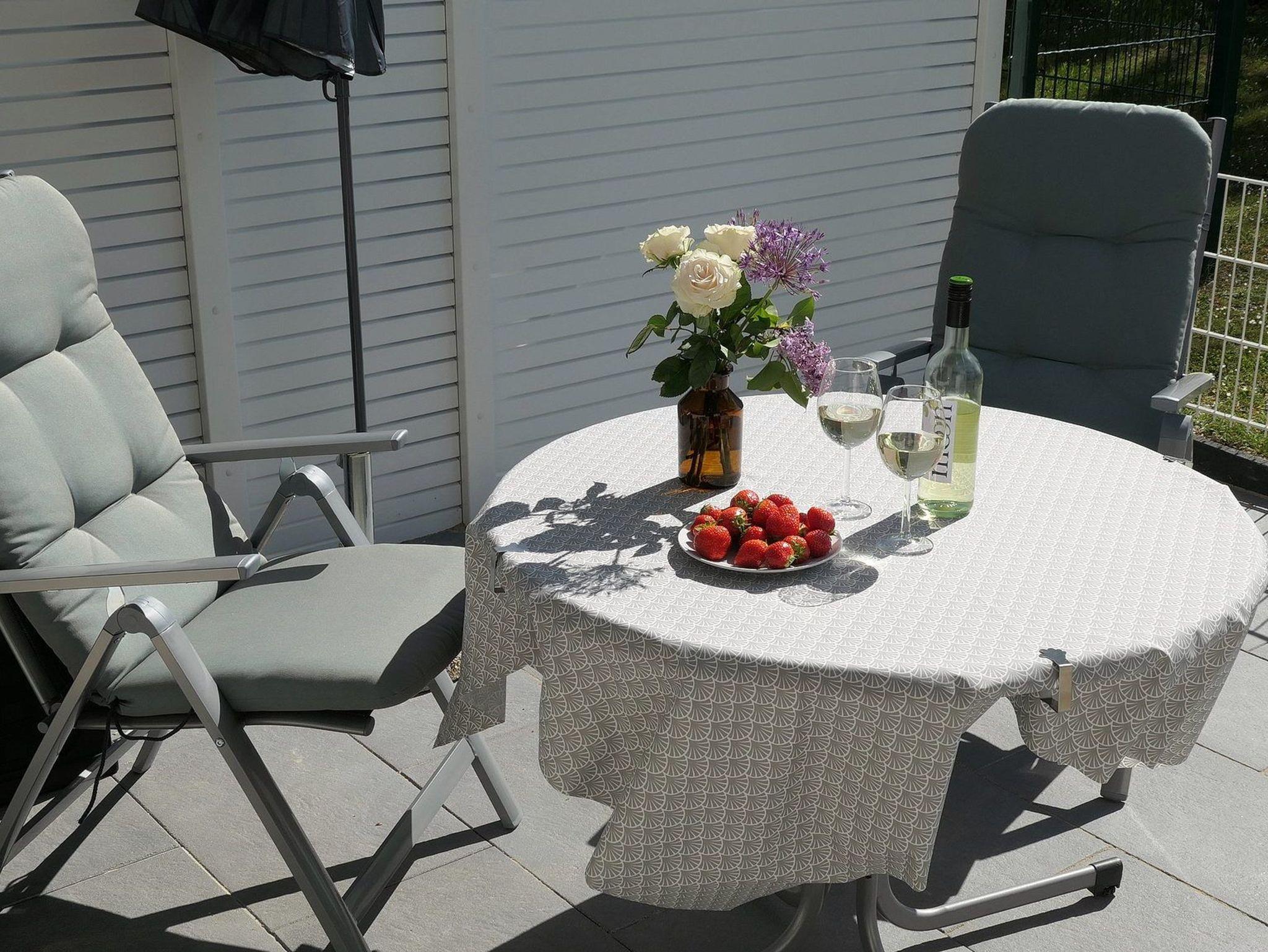 Terrasse in südliche Richtung mit Teilseeblick. Eigener PKW-Stellplatz vor dem Haus. Gegen Gebühr:[nbsp] Waschmaschine, Trockner, Tischfußball. Direkter Strandzugang über eine steile Treppe.