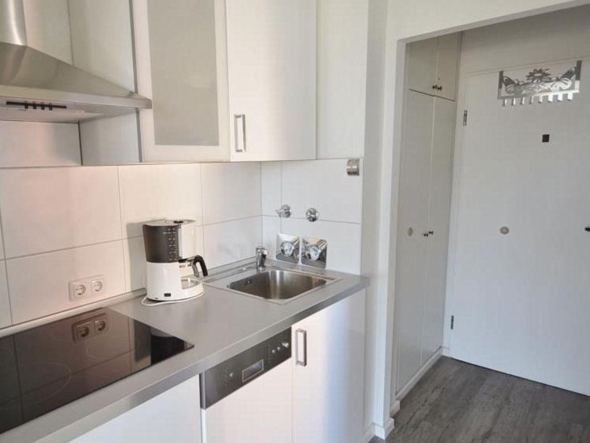 Komplett ausgestattete Küchenzeile mit 4-Platten-Cerankochfeld, Spülmaschine und Kühlschrank mit kleinem Gefrierfach. Eine Kaffeemaschine, ein Wasserkocher und ein Toaster stehen ebenfalls zur Verfügung.