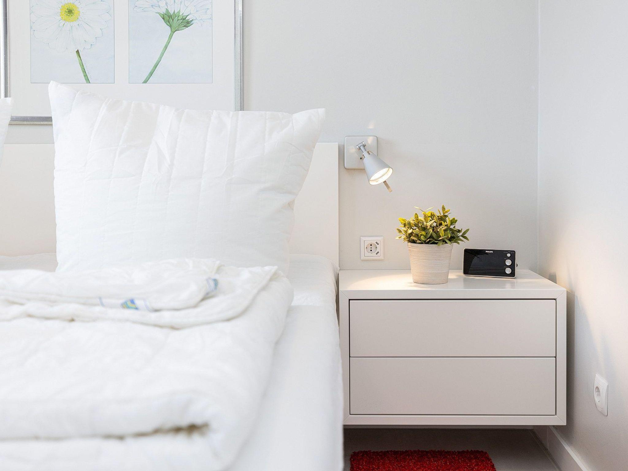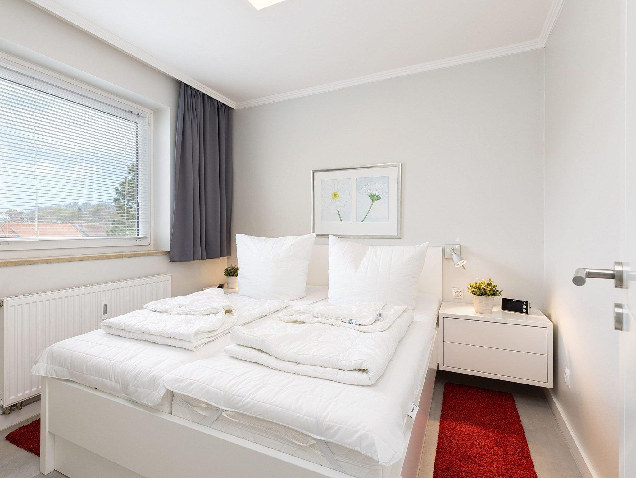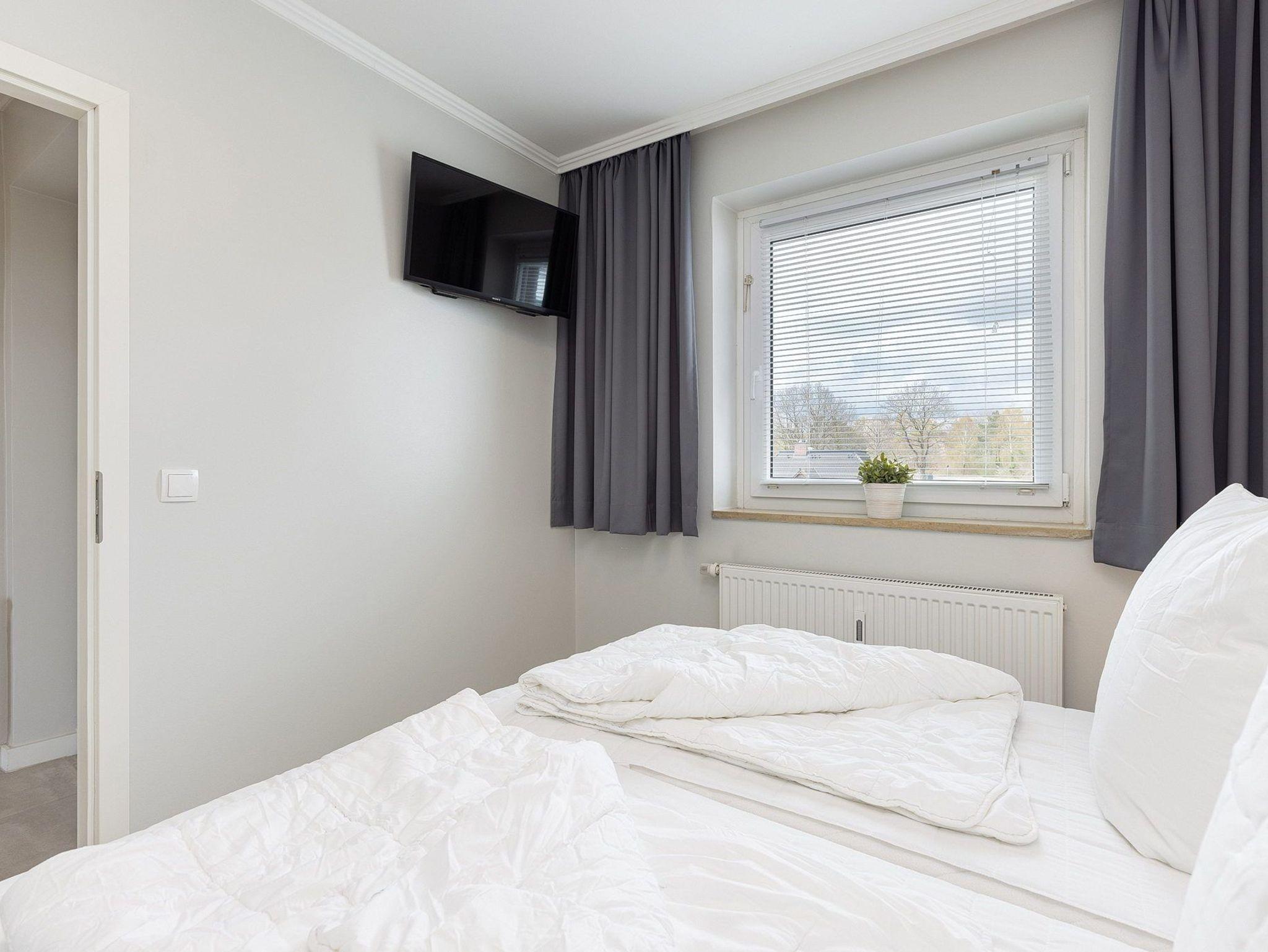 Kleines Schlafzimmer mit einem Doppelbett (je 80x190cm), Fernseher und Kleiderschrank. Der Raum ist gefliest, das Fenster lässt sich durch einen Vorhang verdunkeln.