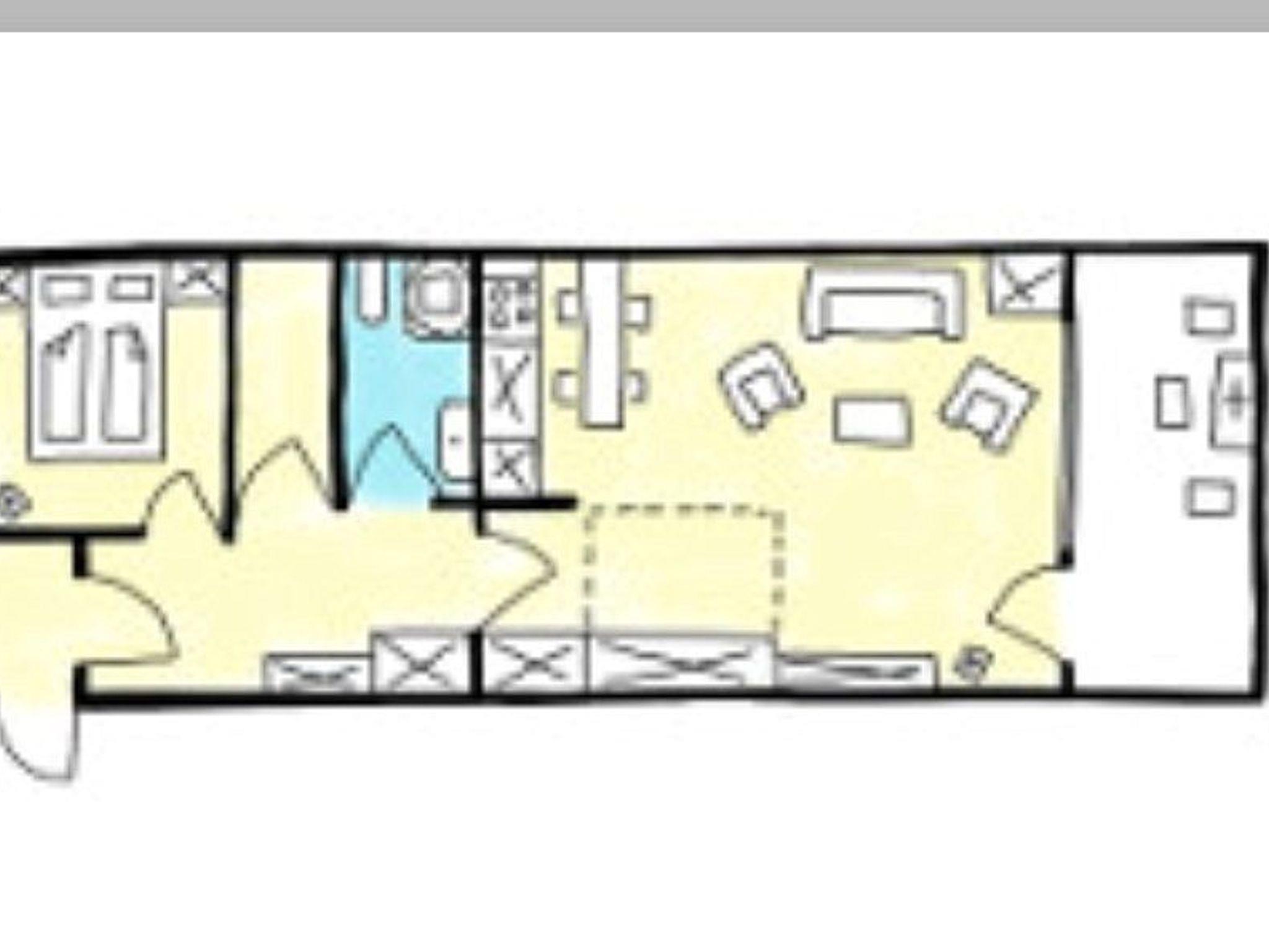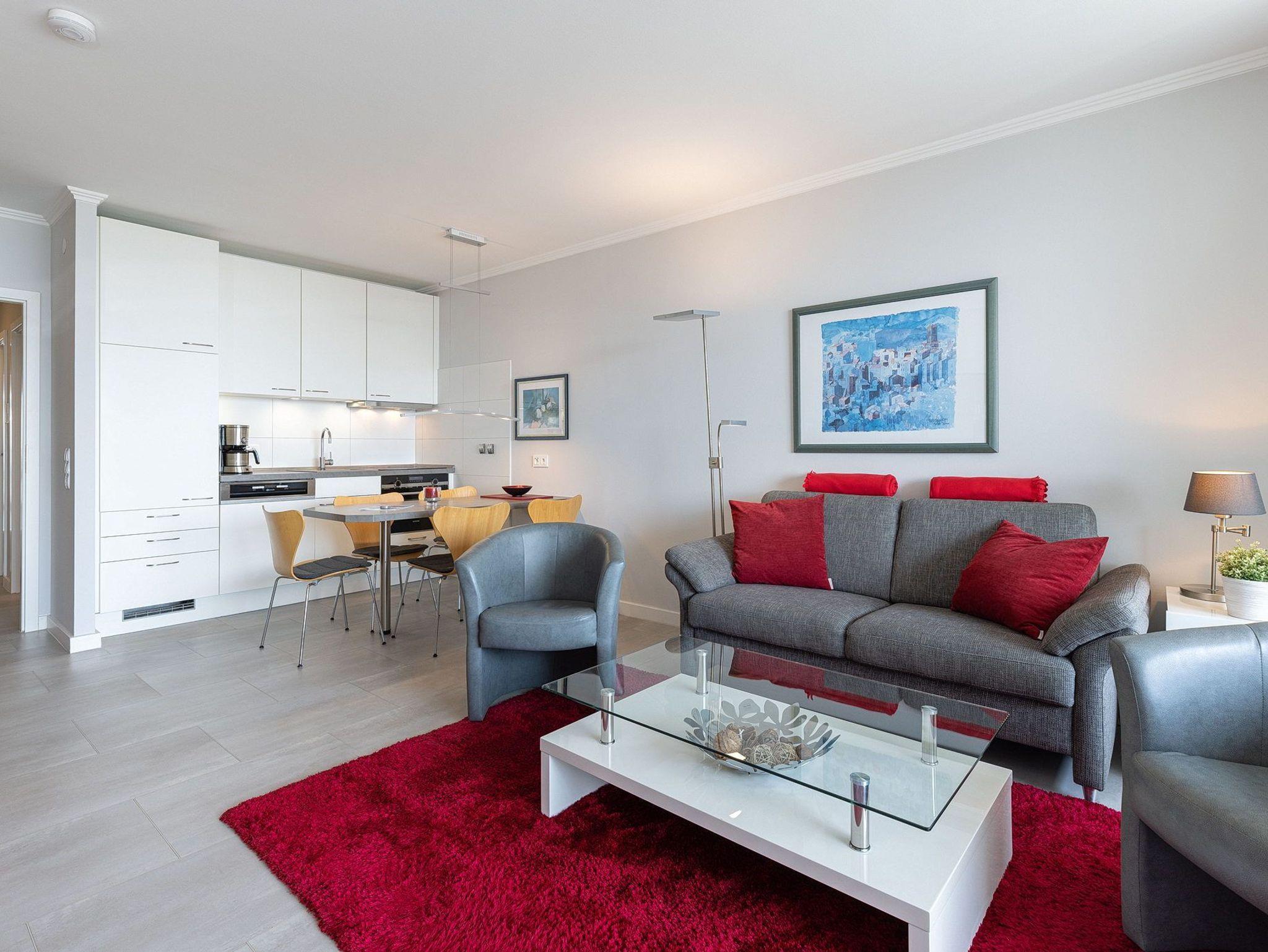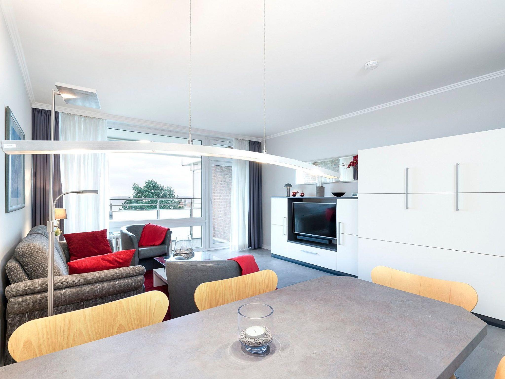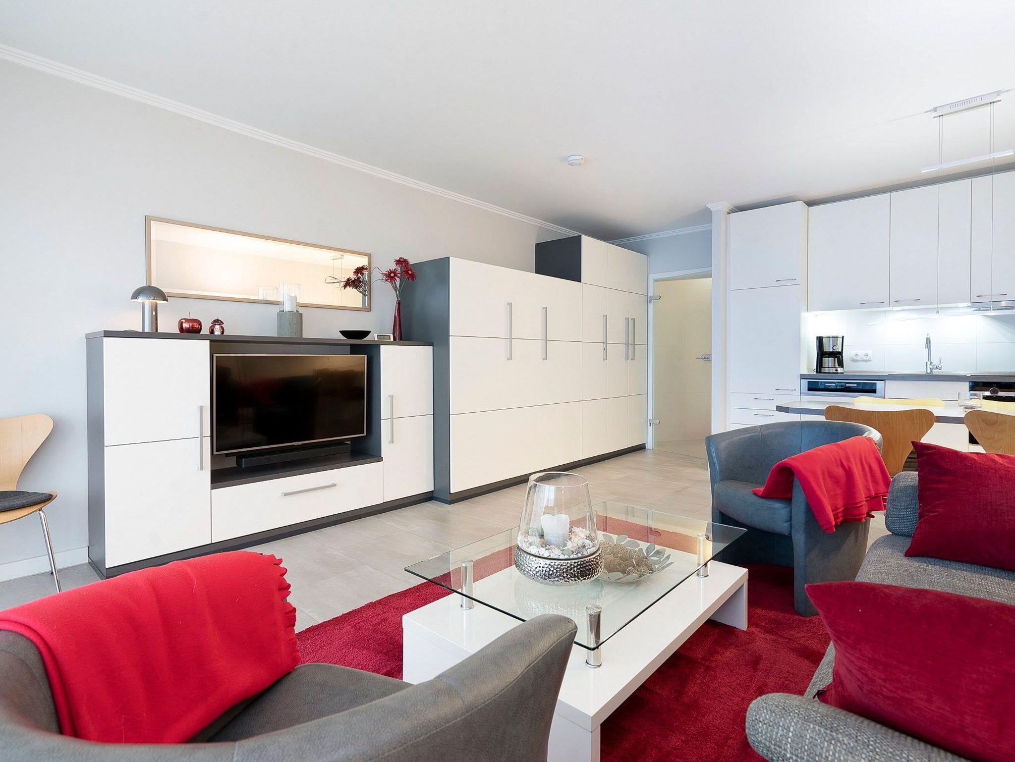 Das helle freundliche Wohnzimmer mit direktem Zugang zum Balkon ist ausgestattet mit einem 2er Sofa, einem Sessel, einem Schrankbett (2x 60x190cm) sowie einem Essplatz für 4 Personen. Zur Unterhaltung steht ein Flachbildfernseher und Radio zur Verfügung. Der Raum ist hell gefliest, das Fenster lässt sich durch einen Vorhang etwas verdunkeln.