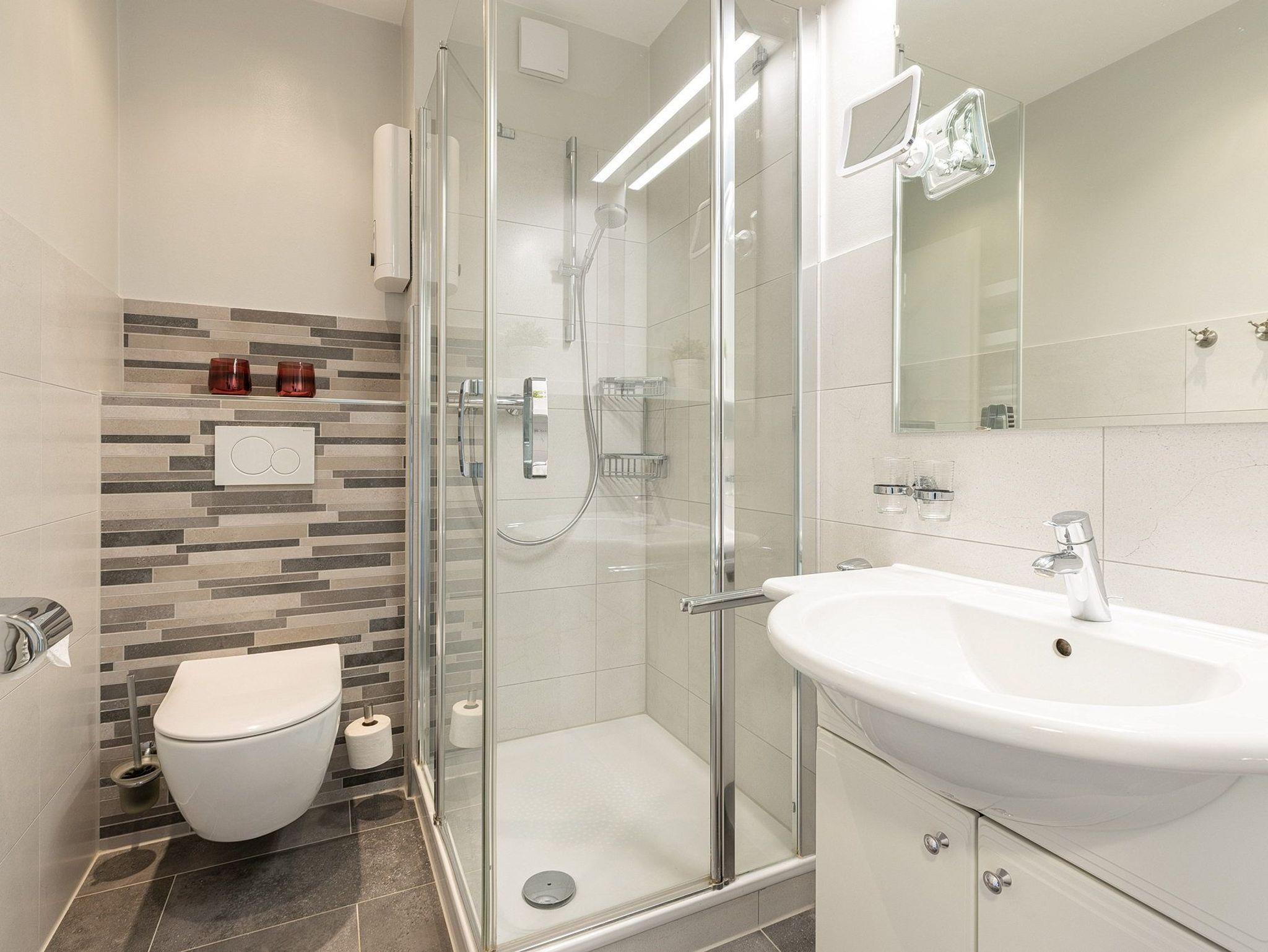 Kleines hellgefliestes Badezimmer mit Dusche, WC und Waschbecken.