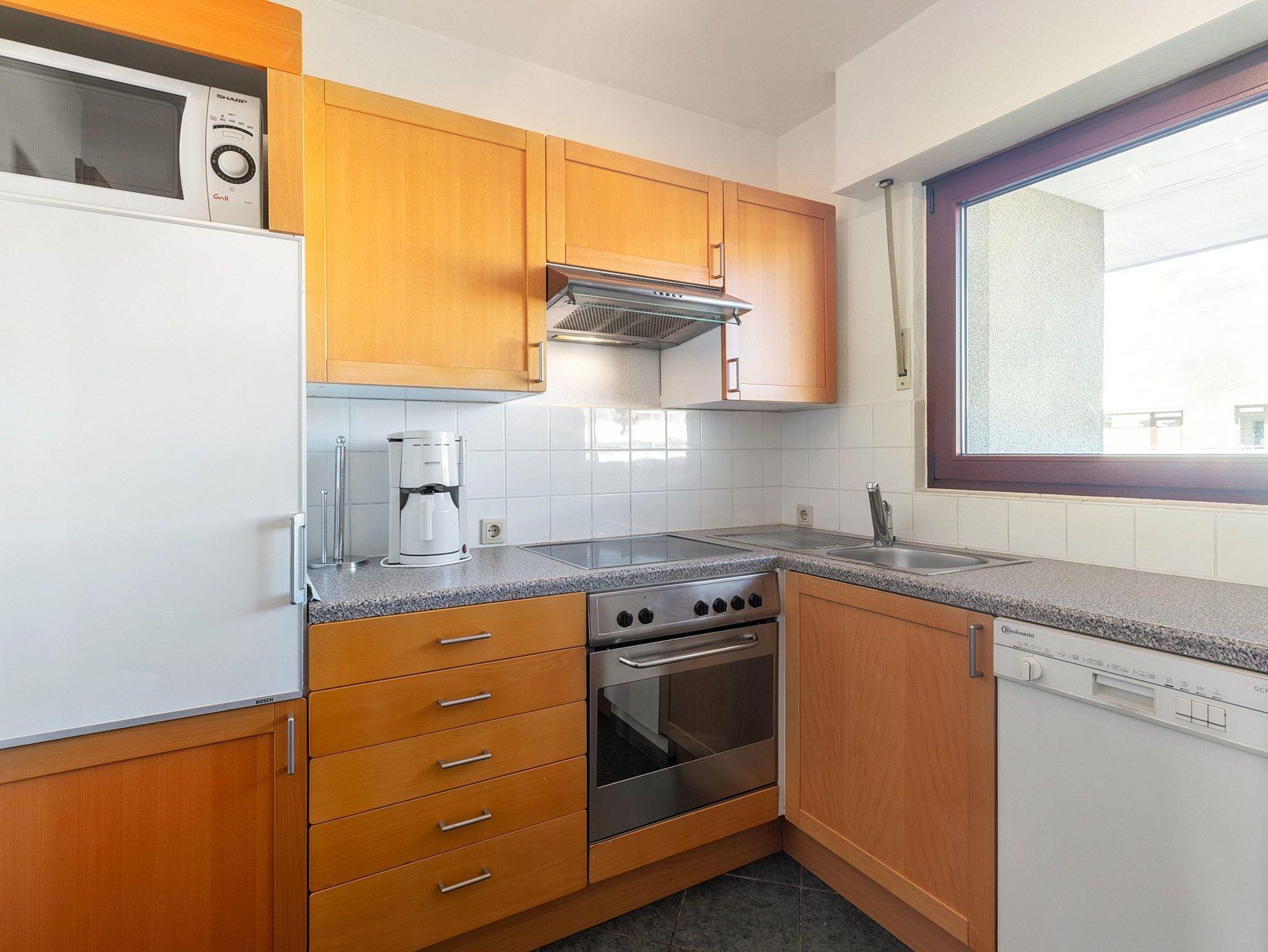 Moderne, separate, komplett ausgestattete Küche mit 4 Platten-Cerankochfeld, Backofen, Geschirrspülmaschine, Mikrowelle, Kühlschrank mit 3-Sterne Gefrierfach, Toaster, Kaffeemaschine, Wasserkocher und Eierkocher.