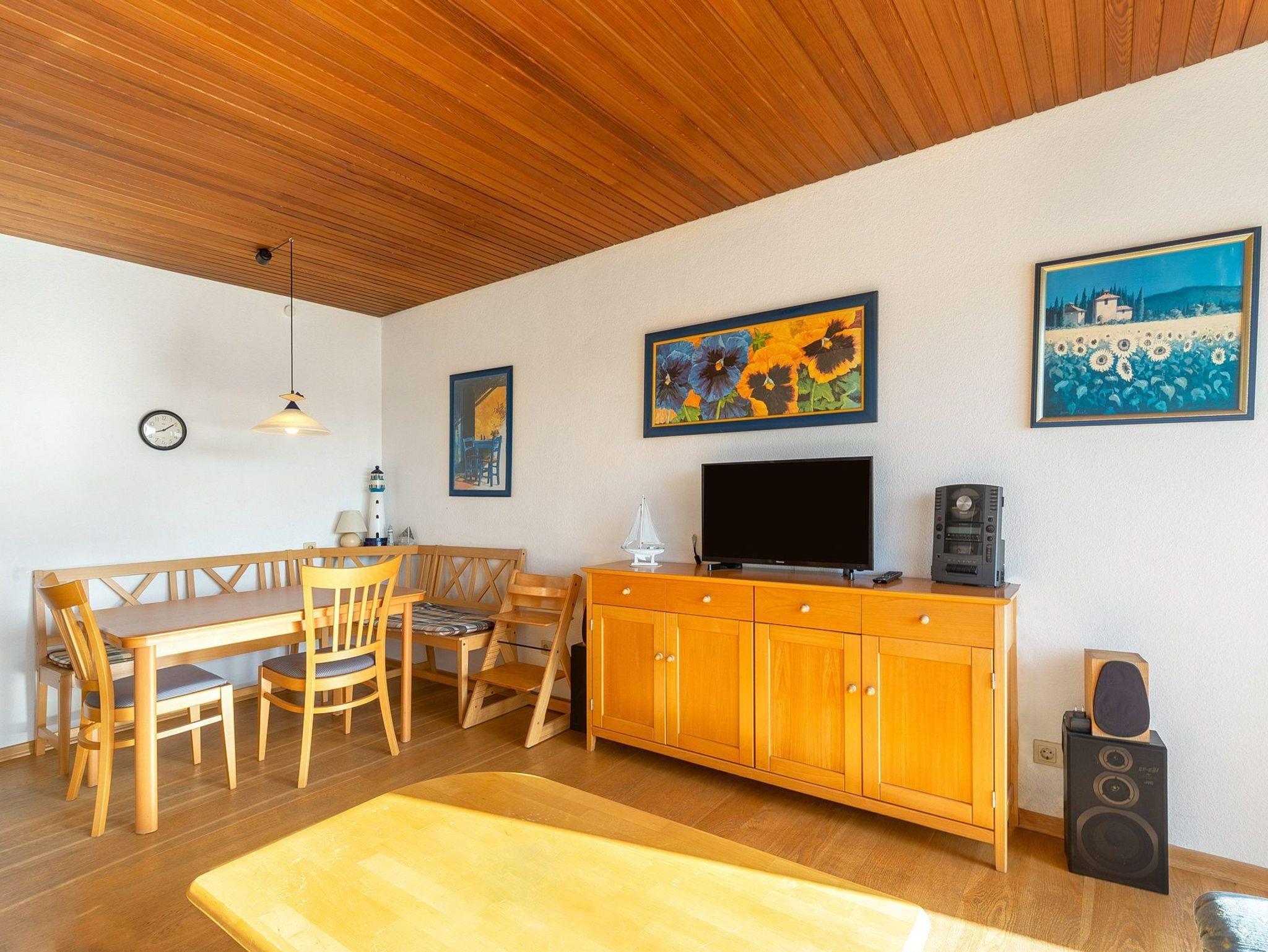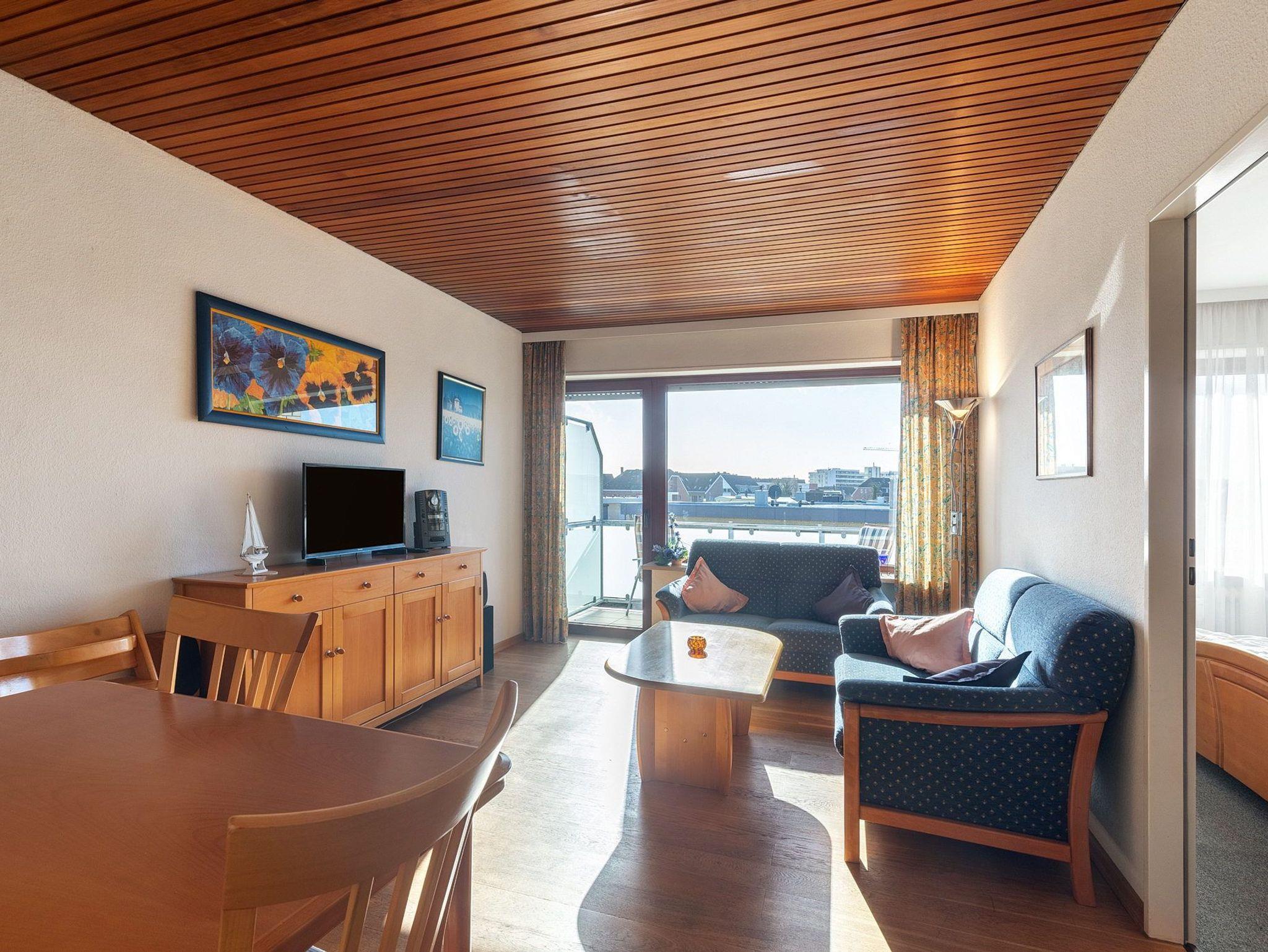 Freundliches Wohn- und Esszimmer mit direktem Zugang zum Balkon. Das Wohn- und Esszimmer ist mit einem Essplatz für 4 Personen, einer Kommode und 2 Couchen ausgestattet. Zur Unterhaltung stehen ein Fernseher und eine Mini-Stereoanlage mit CD-Player zur Verfügung. Das Wohn- und Esszimmer ist mit Parkett-Boden ausgelegt, das Fenster lässt sich durch ein Außenrollo vollständig verdunkeln.
