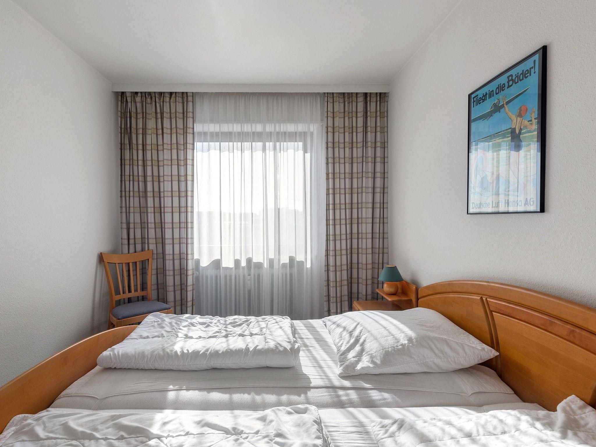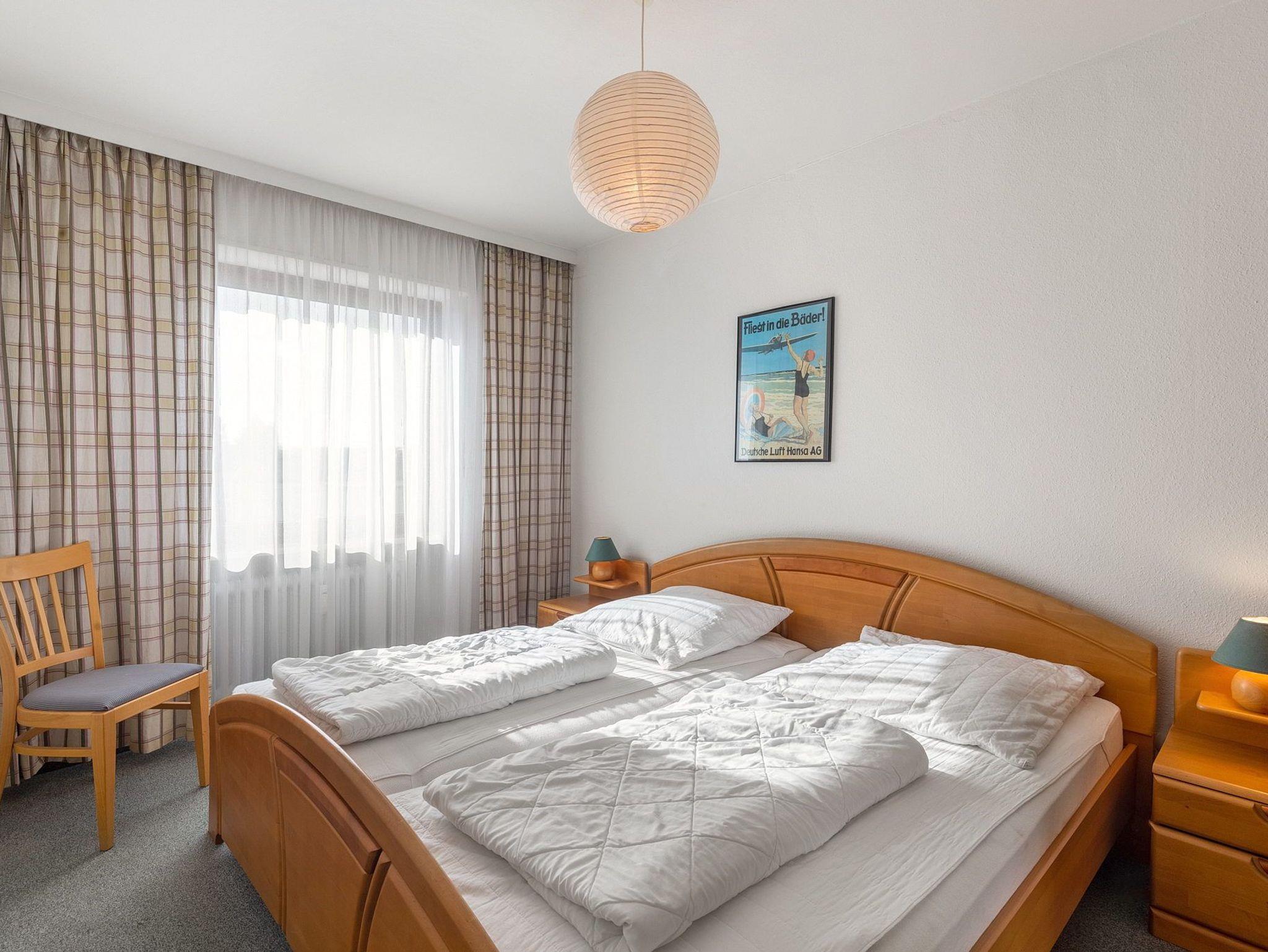 Das moderne Schlafzimmer ist mit einem Doppelbett (2x 100x200cm) und einem großen Kleiderschrank ausgestattet. Das Schlafzimmer ist mit Teppichboden ausgelegt. Das Fenster lässt sich durch ein Außenrollo vollständig verdunkeln.