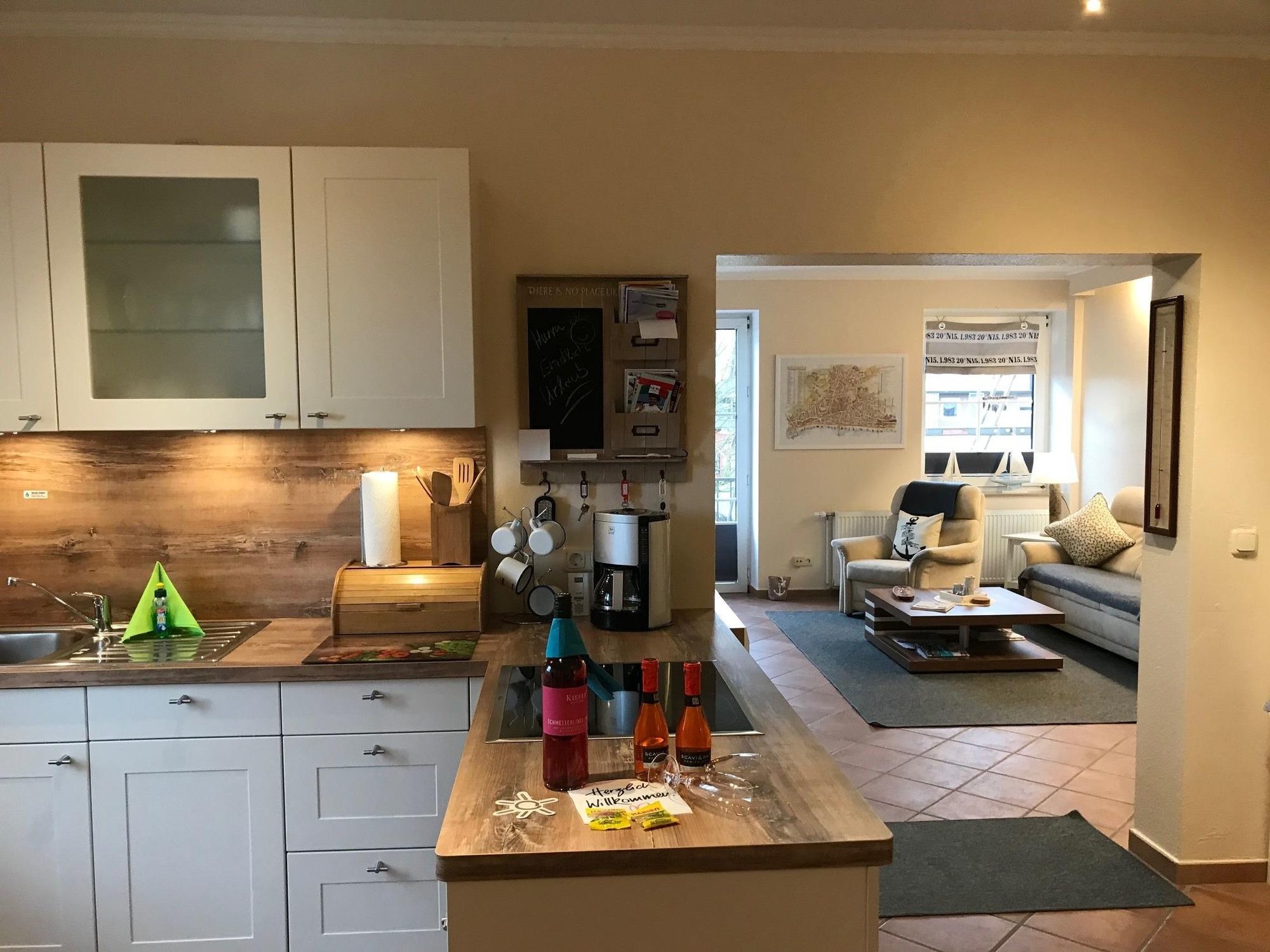 Die Wohnfläche der ca. 70m² großen Ferienwohnung verteilt sich auf ein großes helles Wohnzimmer mit offener Küchenzeile, ein separates Schlafzimmer mit großem Boxspringbett, ein weiteres Schlafzimmer mit 2 Einzelboxspringbetten, sowie auf ein Badezimmer mit begehbarer Dusche.