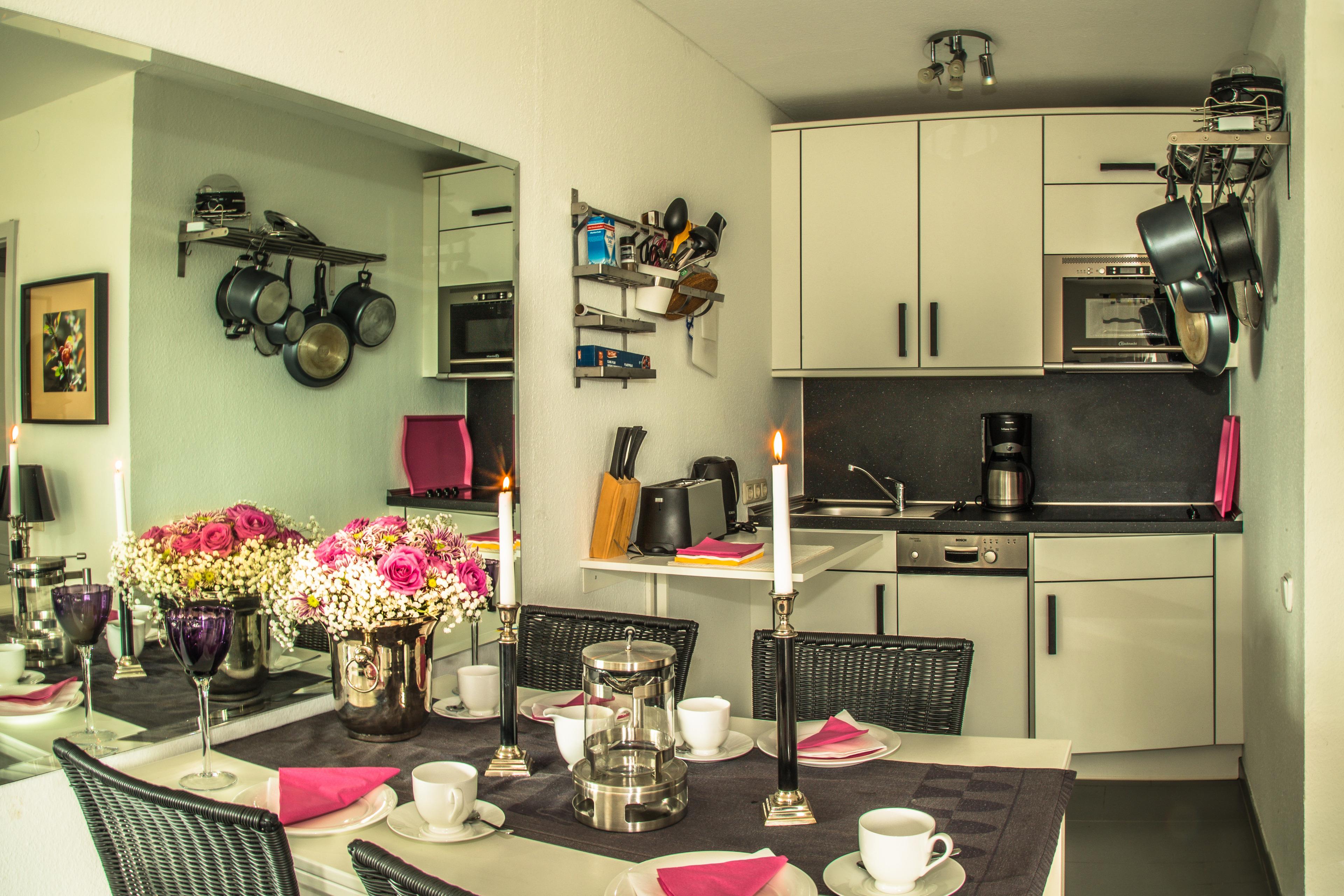 Der Wohnbereich ist mit einer gemütlichen Sitzecke (Schlaffunktion), einer offenen, kleinen Küchenzeile sowie mit einem Essplatz für 4 Personen versehen. Von hier aus gelangen Sie auf den möblierten Seeblick-Balkon. Die kleine Küchenzeile ist u.a. mit einem 4-er Induktionsplattenherd, einer Mikrowelle, einer kleinen Geschirrspülmaschine, einer Kaffee- plus einer Nespresso-Maschine, einem Toaster, Eier- und Wasserkocher ausgestattet. Ein 42" Sony Flachbild-TV mit BluRay-Player (auch DVD) sowie ein Internet- Radio mit WLAN-Anbindung etc. sind vorhanden. Das Fernsehangebot beinhaltet Magenta TV mit den Modulen Mega Sport Fußball Bundesliga/Champions League, Sport und HD, dazu über Apple-TV Zugang zu WOW Sport Paket, Amazon Prime und Netflix sowie Apple Music, Apple TV. Das separate Schlafzimmer ist mit einem Doppelbett mit Taschenfederkernmatrazen versehen. Das Bad verfügt über eine Badewanne (mit Duschmöglichkeit), Waschbecken und WC. Das Schlafzimmer ist verdunkelbar.