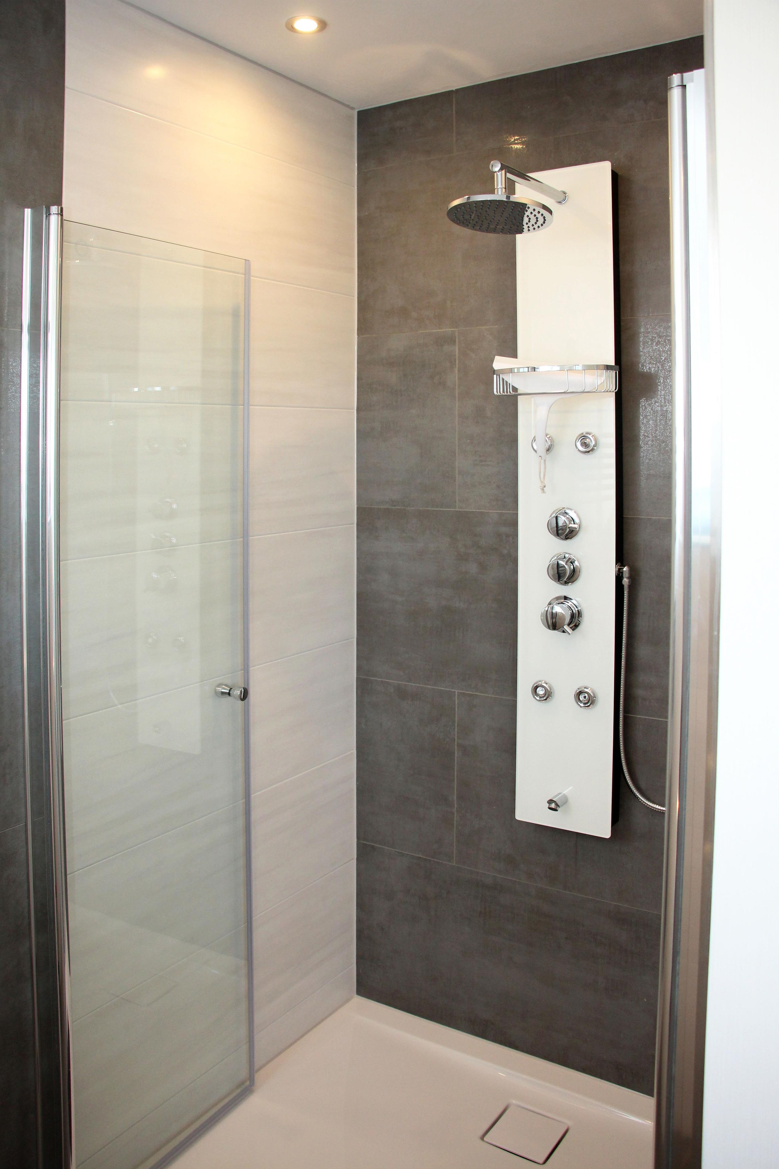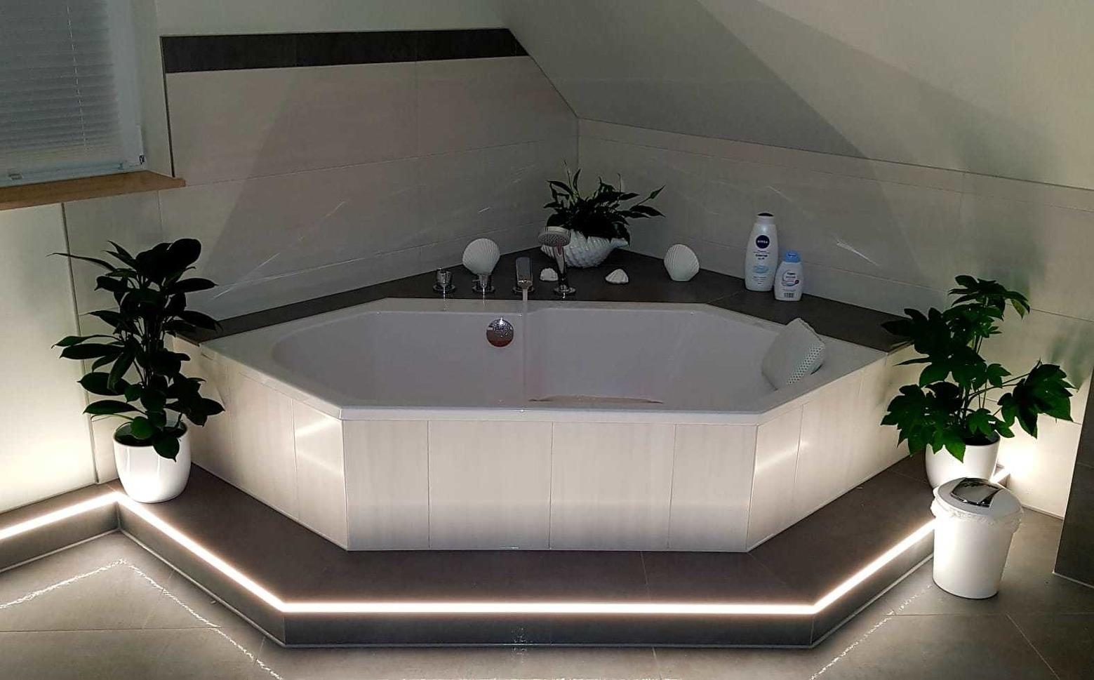 Das Bad lädt gerade im Winter zum Relaxen und Wohlfühlen ein, denn es ist ausgestattet mit einer 1,00 x 1,20 m großen, ebenerdigen Dusche mit Duschpaneel sowie einer Eckbadewanne mit beleuchteter Stufe.