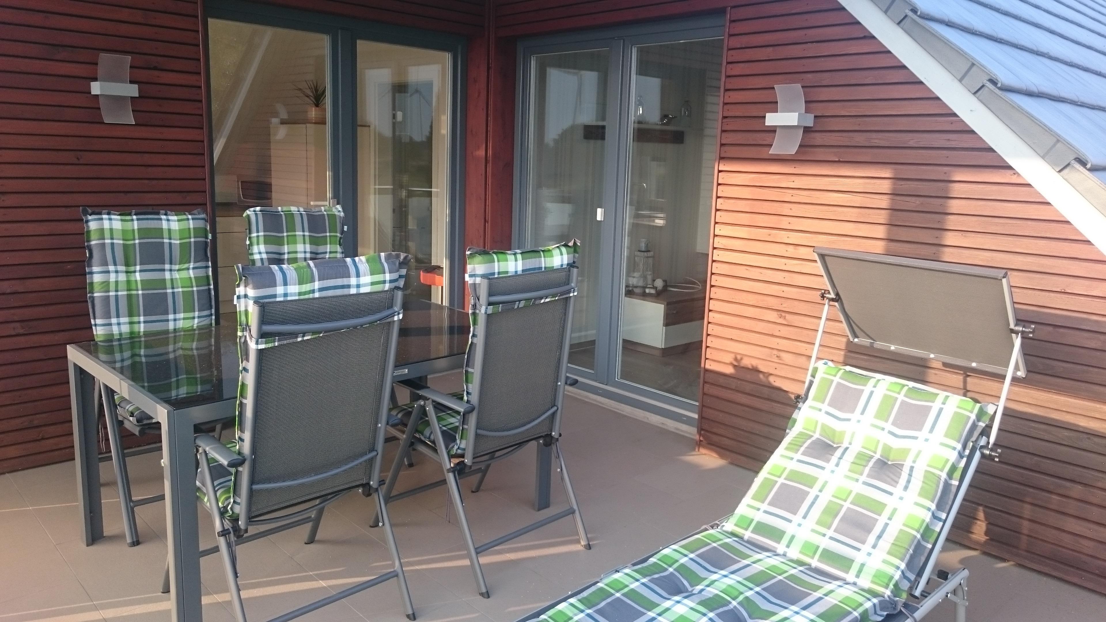 Ein Grill, ein Tisch mit verstellbaren Hochlehnern sowie 2 Sonnenliegen stehen hier für Sie bereit.